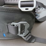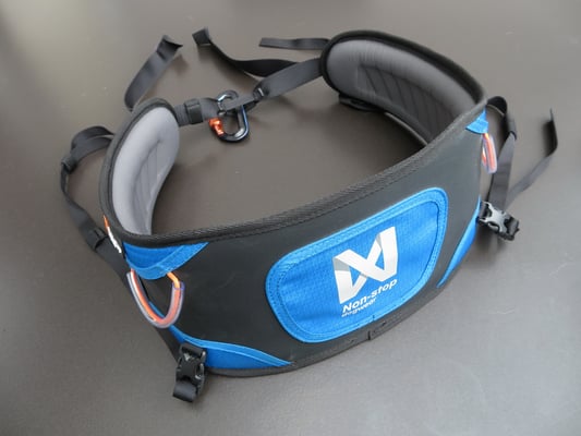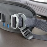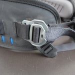 Ein besonderes Augenmerk verdient der im ersten Moment seltsam anmutende doppelseitig angebrachte Verschluss mit je zwei Metallösen. Hier erwartet man eigentlich die bekannten Klick- oder Schnappverschlüsse aus Kunststoff, die in meinem Augen aber völlig ungeeignet wären, wenn man bedenkt, welche Kräfte hier beim Zug auf die Verschlüsse wirken. Zudem verriegeln die Metallverschlüsse unter Zug, so dass ein Öffnen der Verschlüsse nicht möglich ist, außer bei Materialversagen. Trotzdem öffnen sie sich auch bei nachlassendem Zug nicht plötzlich, da man den Gurt über die Verschlussbänder sehr fest und eng an den Körper ziehen kann. Das verwendete Metall könnte aus dem Flugzeugbau bzw. der Fallschirmsprungtechnik stammen. Es ist hochfest und dabei sehr leicht. Nach zwei, dreimal Anlegen und Abnehmen hat man die Verwendung des Verschlusses raus und meine anfängliche Skepsis über die Praxistauglichkeit war und ist völlig unbegründet. Ich finde den Verschluss mit Blick auf die Verwendung unter Zug, extrem praktisch und überlegt.