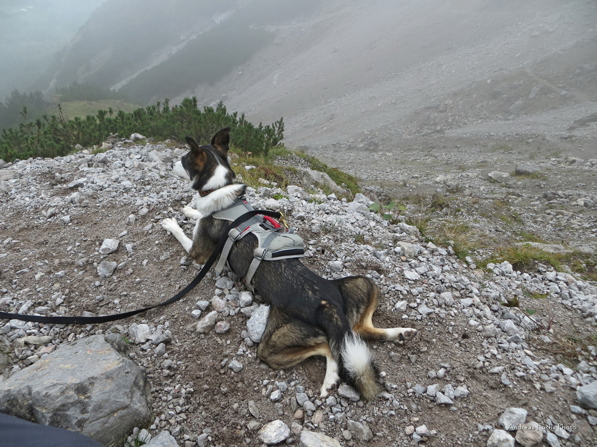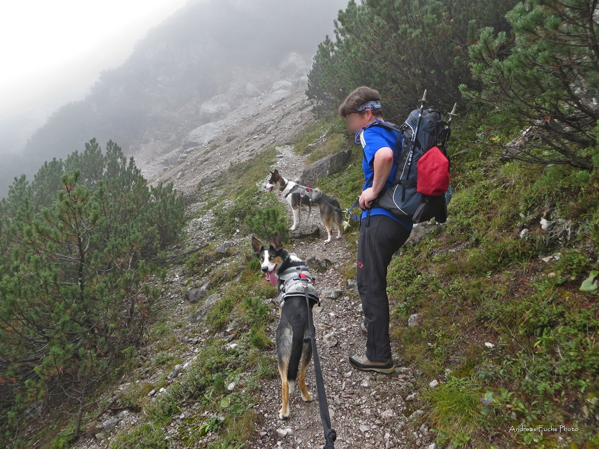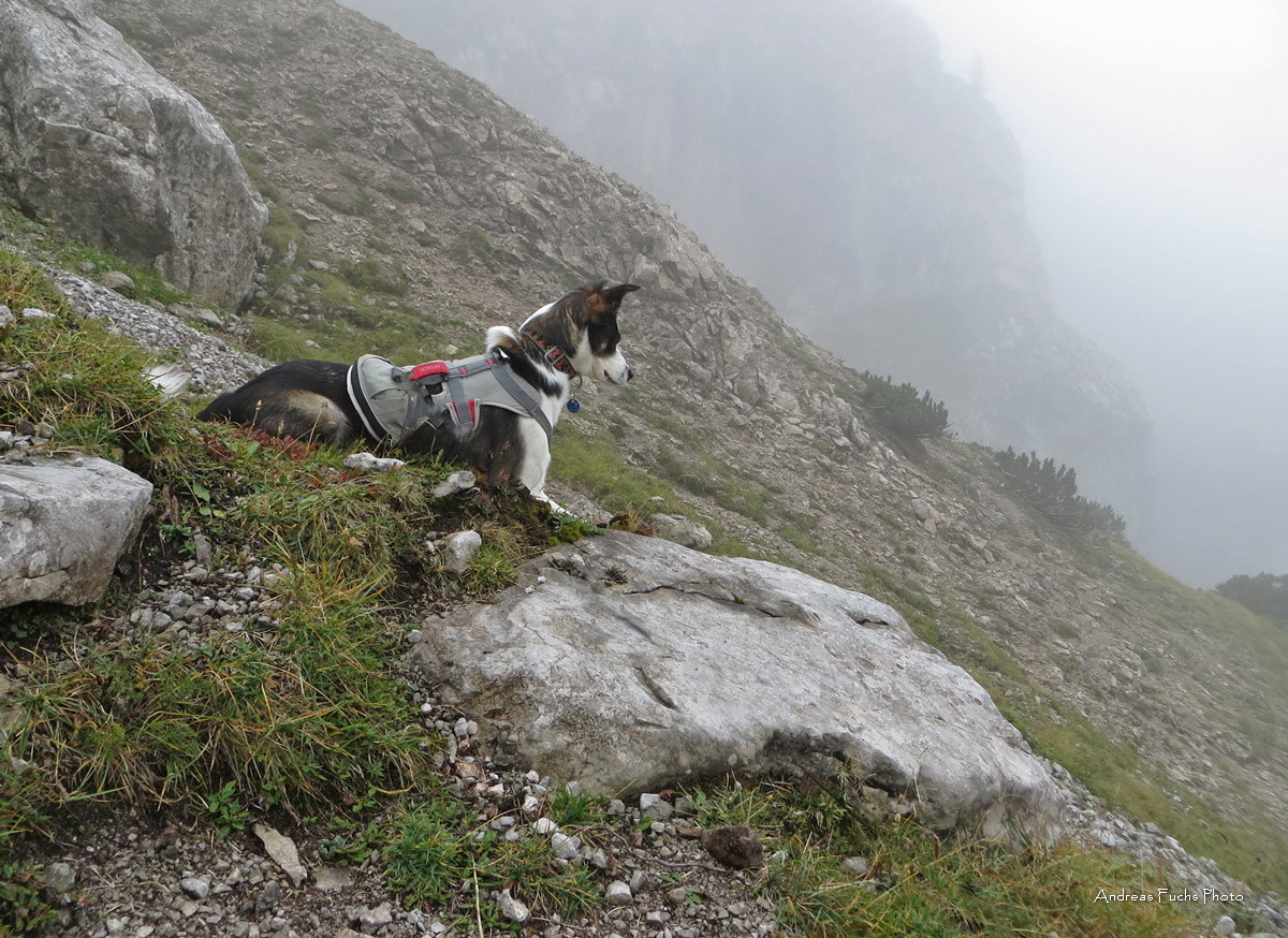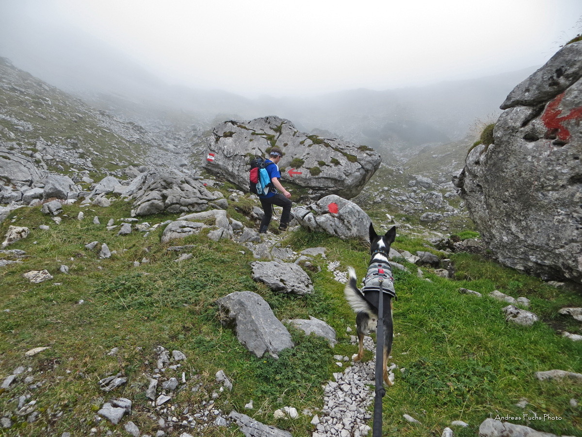 Leider hatten wir einen sehr neblig-wolkigen Tag erwischt, die Wolkenuntergrenze lag so um die 1.800 bis 2.000 m, so dass die Aussicht zwar begrenzt, aber das Wandern auf der nach Süden augerichteten Strecke, sehr angenehm kühl war. Leider hatte dies auch einen teilweise Ausfall des GPS-Signals zur Folge, was man an der sehr geraden Wegspur auf der Karte sehen kann.