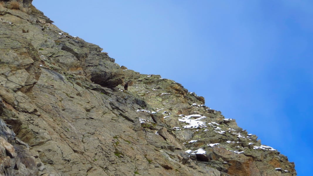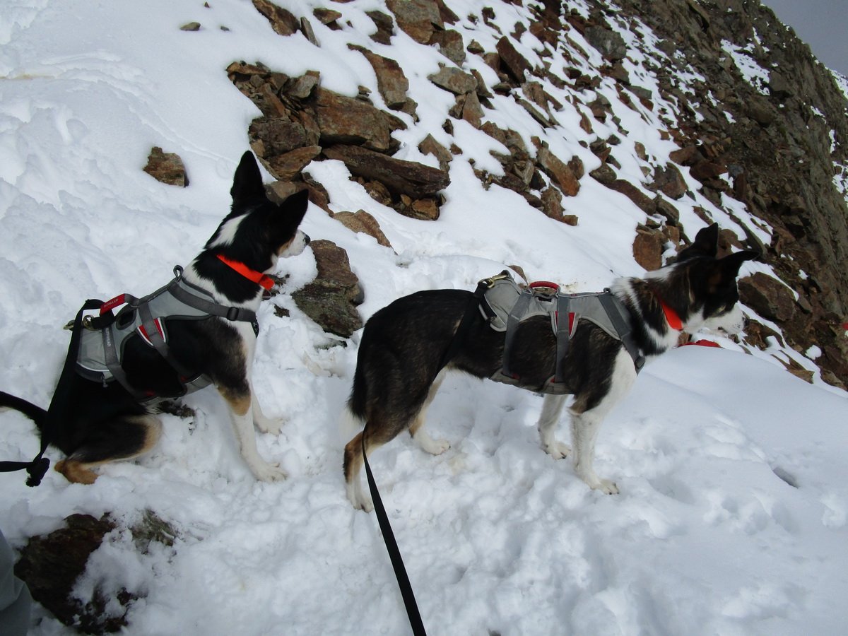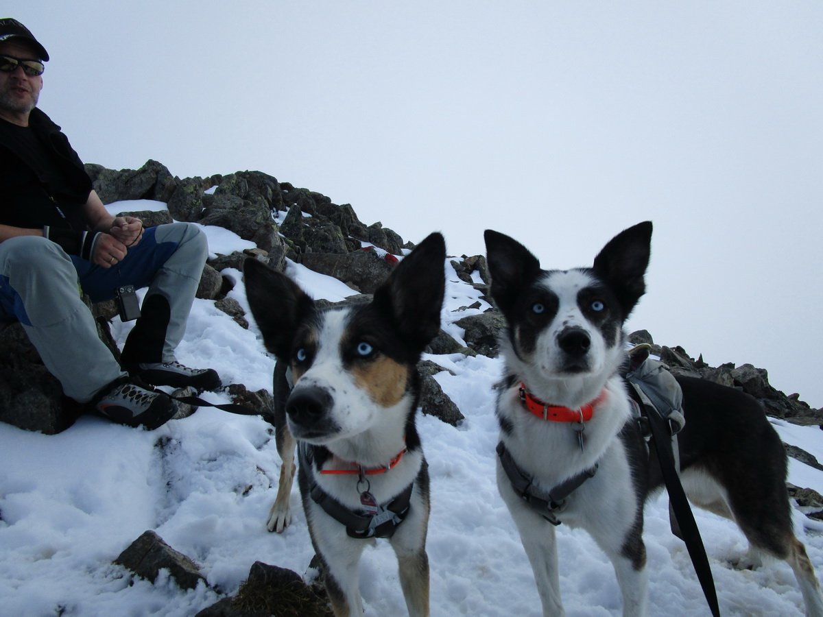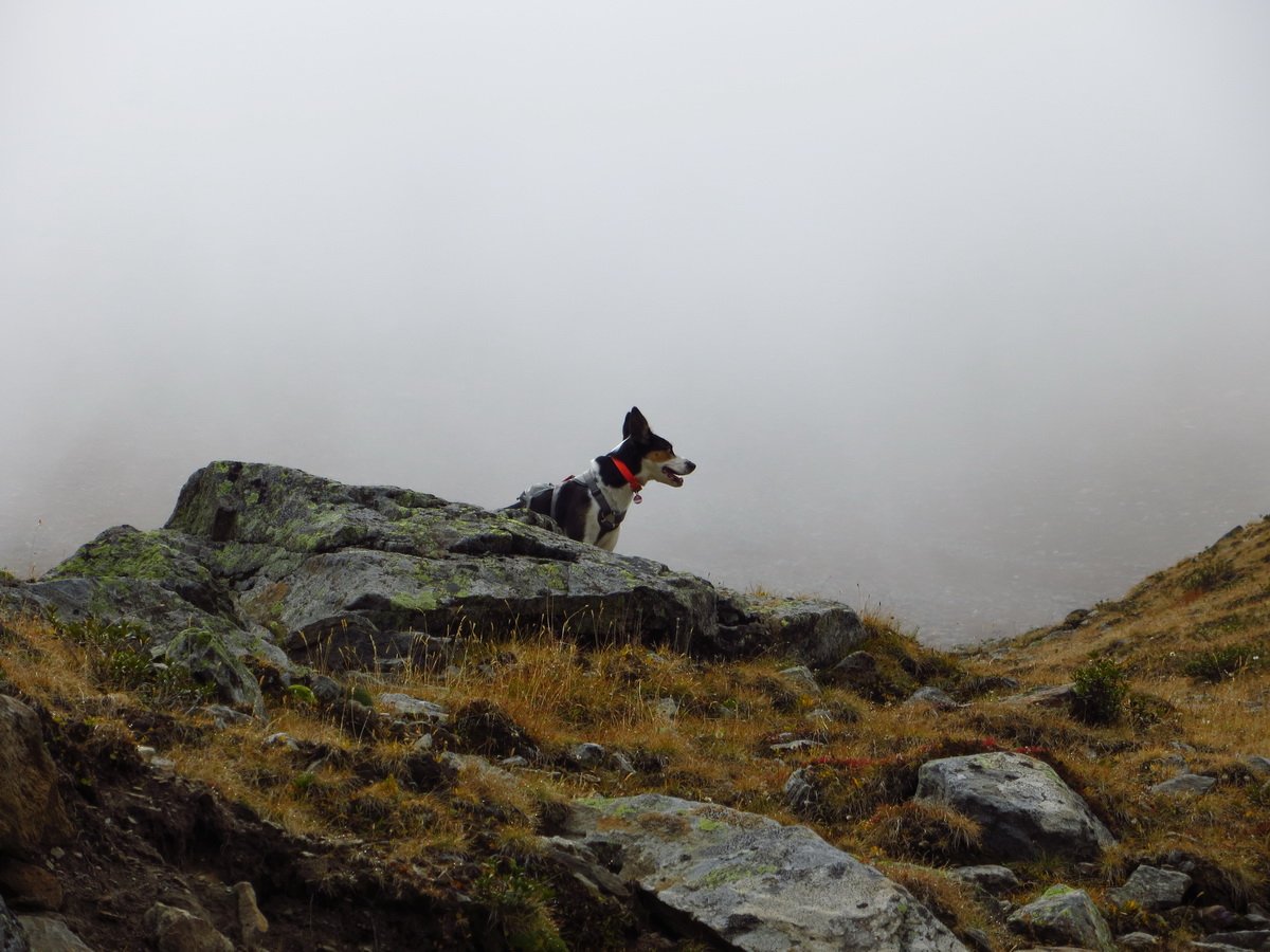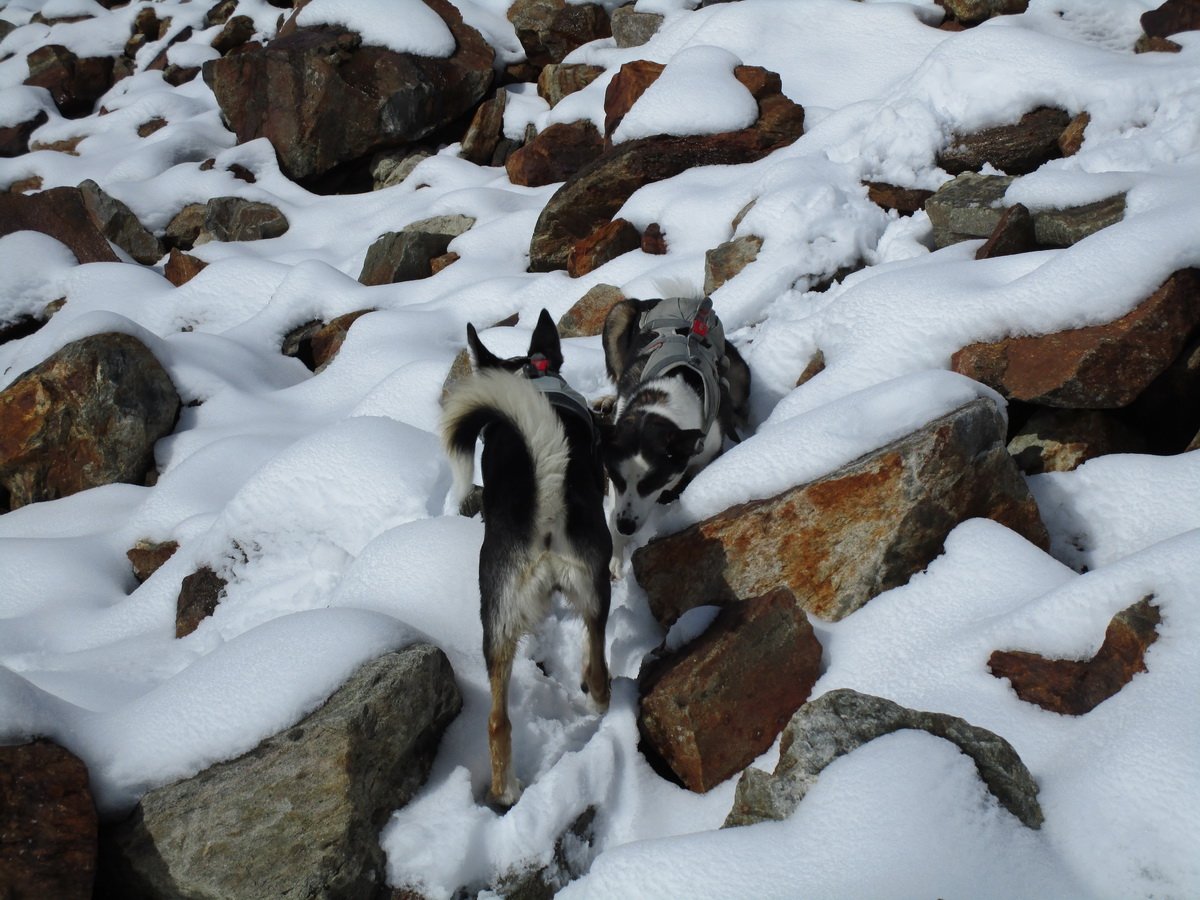 Die Doggies konnten die gesamte Tour im Freilauf bewältigen. Murmeltiere und Gemsen waren weit genug entfernt und zum Teil auch nur zu hören. Lediglich am Gipfel, der an einer Seite mehrere hundert Meter tief abfällt, haben wir sie an die Sicherungsleine genommen.