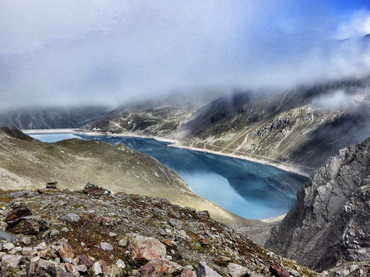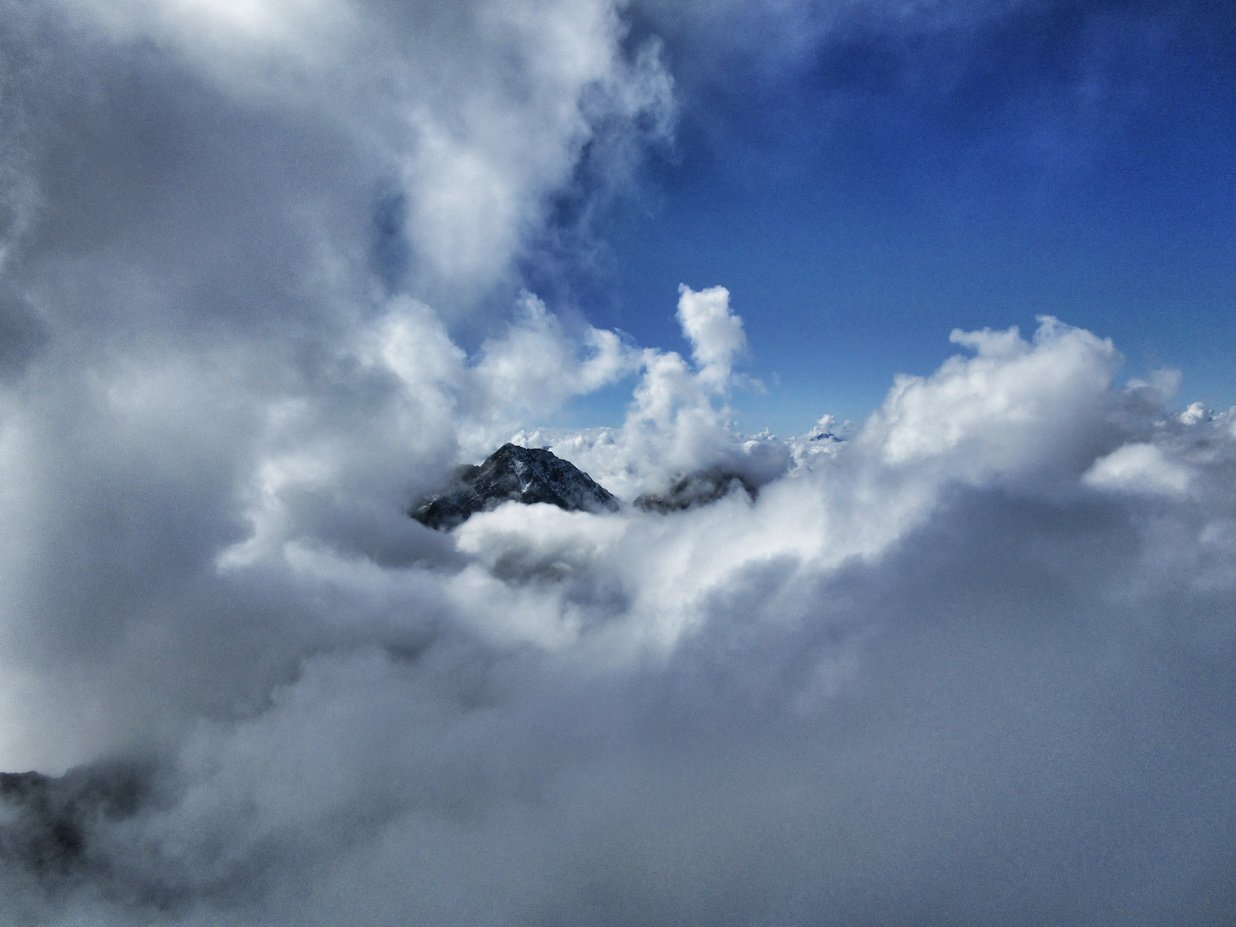 Die Tage zuvor waren zwar regnerisch und wolkig, aber wir dachten bei weiter aufklarender Wetterlage und 3000 m Höhe über den Wolken zu sein. Leider falsch gedacht, so wurden wir nicht mit einem atemberaubenden Panorama belohnt. Dennoch waren die aus den Wolken schauenden Gipfel ein Foto wert.