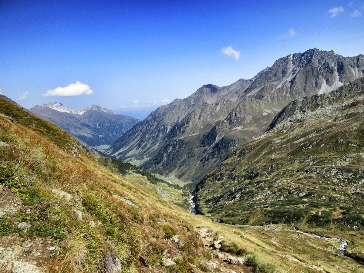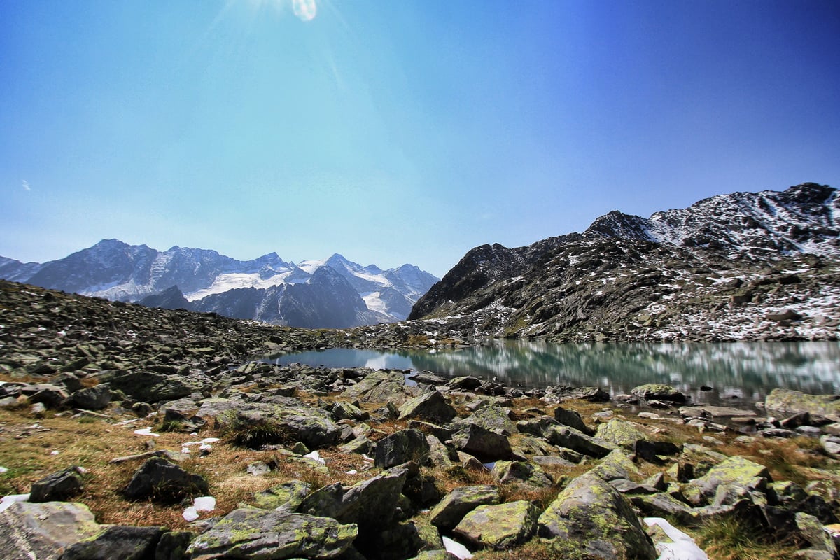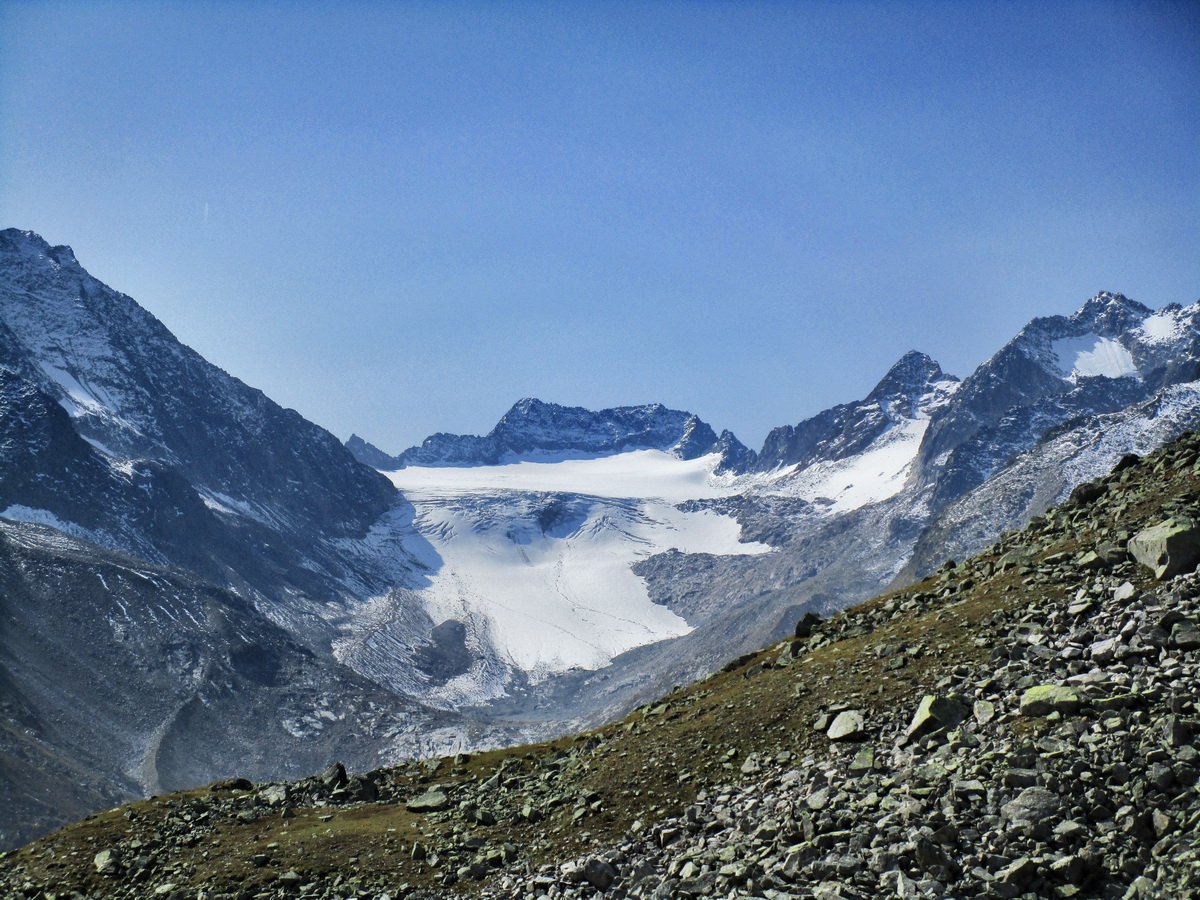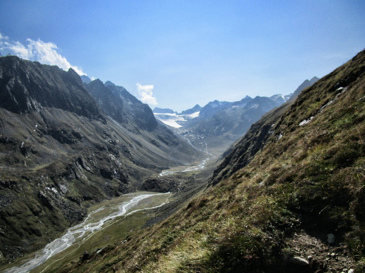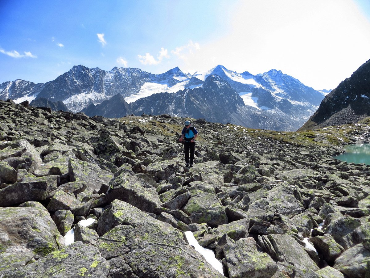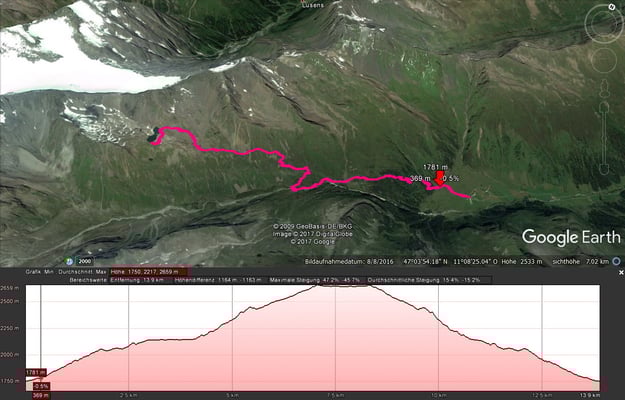 Die gesamte Wegzeit (Hin- und Rückweg) betrug 4.19 Stunden, der Weg ist gut 19 km lang. Es wurden dabei 1.196 hm (+) überwunden und die maximale Steigung betrug 47,2 %. Kurz vor dem See geht der Weg dann in Blockkletterei über. Unterwegs hat man einen guten Blick auf den Alpeinerferner.