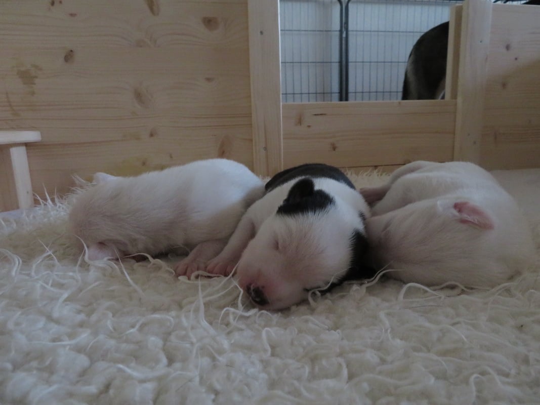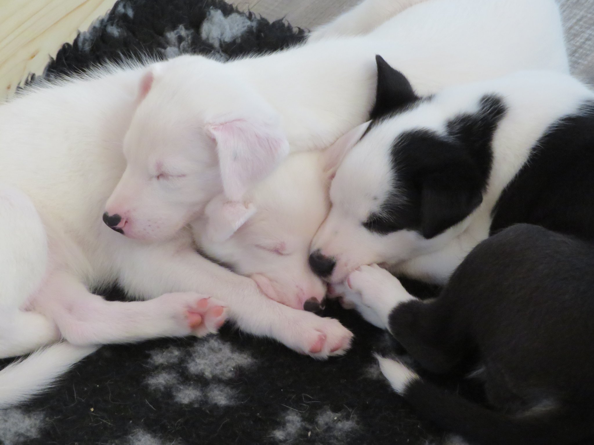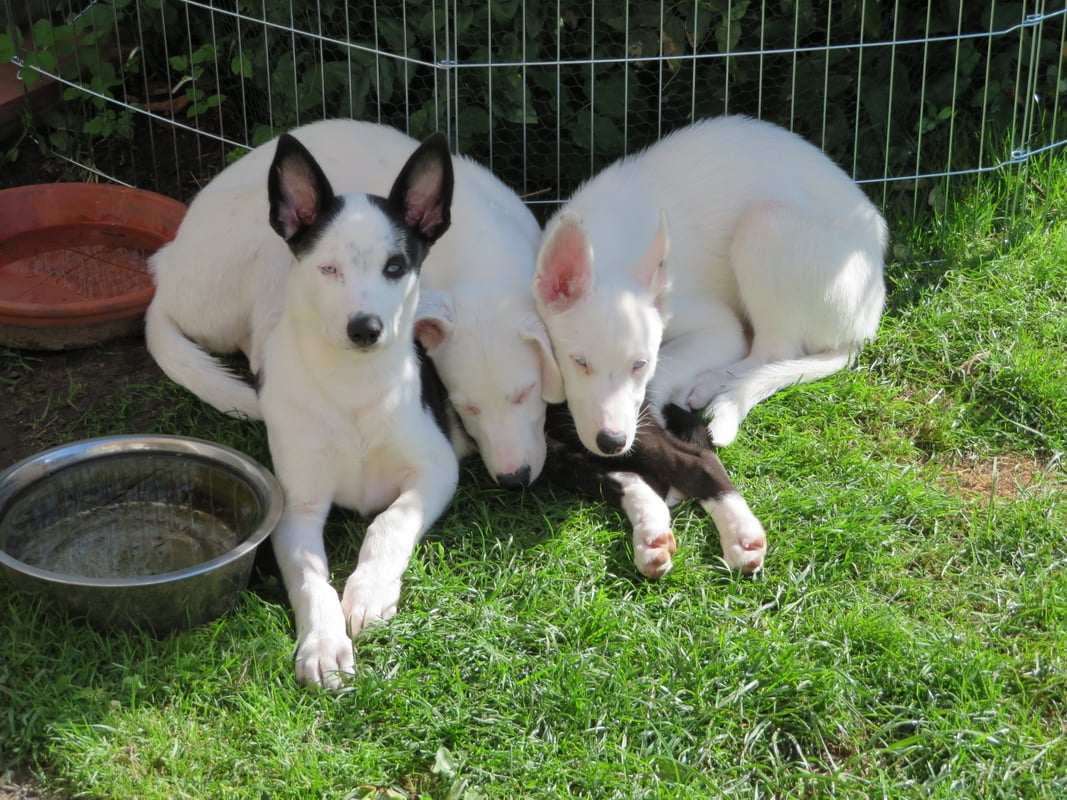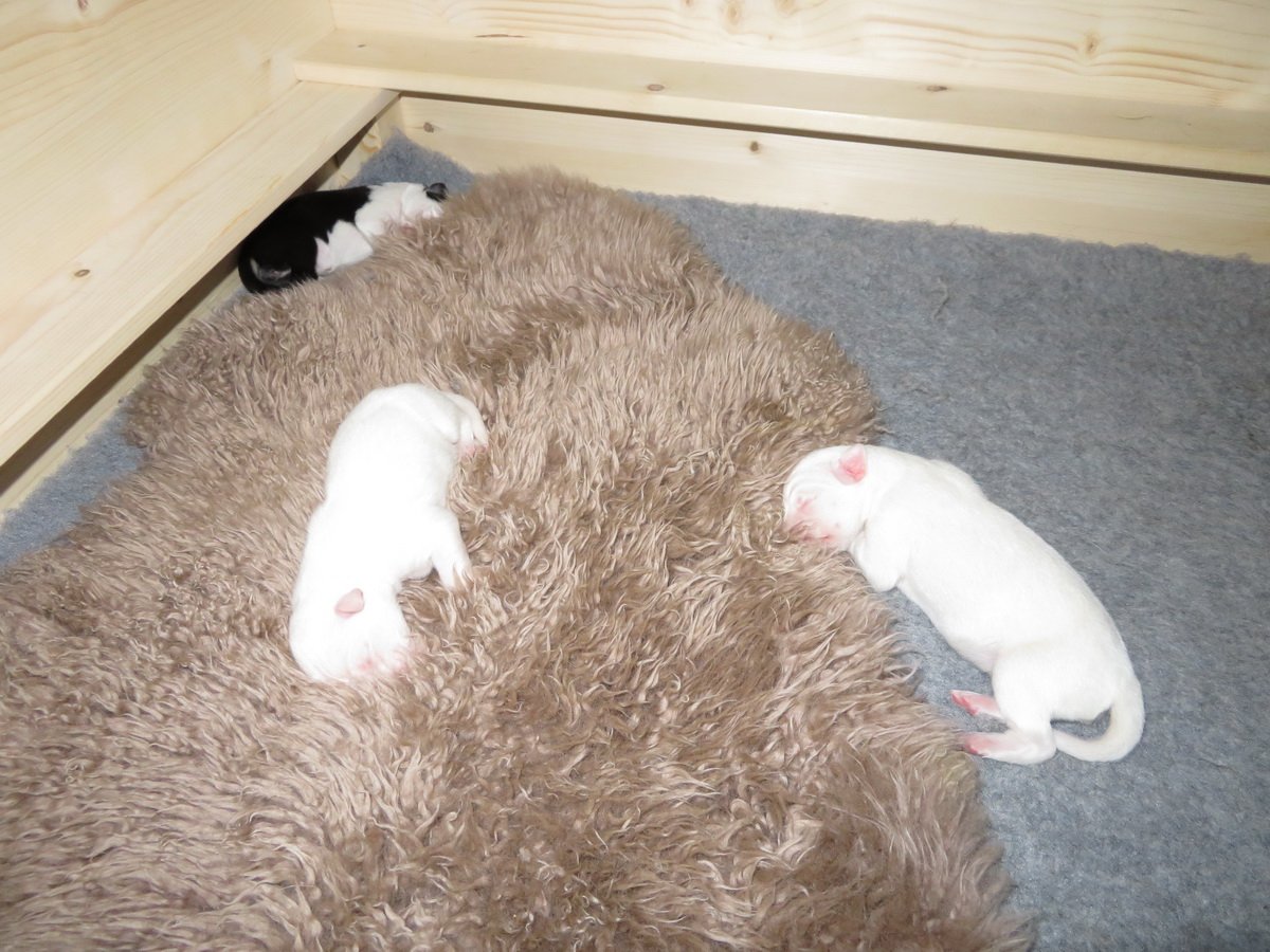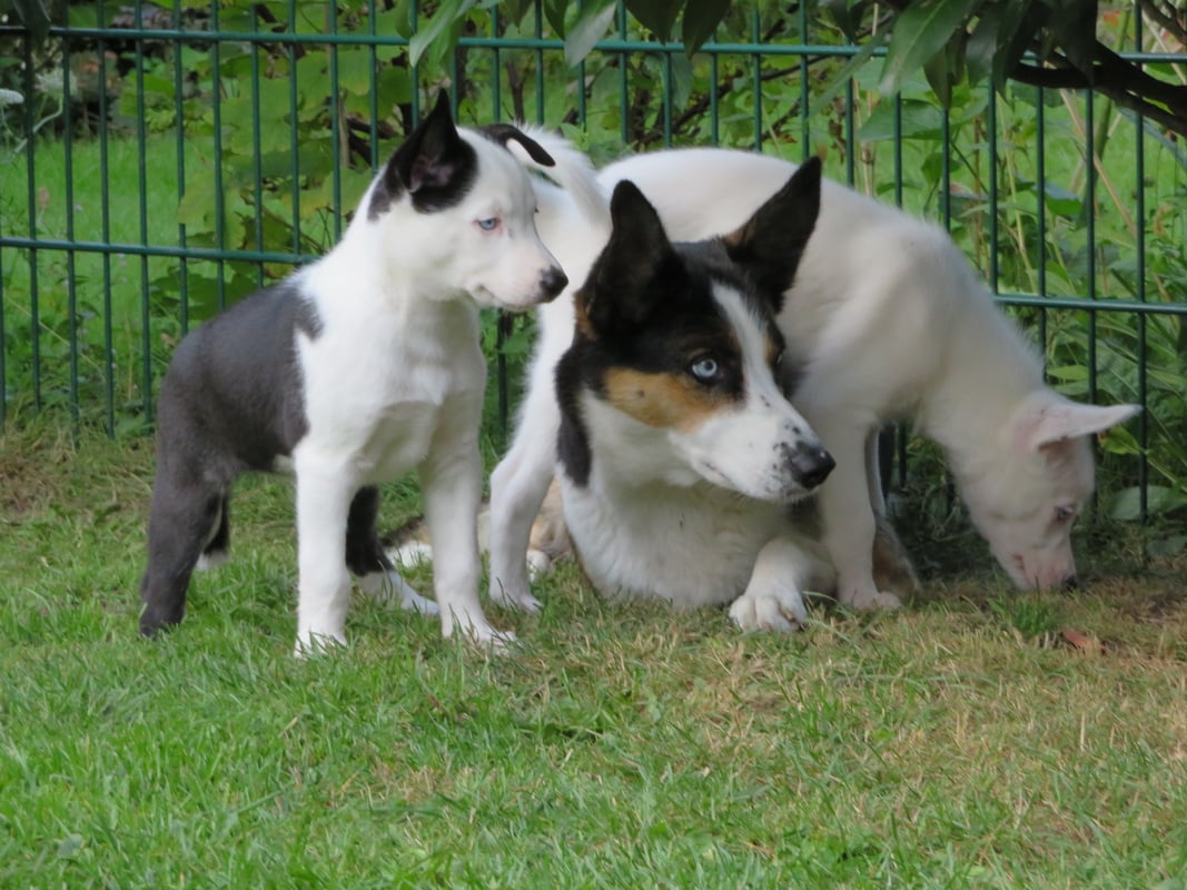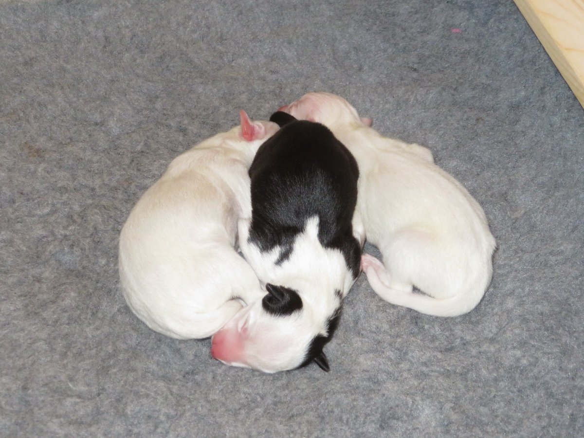 So ist Ayla jetzt stolze Mama von insgesamt drei zucksersüßen Welpen. Frosty, die weiße Hündin, Arik, der weiße Rüde, und Smacks, die schwarzweiße Hündin, die wegen des schwarzen Fells um das linke Auge auch die "Piratenbraut" genannt wird.