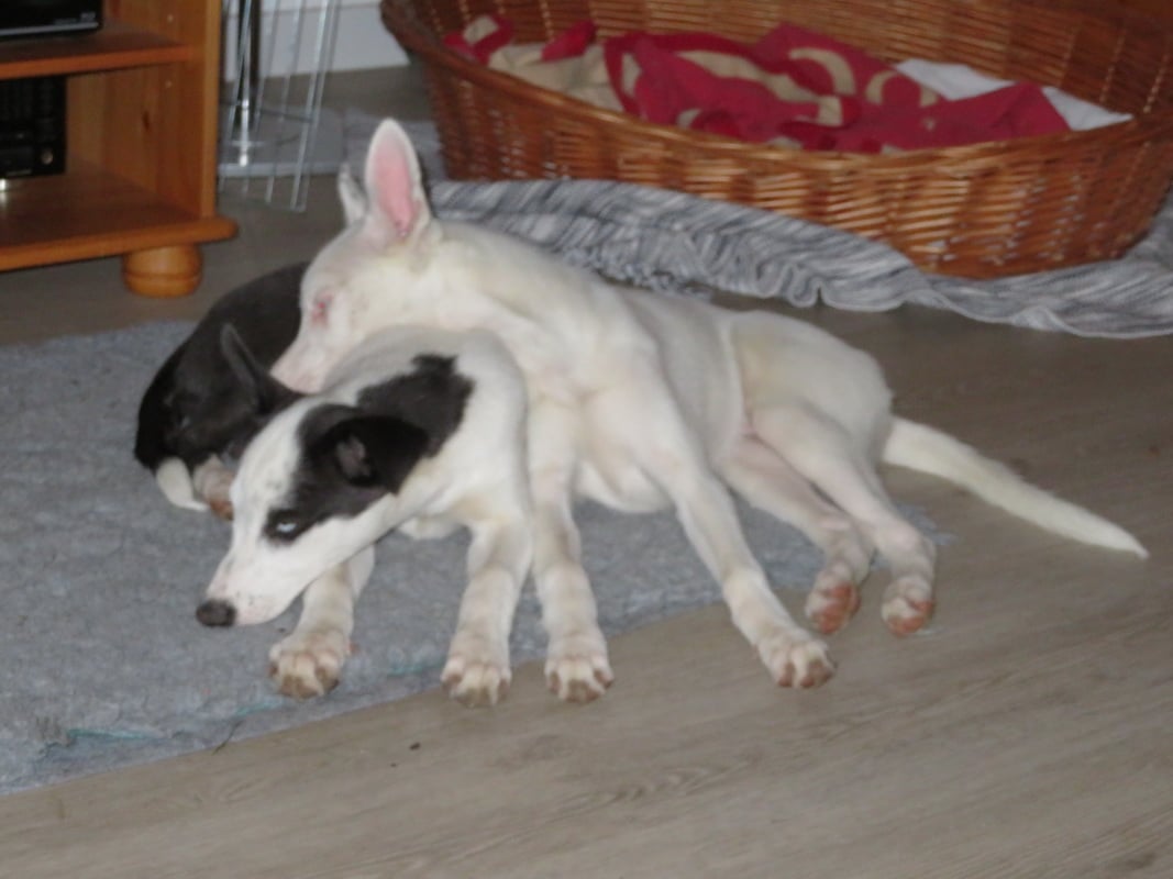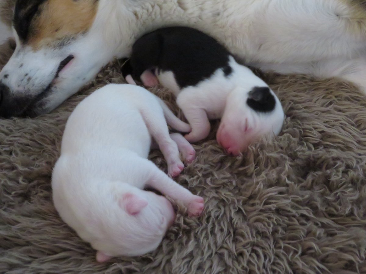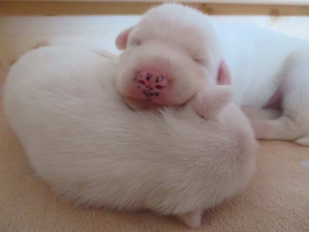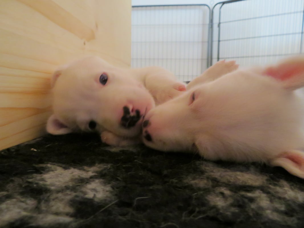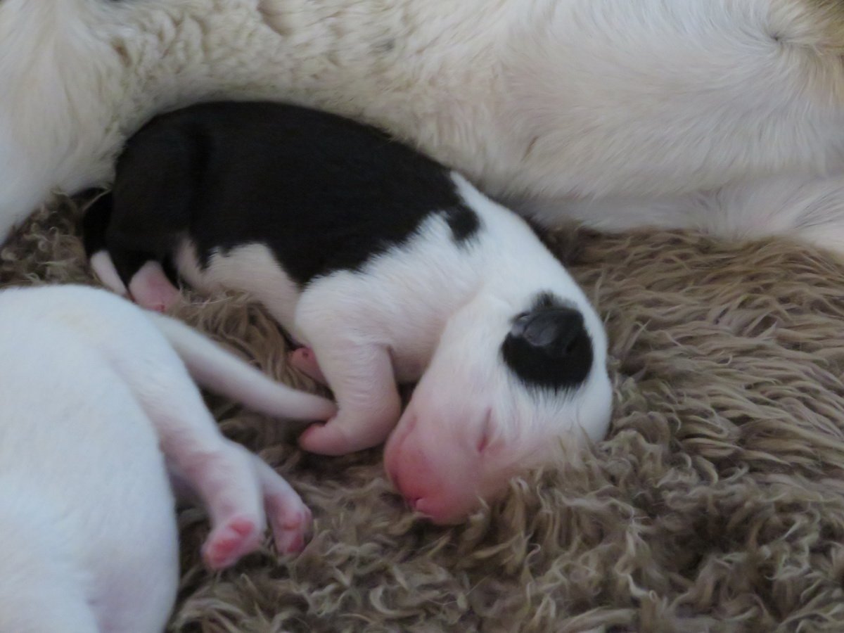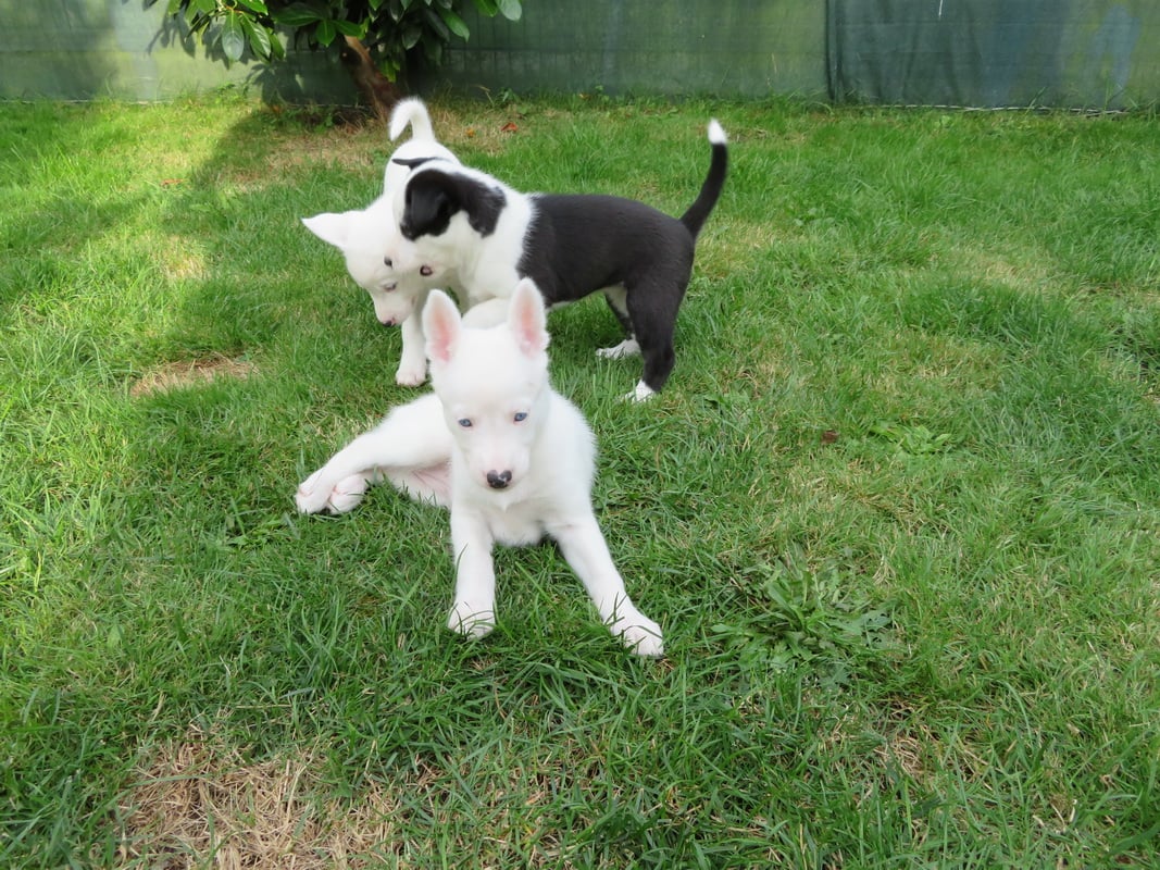 So ist Ayla jetzt stolze Mama von insgesamt drei zucksersüßen Welpen. Frosty, die weiße Hündin, Arik, der weiße Rüde, und Smacks, die schwarzweiße Hündin, die wegen des schwarzen Fells um das linke Auge auch die "Piratenbraut" genannt wird.