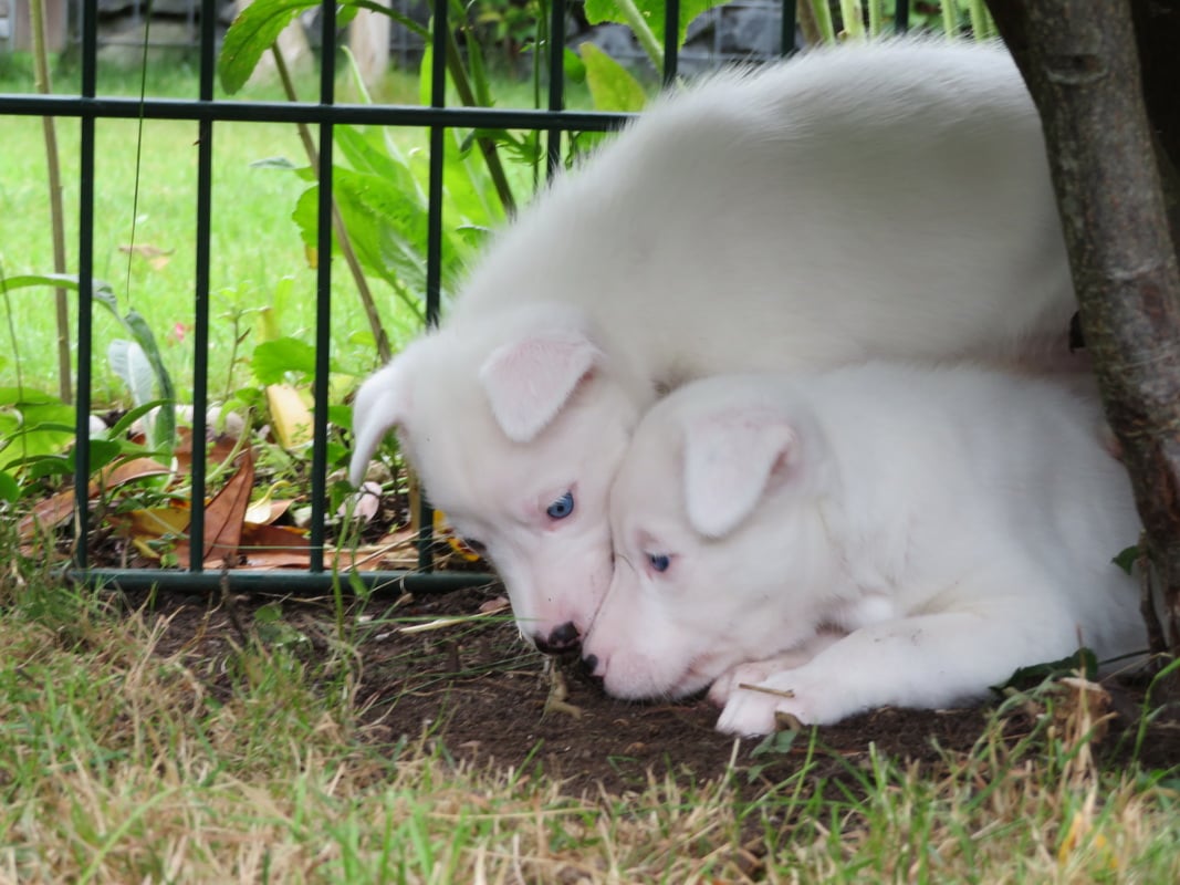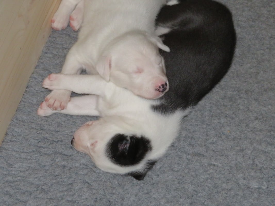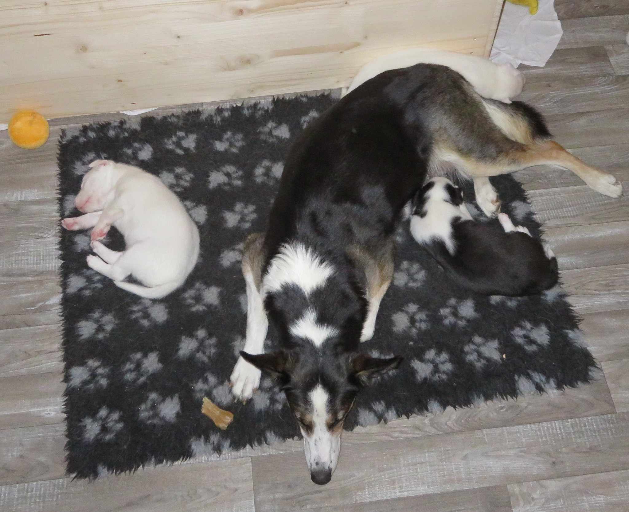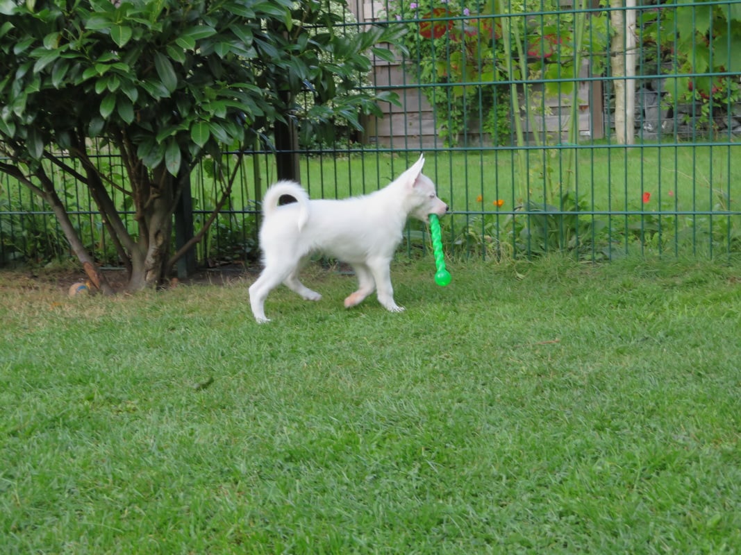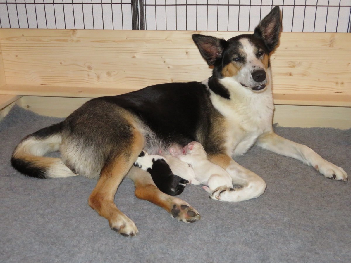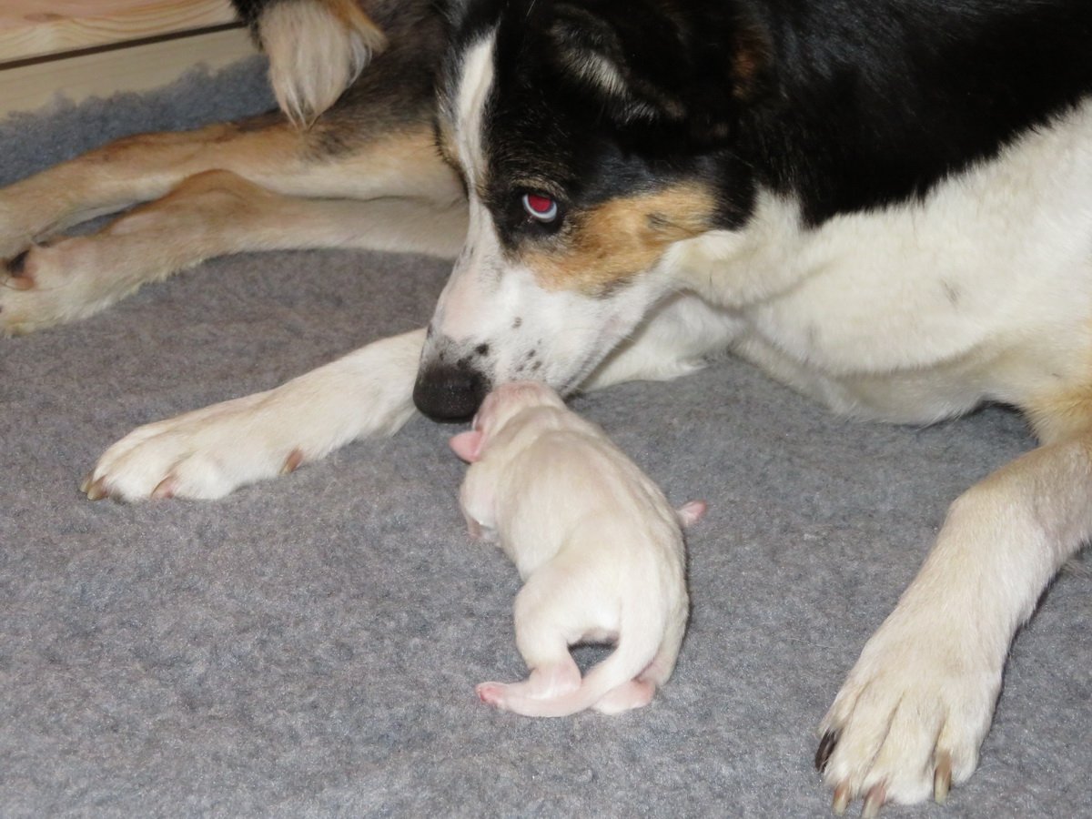 So ist Ayla jetzt stolze Mama von insgesamt drei zucksersüßen Welpen. Frosty, die weiße Hündin, Arik, der weiße Rüde, und Smacks, die schwarzweiße Hündin, die wegen des schwarzen Fells um das linke Auge auch die "Piratenbraut" genannt wird.