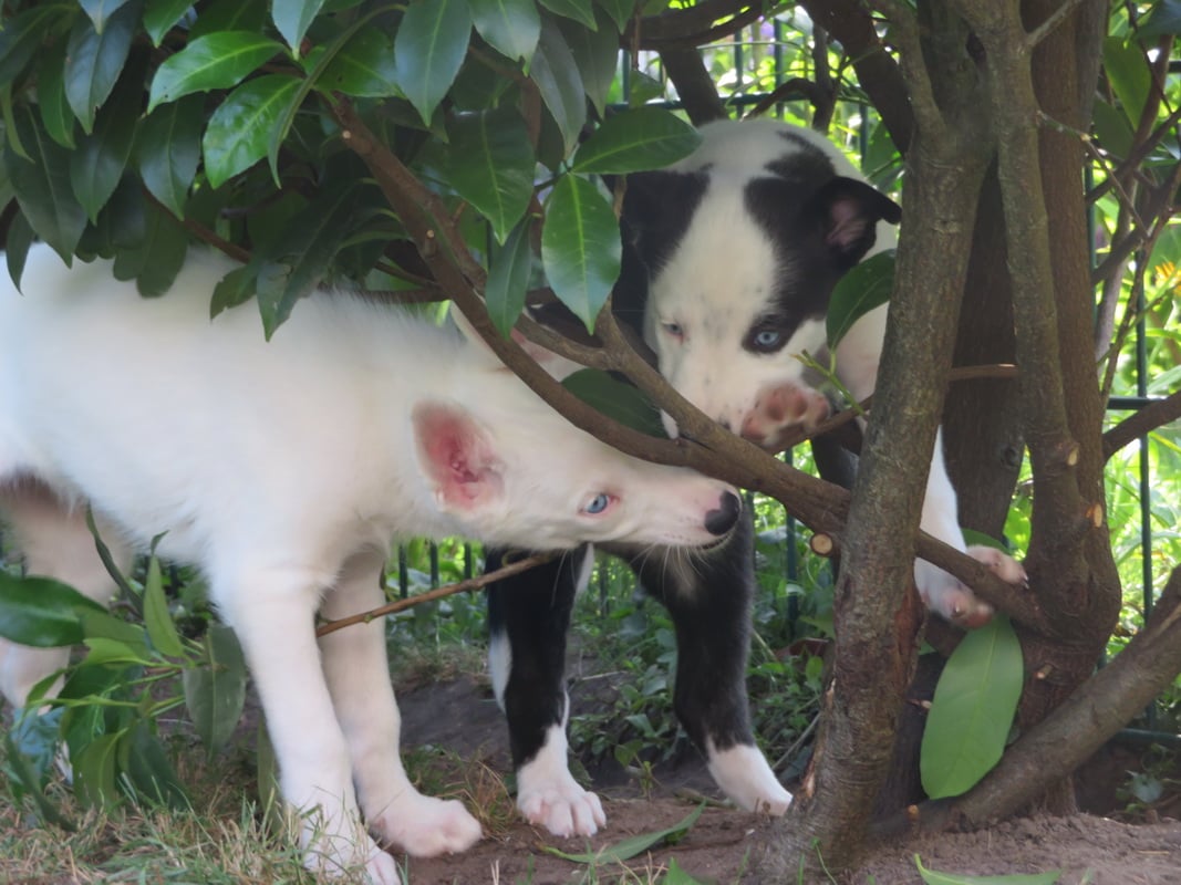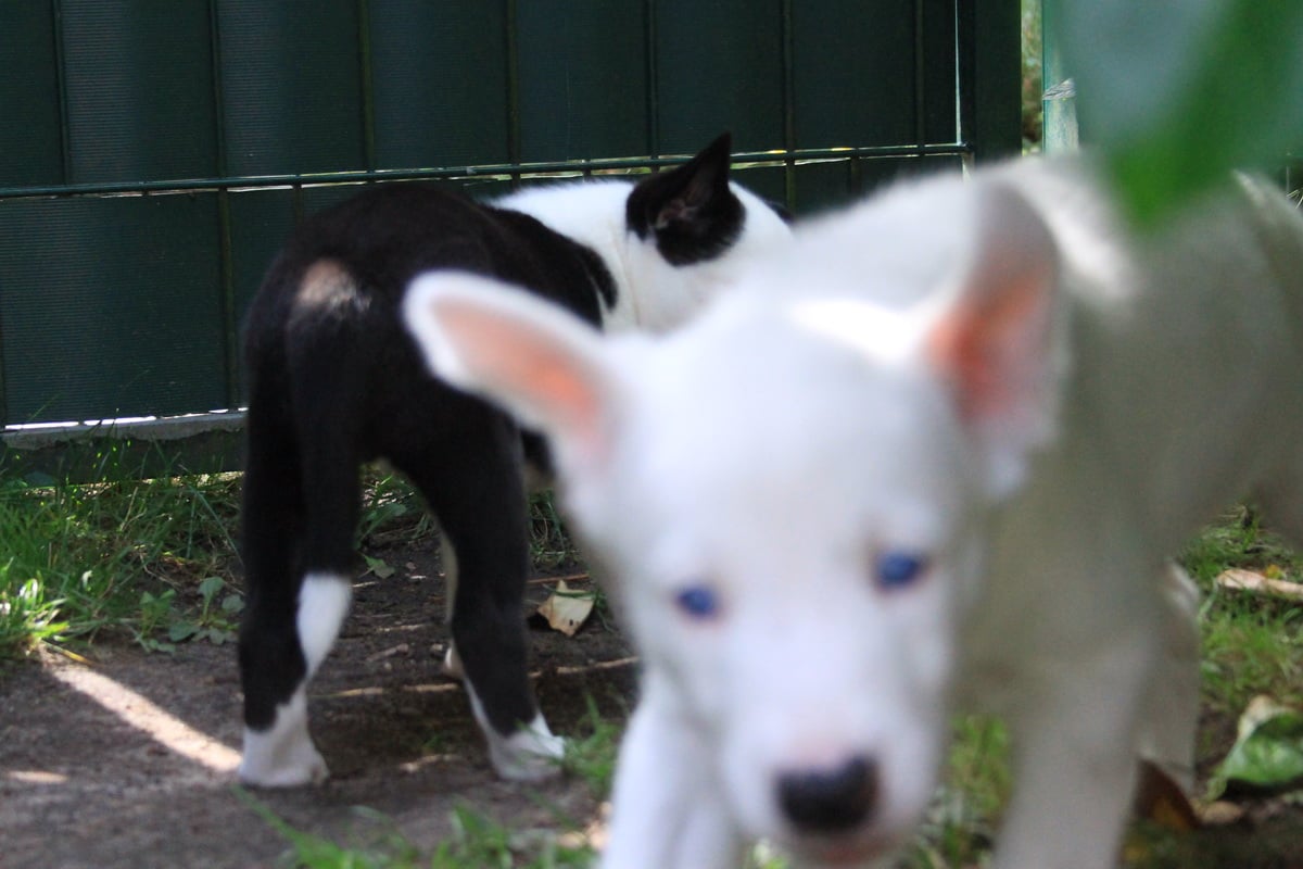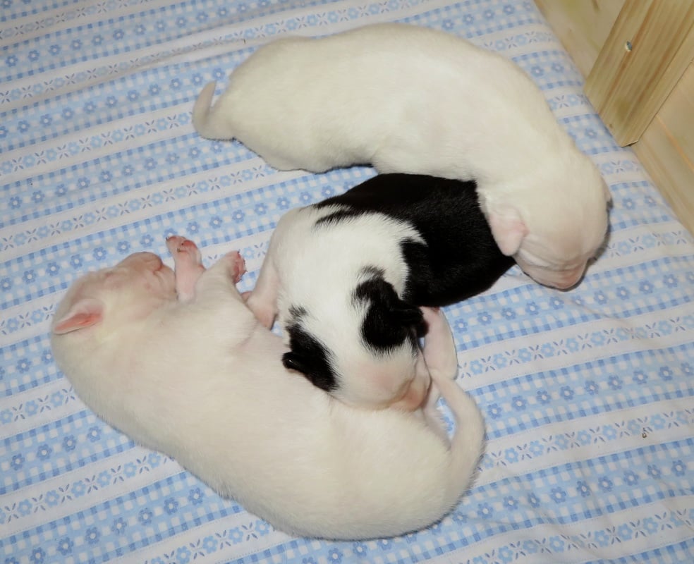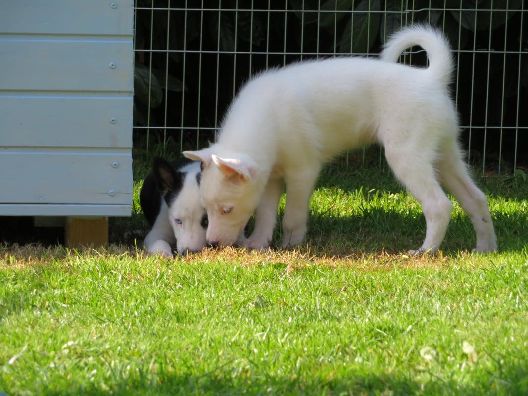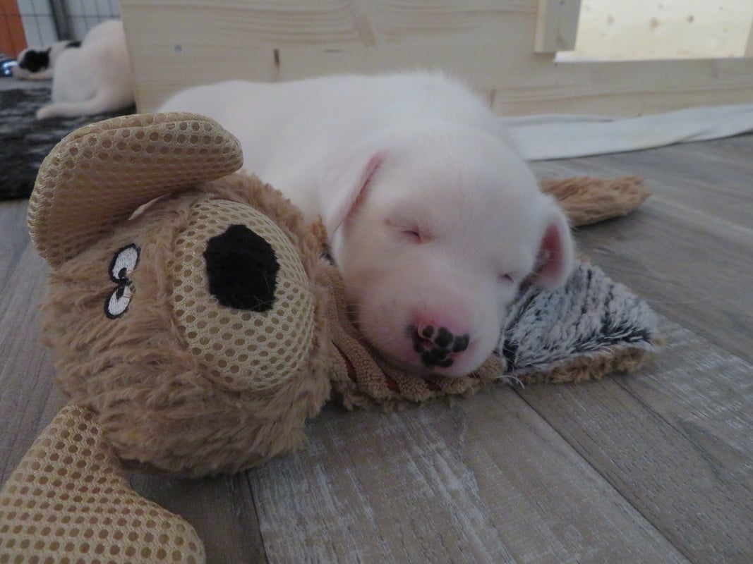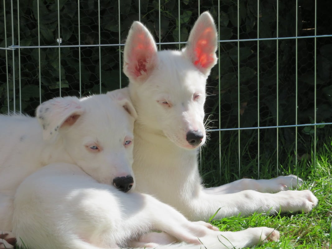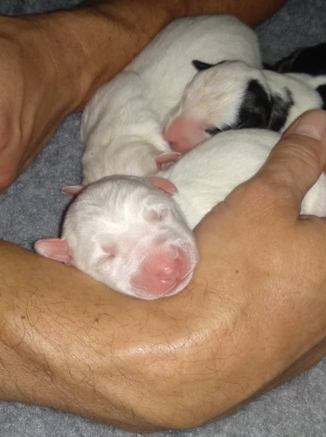 So ist Ayla jetzt stolze Mama von insgesamt drei zucksersüßen Welpen. Frosty, die weiße Hündin, Arik, der weiße Rüde, und Smacks, die schwarzweiße Hündin, die wegen des schwarzen Fells um das linke Auge auch die "Piratenbraut" genannt wird.