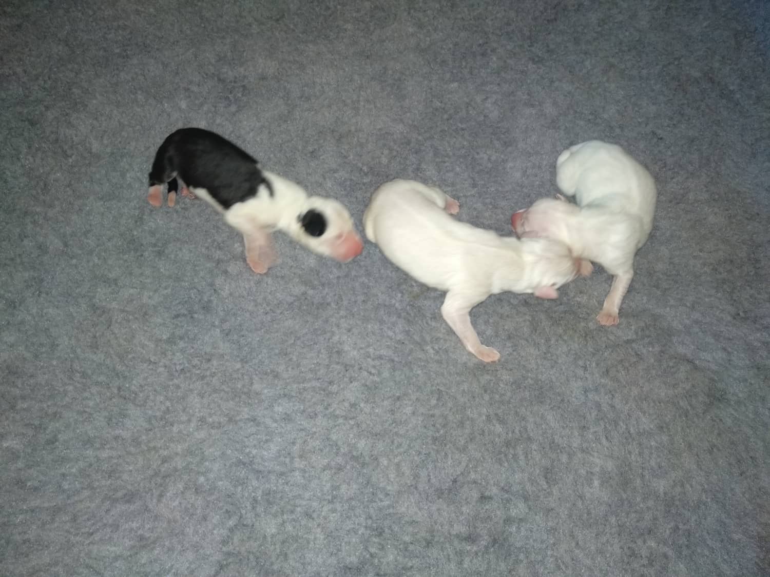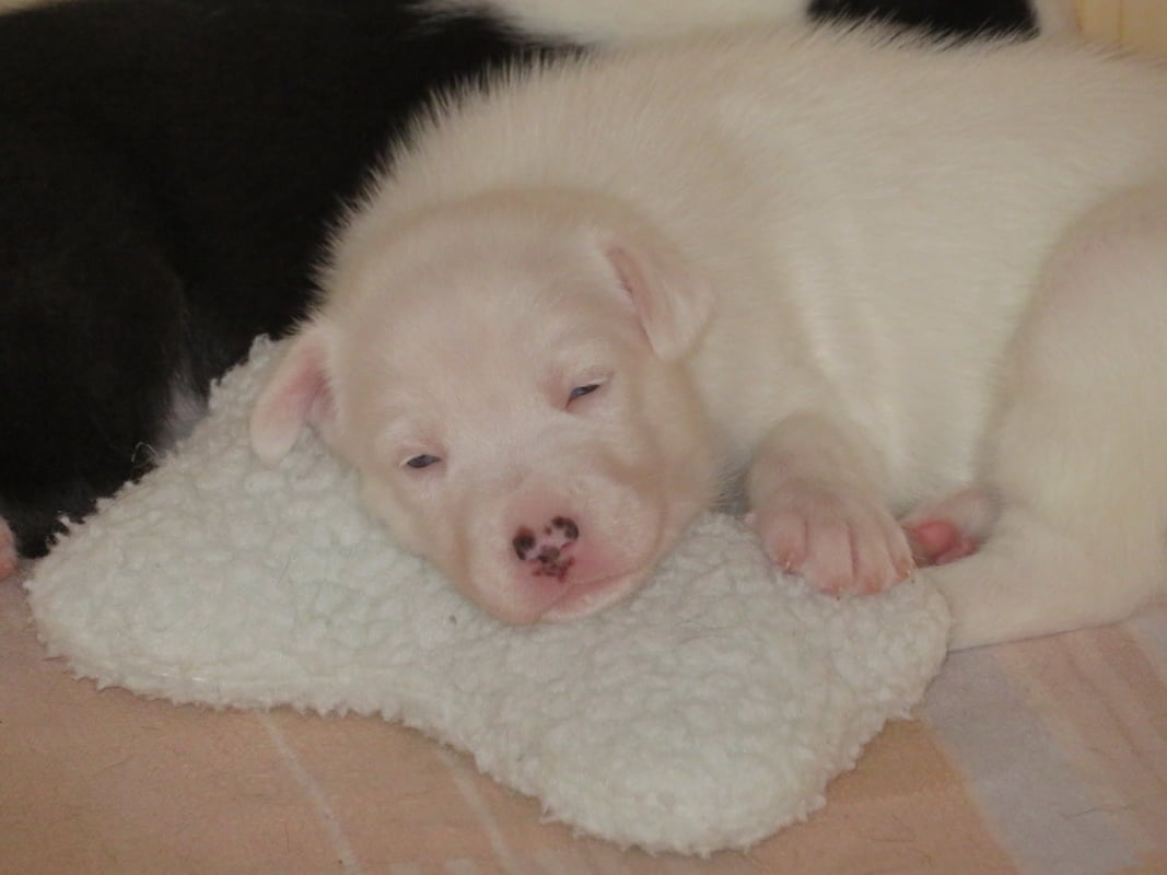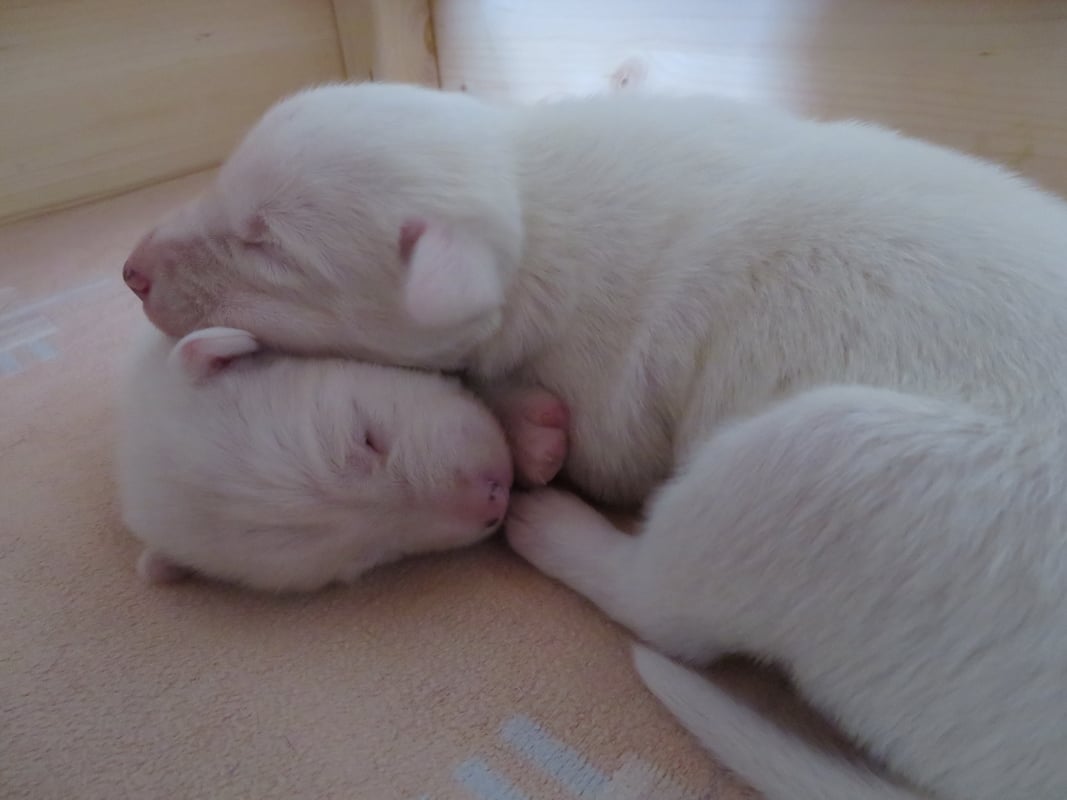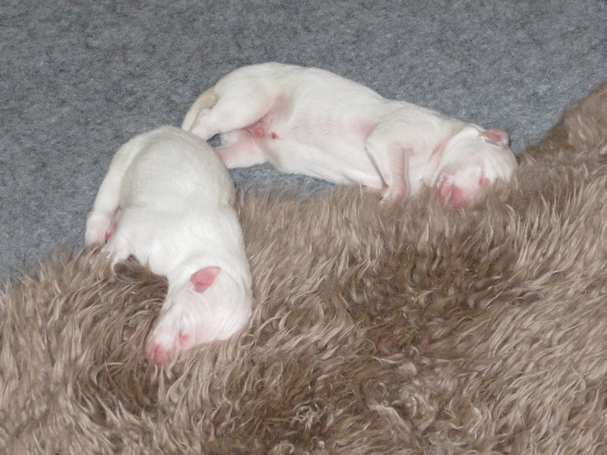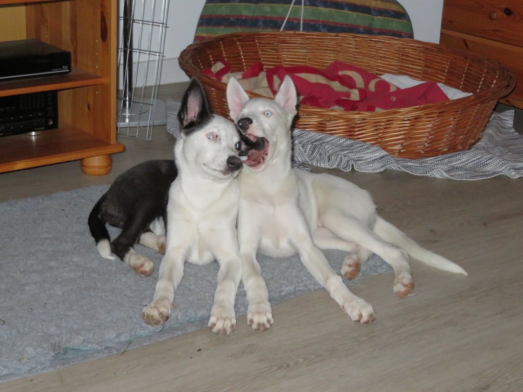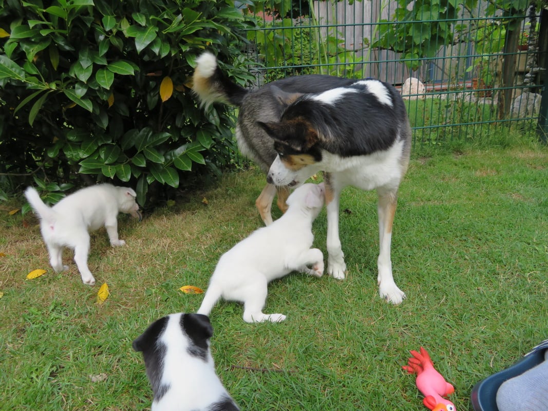 So ist Ayla jetzt stolze Mama von insgesamt drei zucksersüßen Welpen. Frosty, die weiße Hündin, Arik, der weiße Rüde, und Smacks, die schwarzweiße Hündin, die wegen des schwarzen Fells um das linke Auge auch die "Piratenbraut" genannt wird.