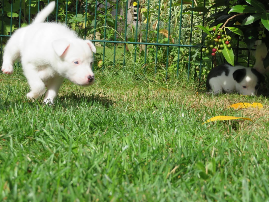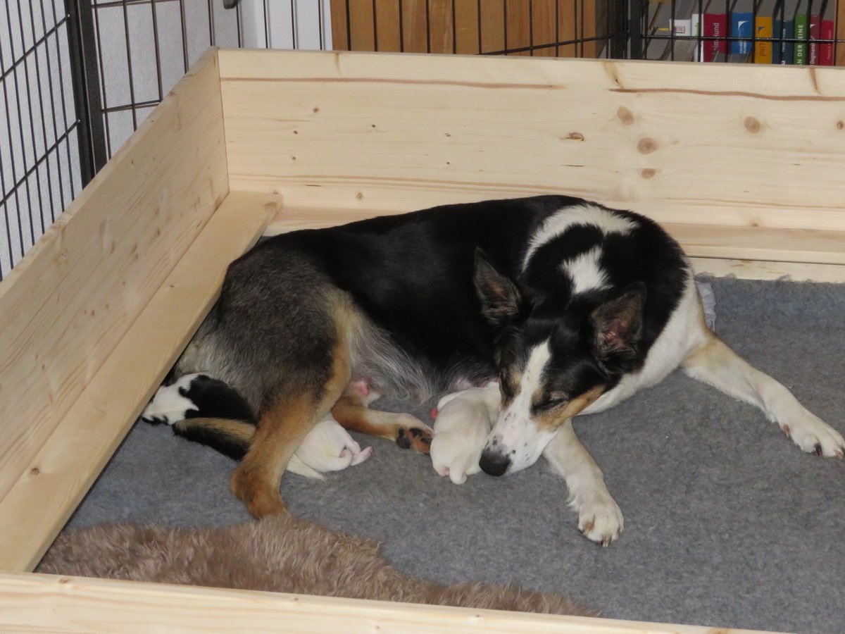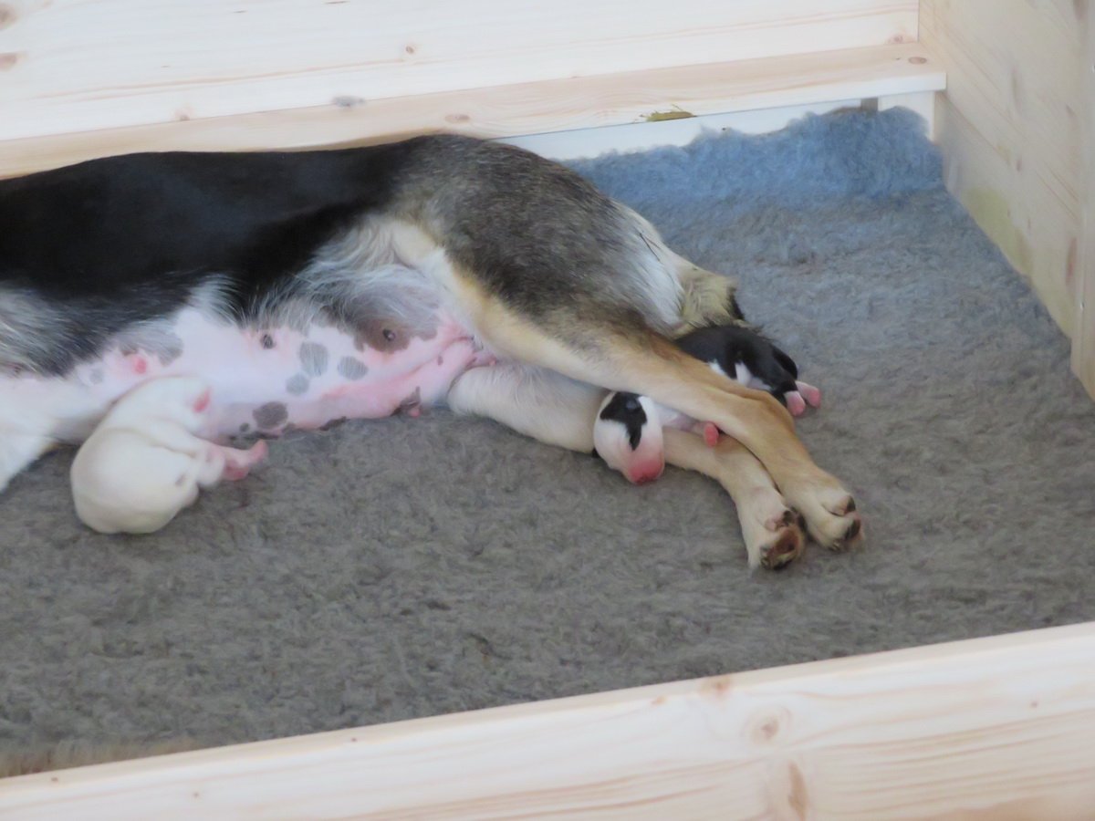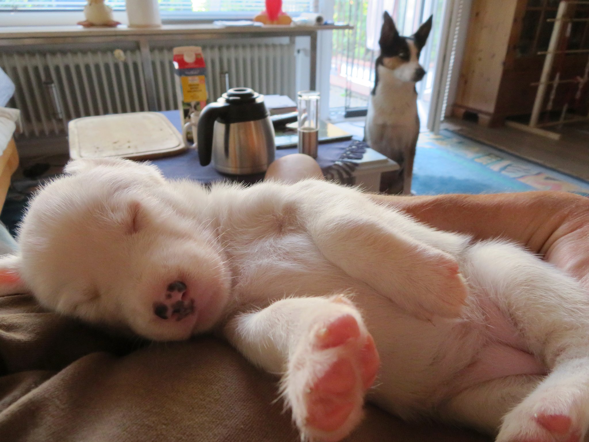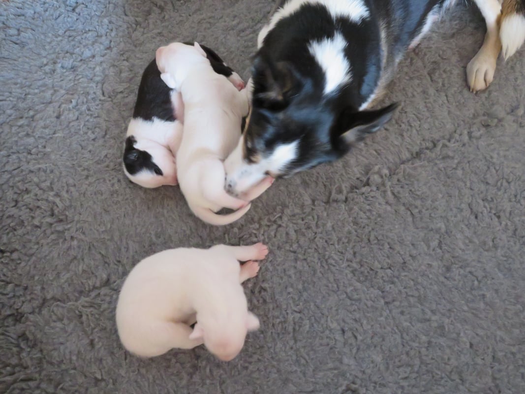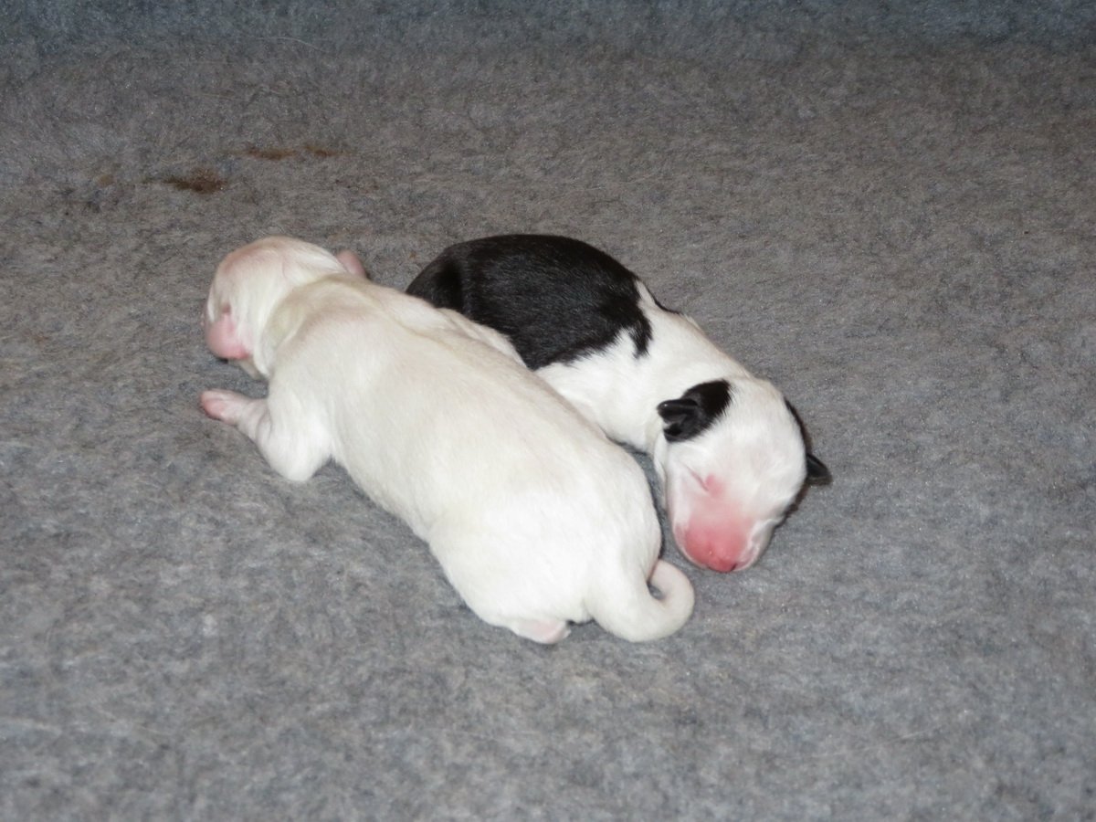 So ist Ayla jetzt stolze Mama von insgesamt drei zucksersüßen Welpen. Frosty, die weiße Hündin, Arik, der weiße Rüde, und Smacks, die schwarzweiße Hündin, die wegen des schwarzen Fells um das linke Auge auch die "Piratenbraut" genannt wird.