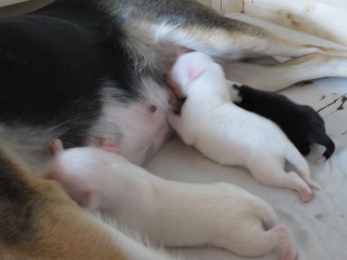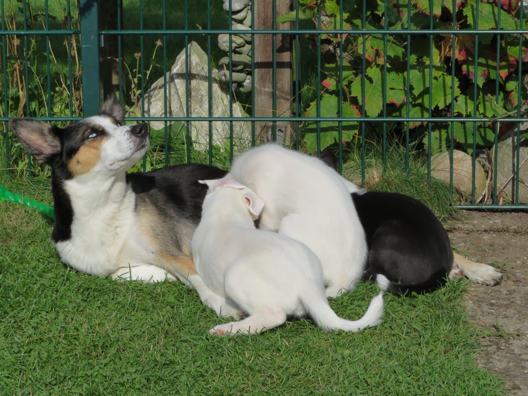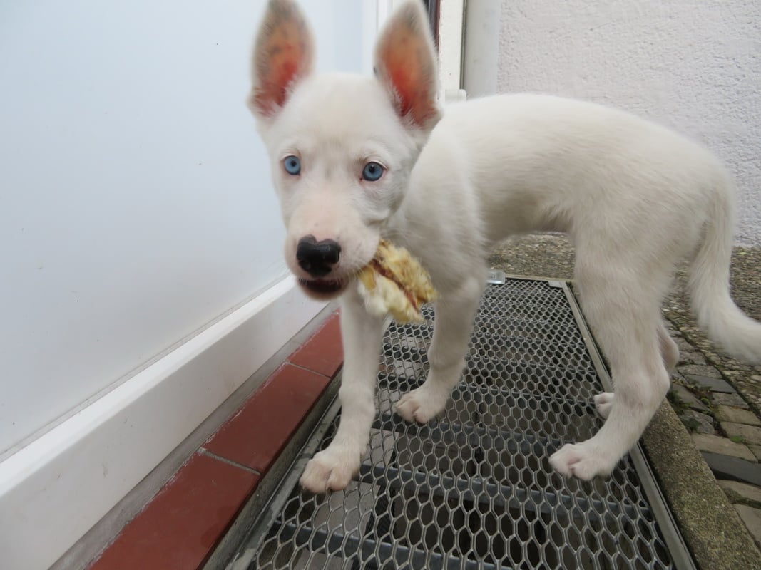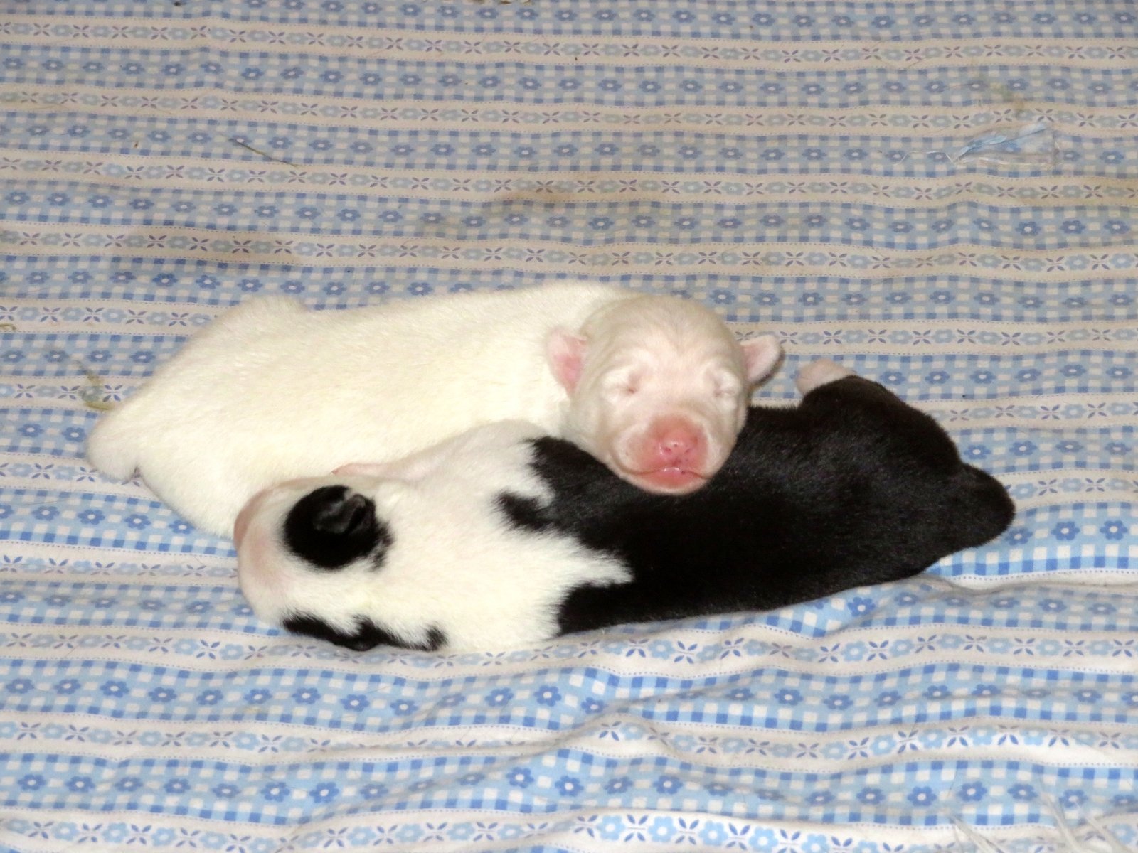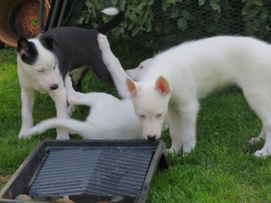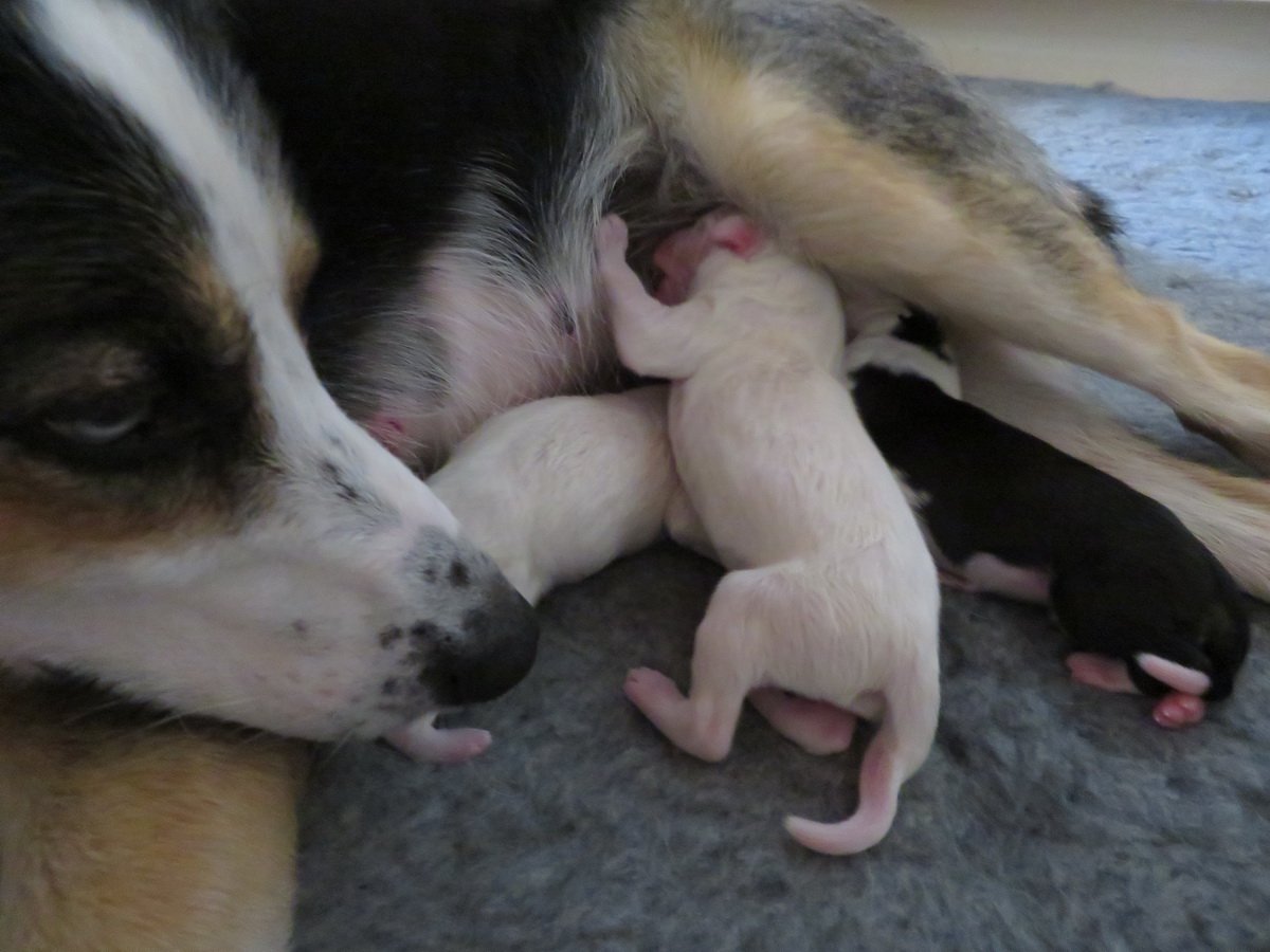 So ist Ayla jetzt stolze Mama von insgesamt drei zucksersüßen Welpen. Frosty, die weiße Hündin, Arik, der weiße Rüde, und Smacks, die schwarzweiße Hündin, die wegen des schwarzen Fells um das linke Auge auch die "Piratenbraut" genannt wird.