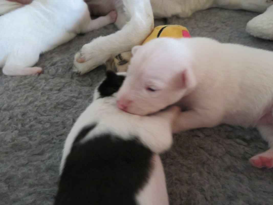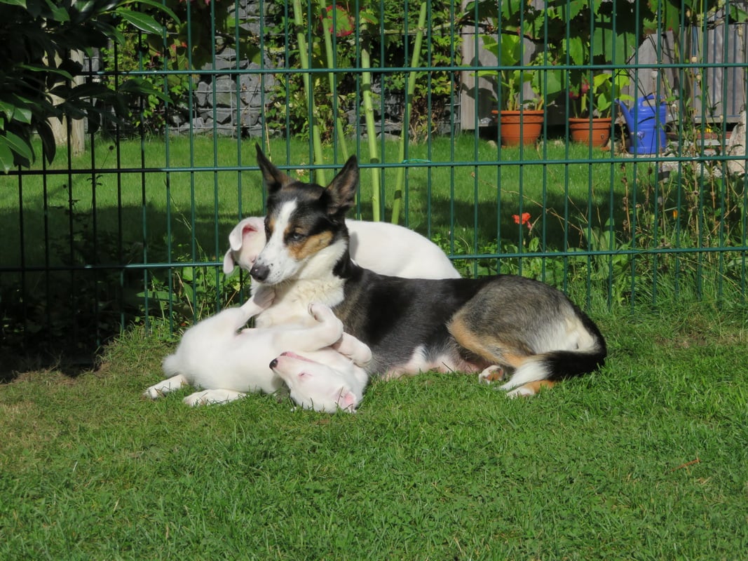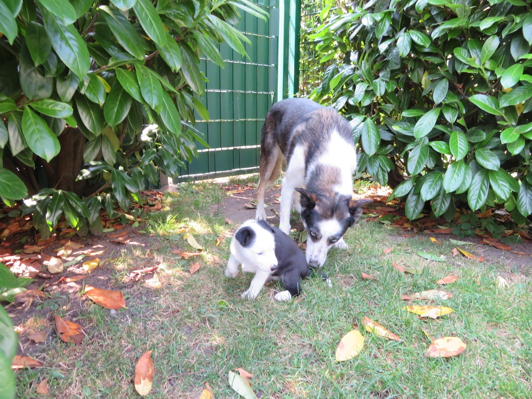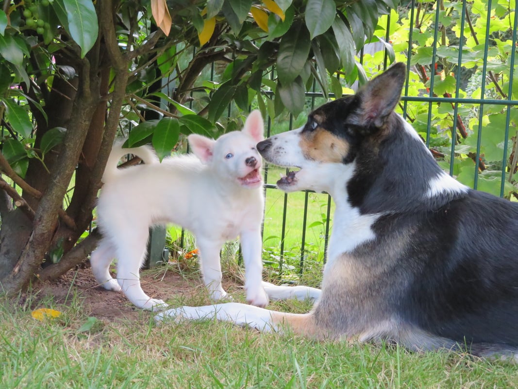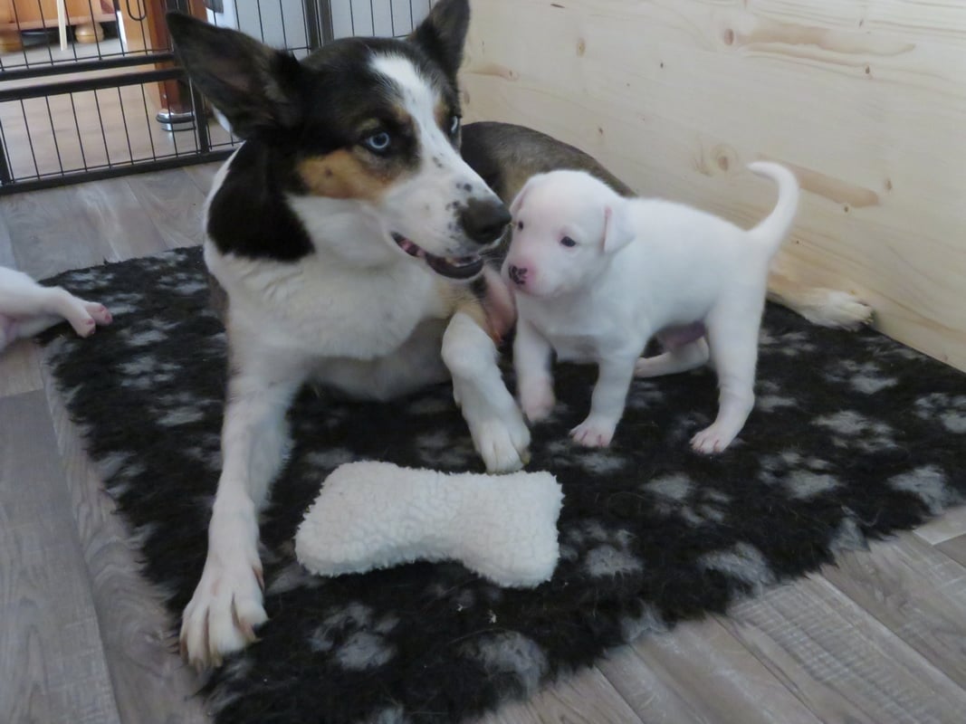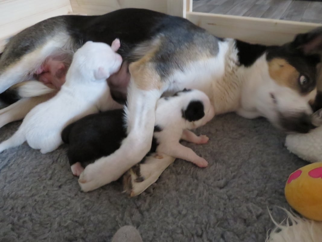 So ist Ayla jetzt stolze Mama von insgesamt drei zucksersüßen Welpen. Frosty, die weiße Hündin, Arik, der weiße Rüde, und Smacks, die schwarzweiße Hündin, die wegen des schwarzen Fells um das linke Auge auch die "Piratenbraut" genannt wird.