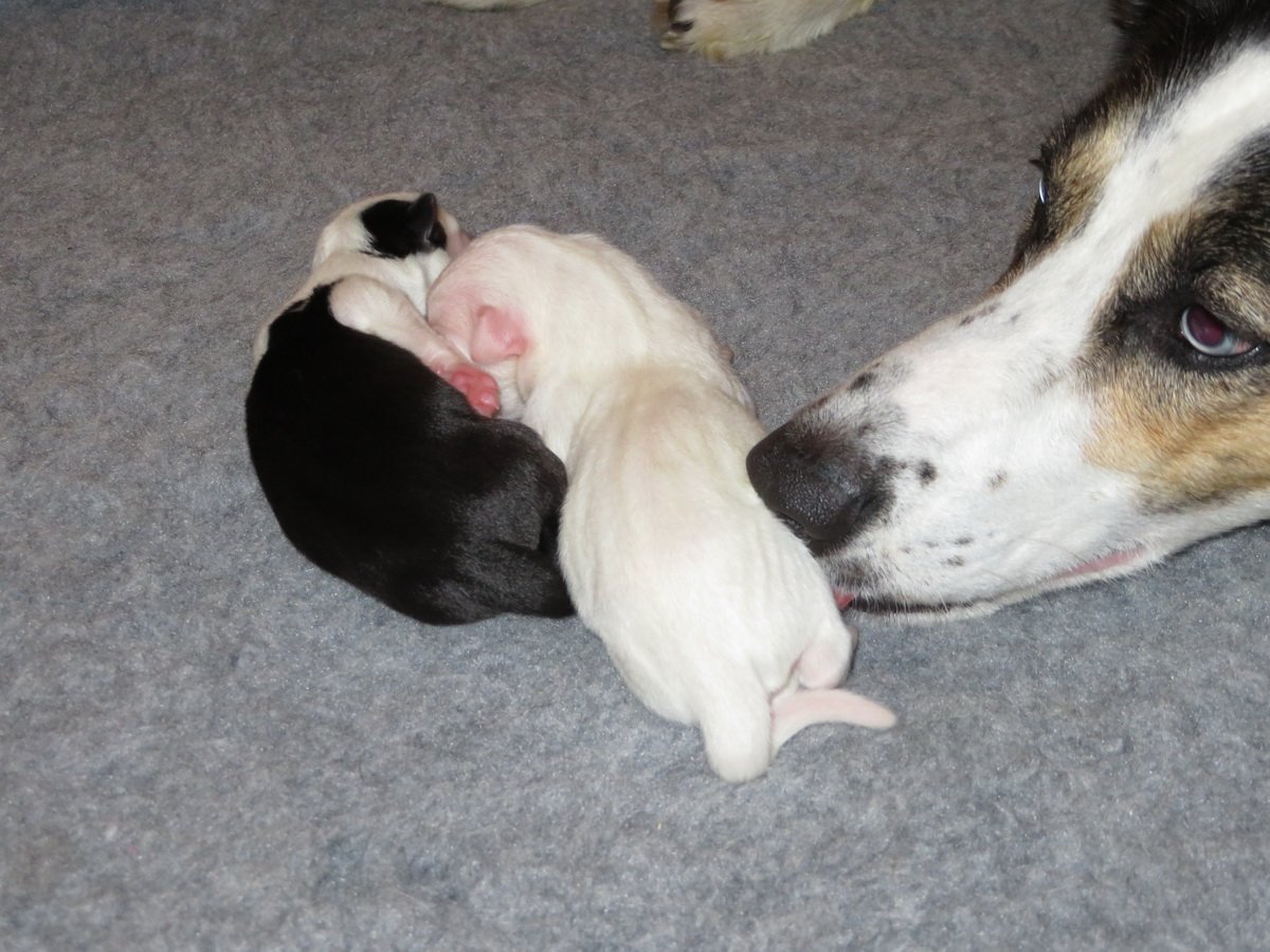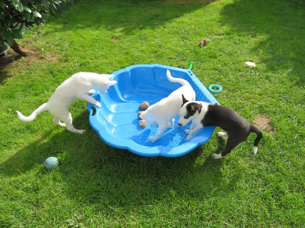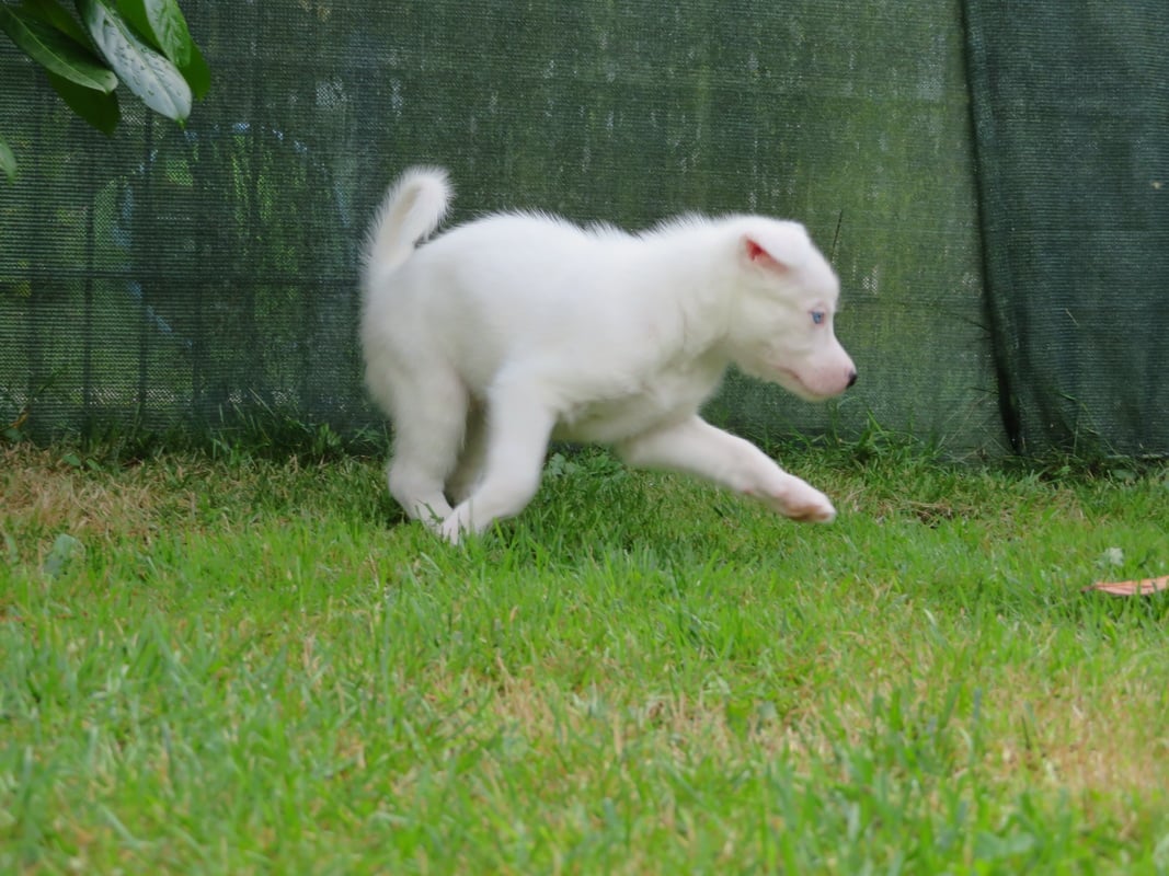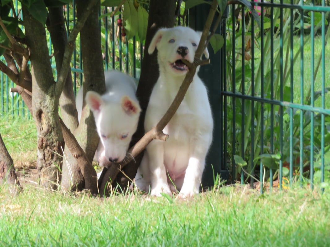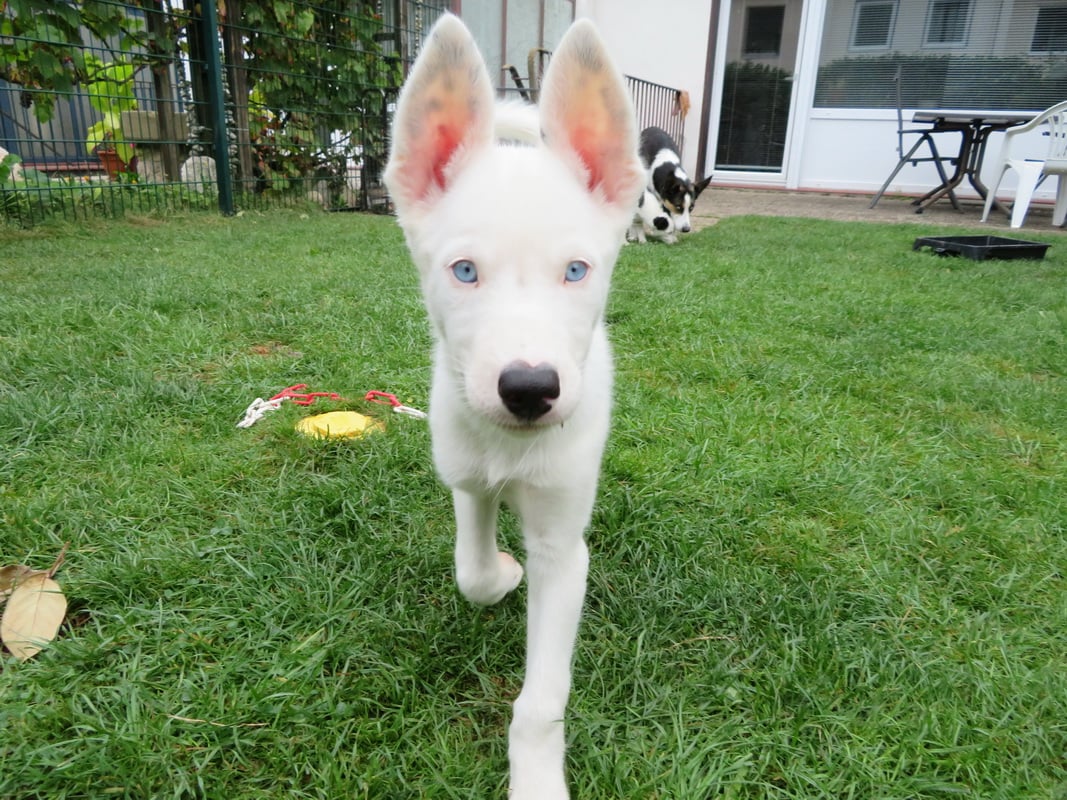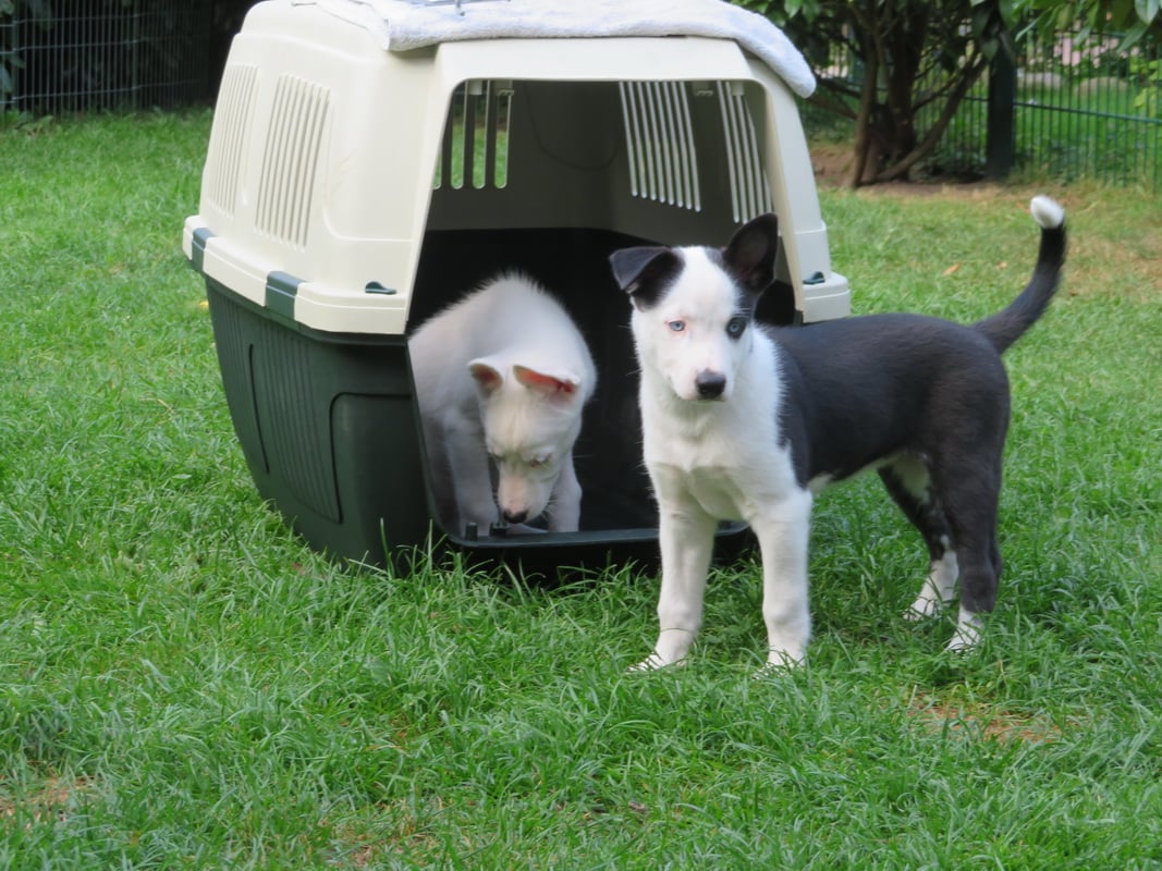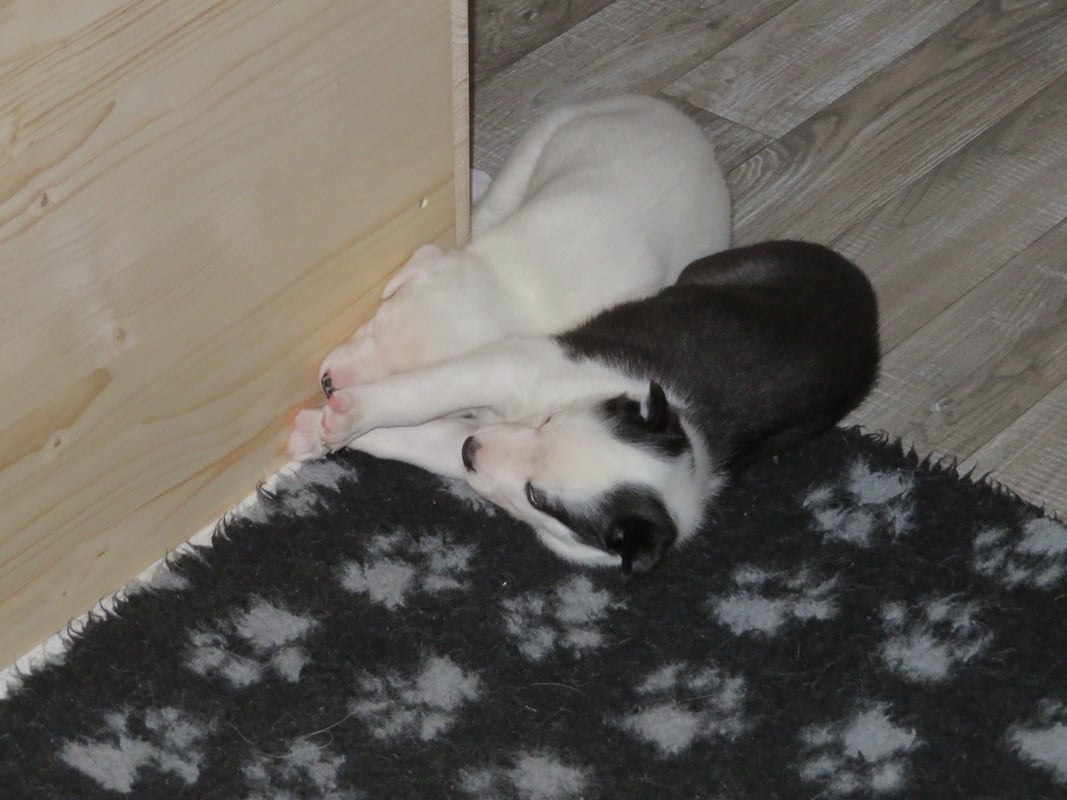 So ist Ayla jetzt stolze Mama von insgesamt drei zucksersüßen Welpen. Frosty, die weiße Hündin, Arik, der weiße Rüde, und Smacks, die schwarzweiße Hündin, die wegen des schwarzen Fells um das linke Auge auch die "Piratenbraut" genannt wird.