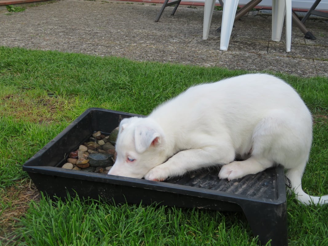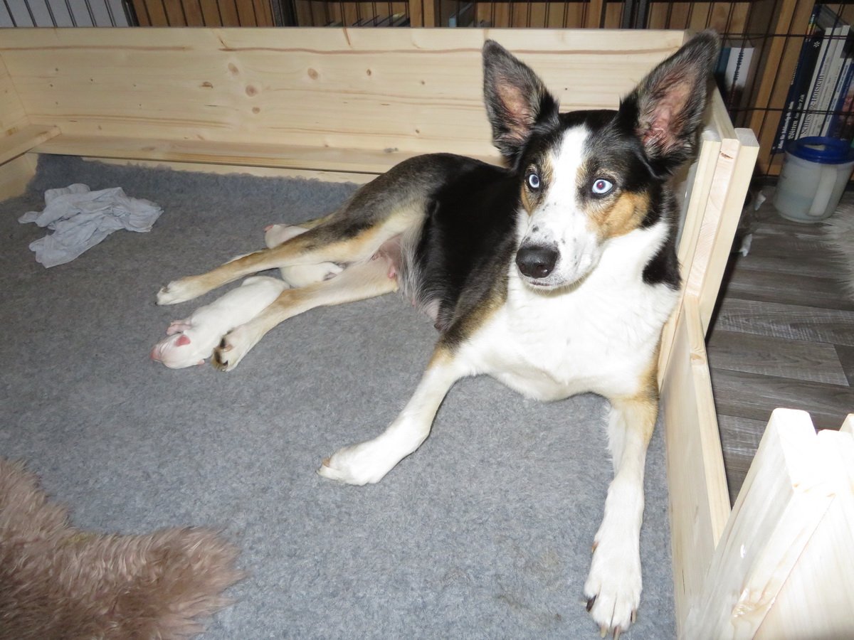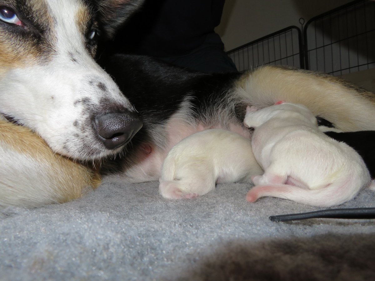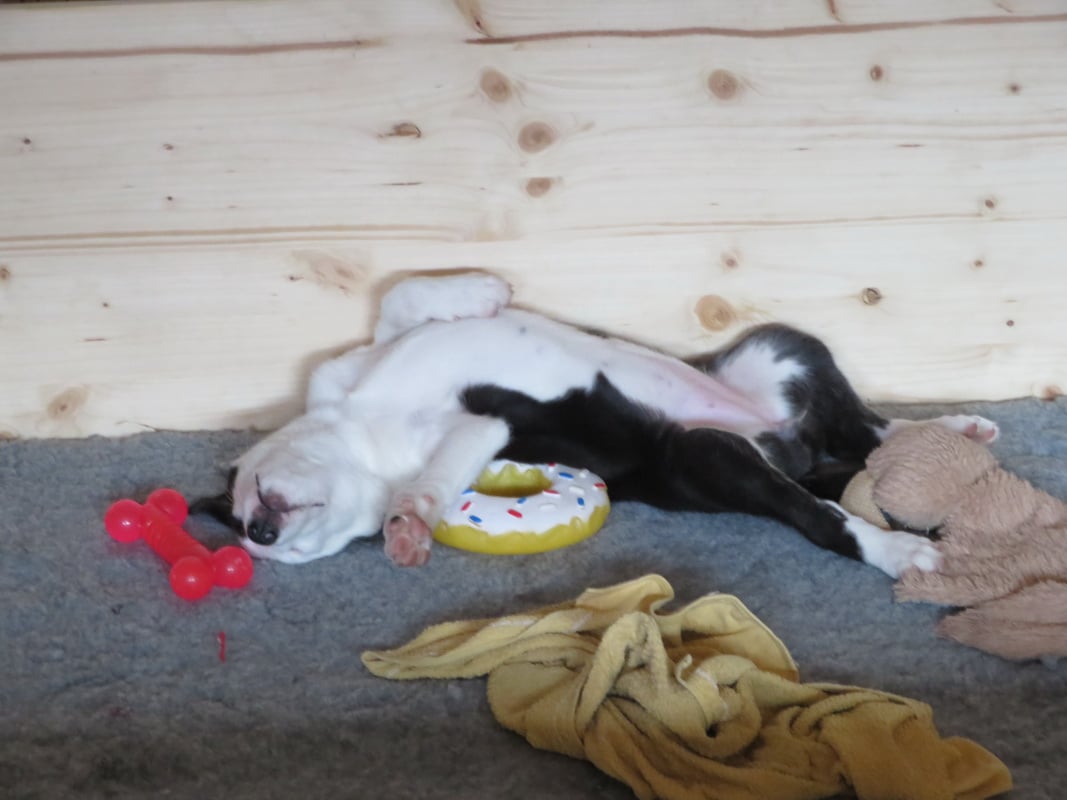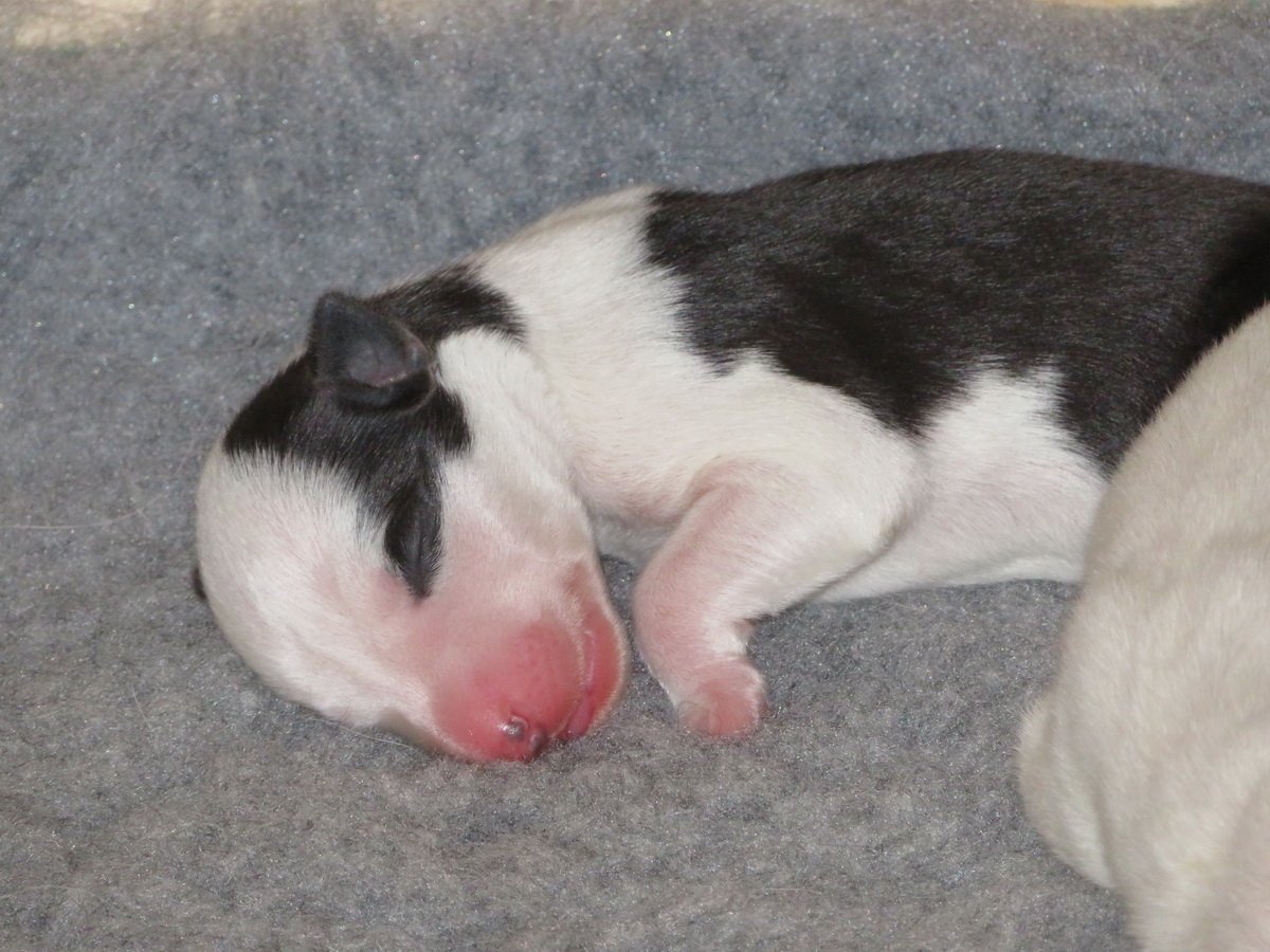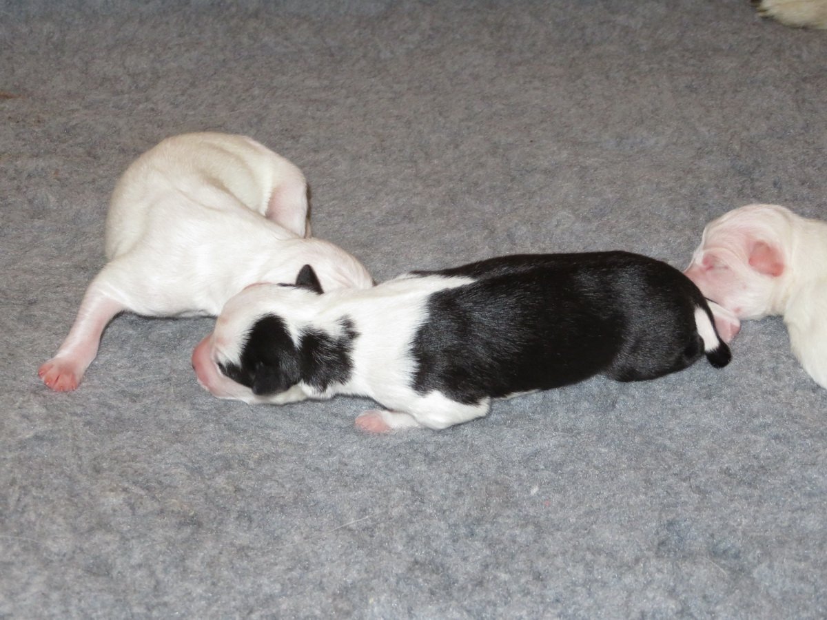 So ist Ayla jetzt stolze Mama von insgesamt drei zucksersüßen Welpen. Frosty, die weiße Hündin, Arik, der weiße Rüde, und Smacks, die schwarzweiße Hündin, die wegen des schwarzen Fells um das linke Auge auch die "Piratenbraut" genannt wird.