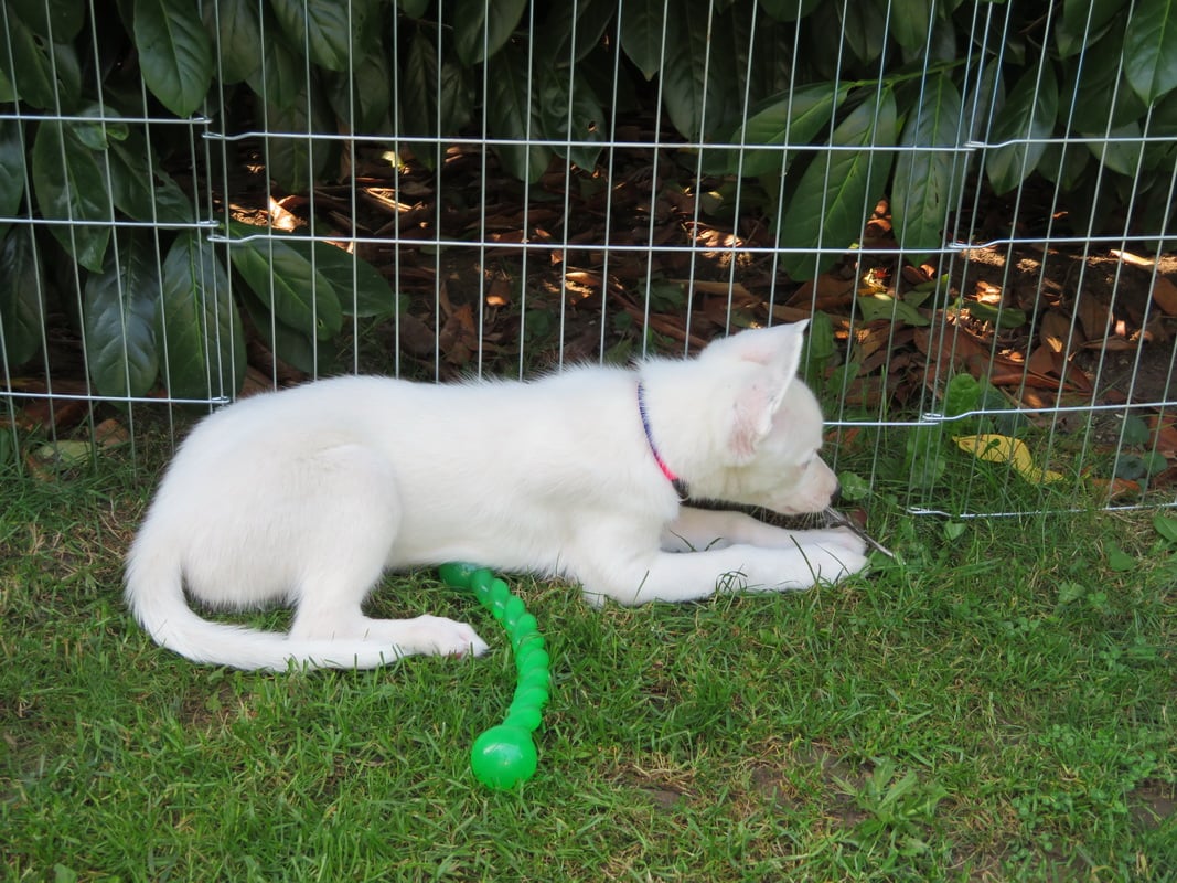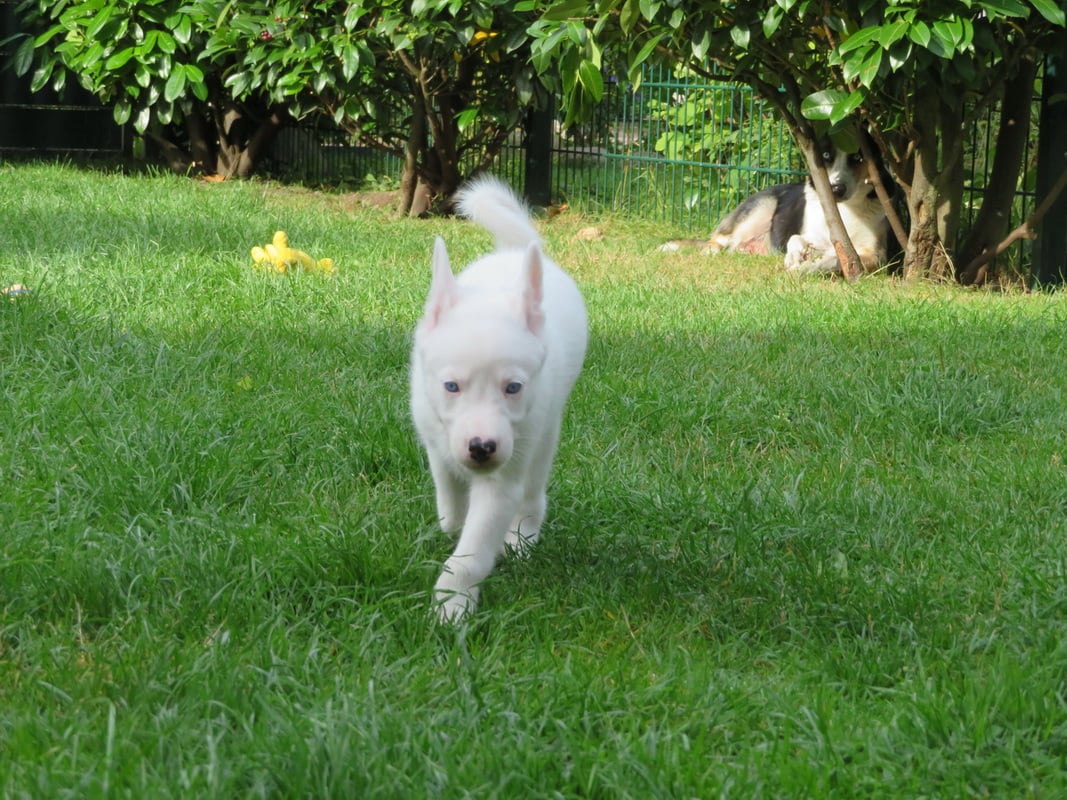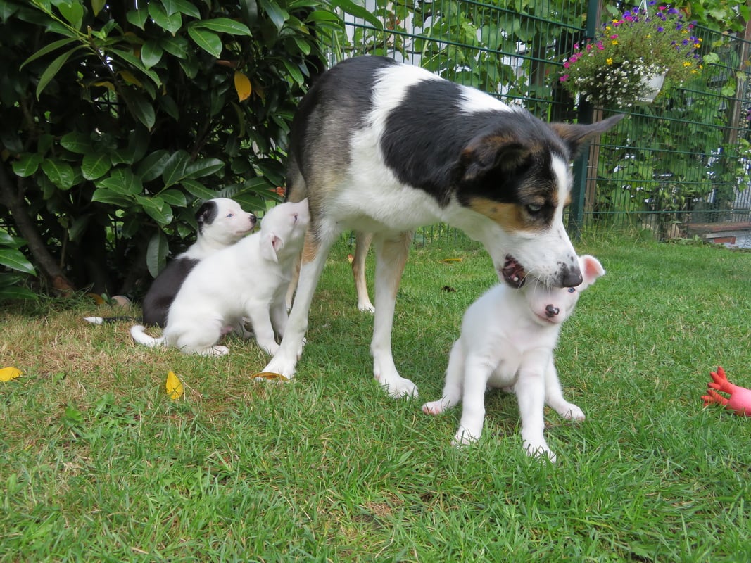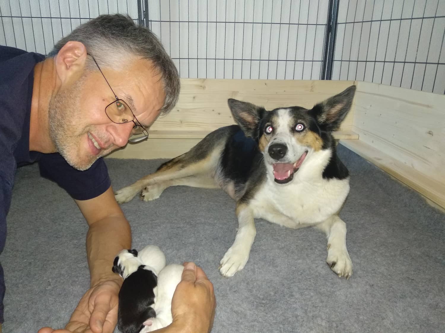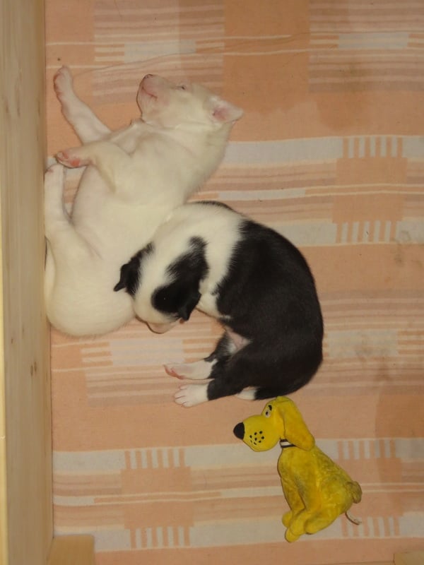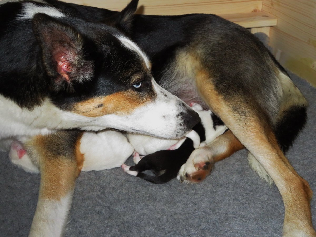 So ist Ayla jetzt stolze Mama von insgesamt drei zucksersüßen Welpen. Frosty, die weiße Hündin, Arik, der weiße Rüde, und Smacks, die schwarzweiße Hündin, die wegen des schwarzen Fells um das linke Auge auch die "Piratenbraut" genannt wird.