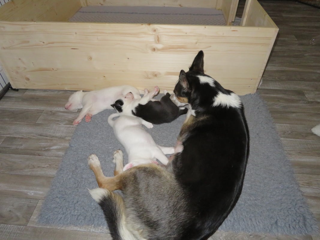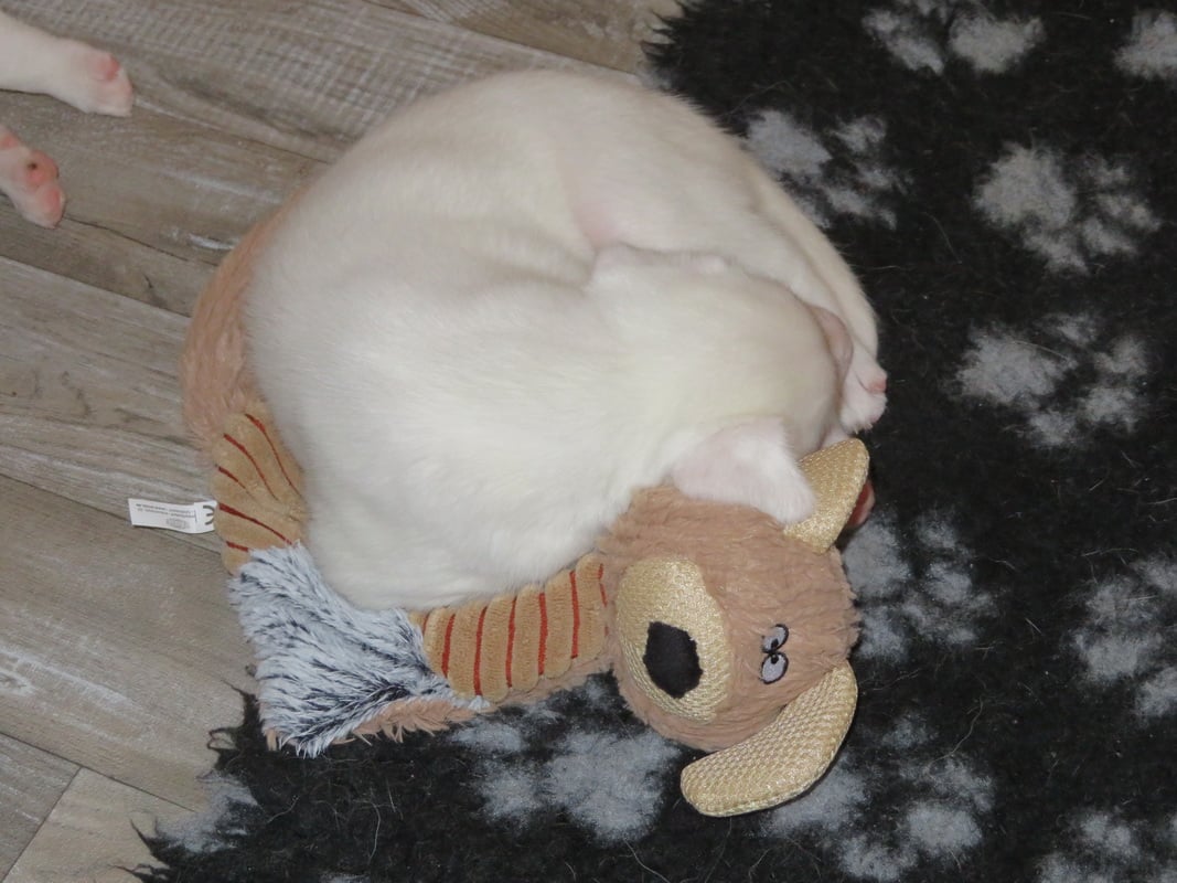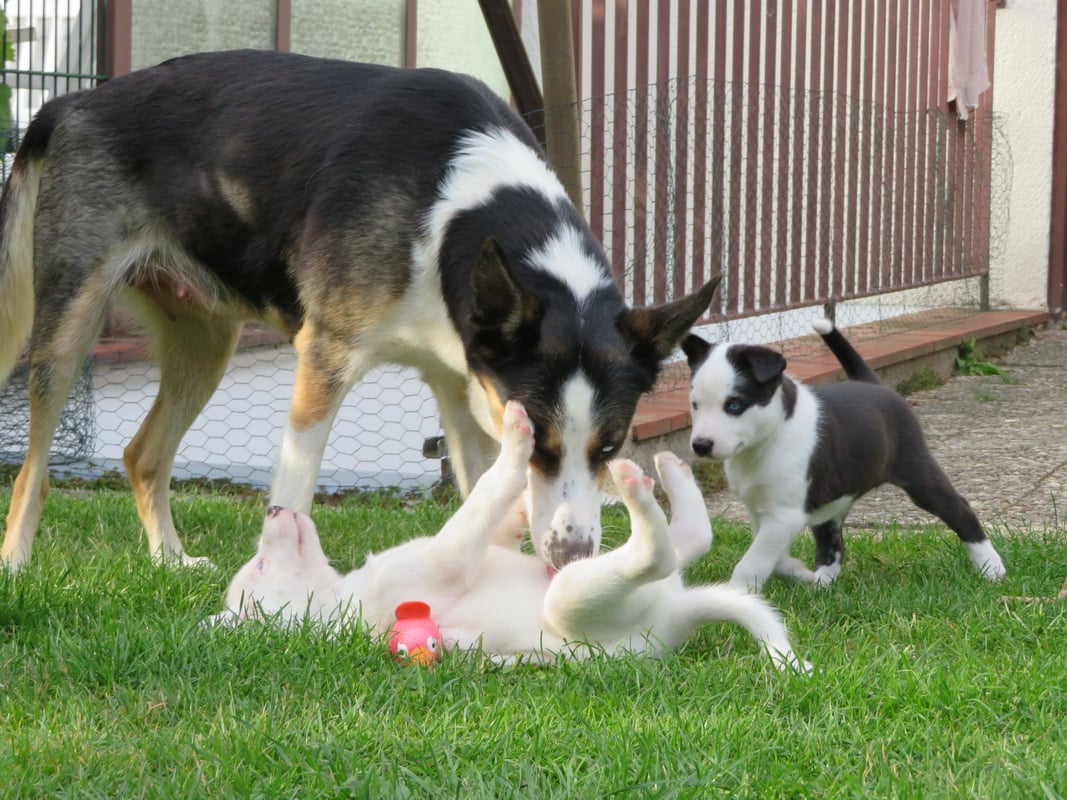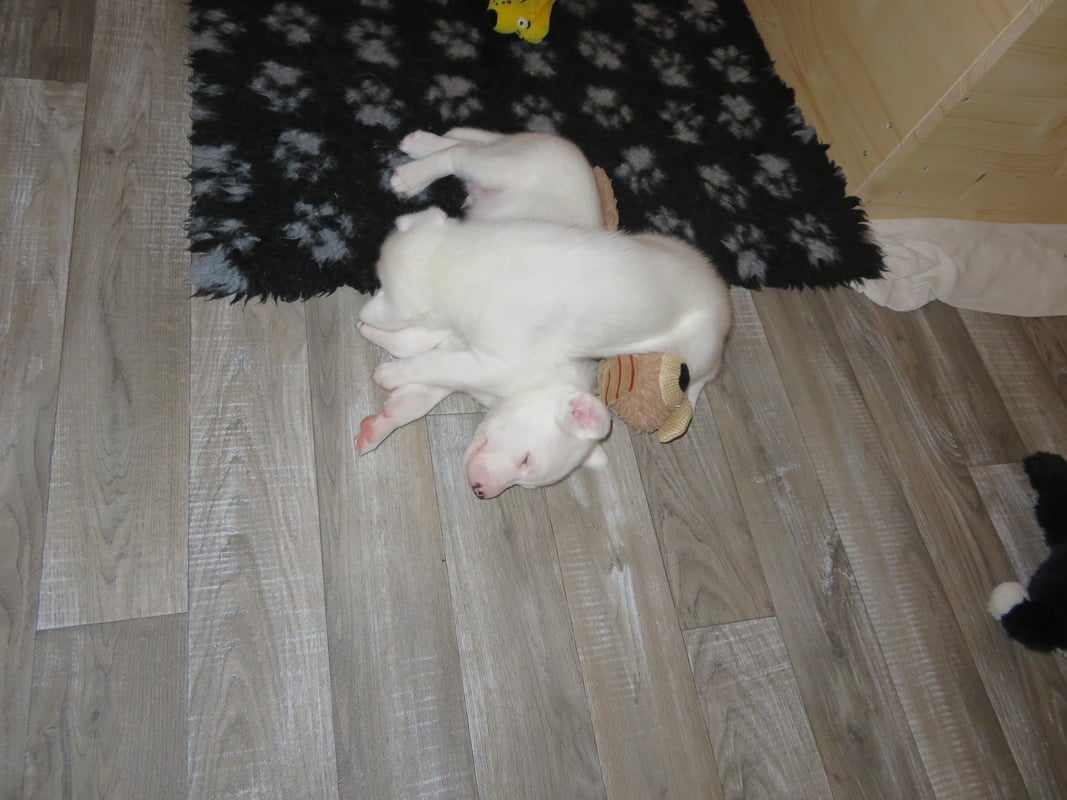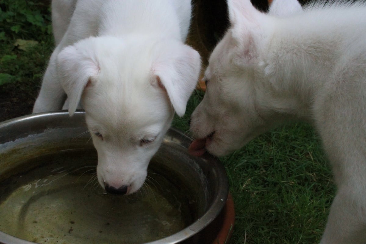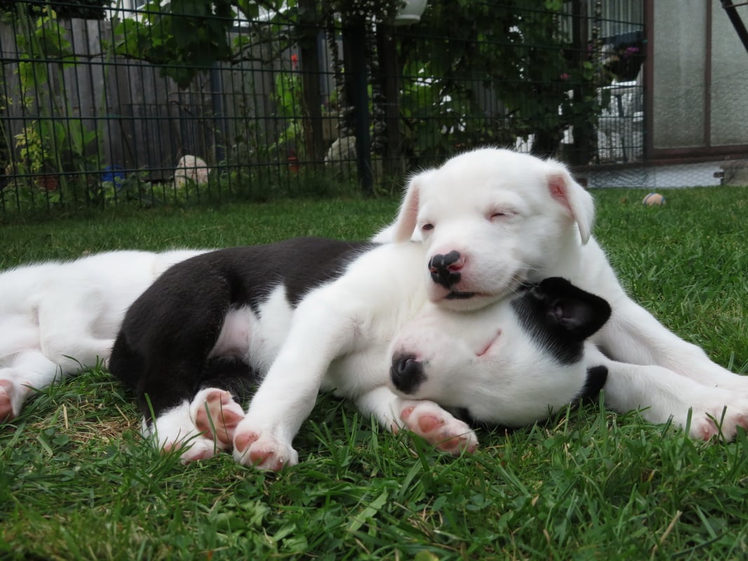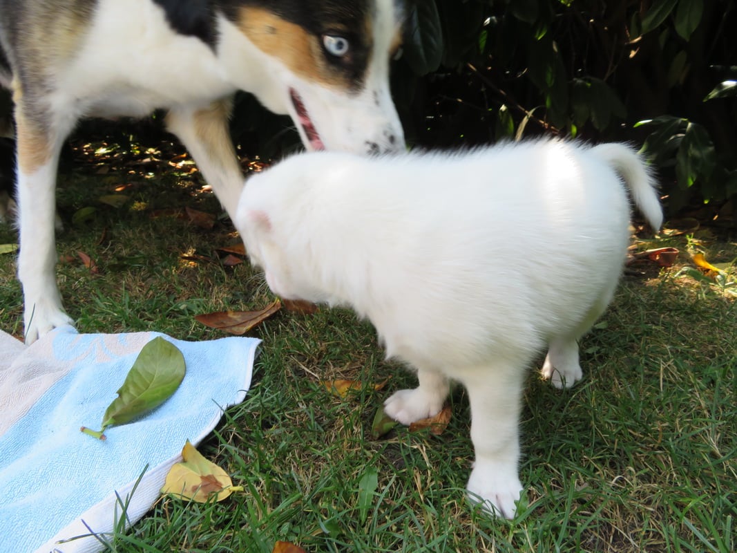 So ist Ayla jetzt stolze Mama von insgesamt drei zucksersüßen Welpen. Frosty, die weiße Hündin, Arik, der weiße Rüde, und Smacks, die schwarzweiße Hündin, die wegen des schwarzen Fells um das linke Auge auch die "Piratenbraut" genannt wird.
