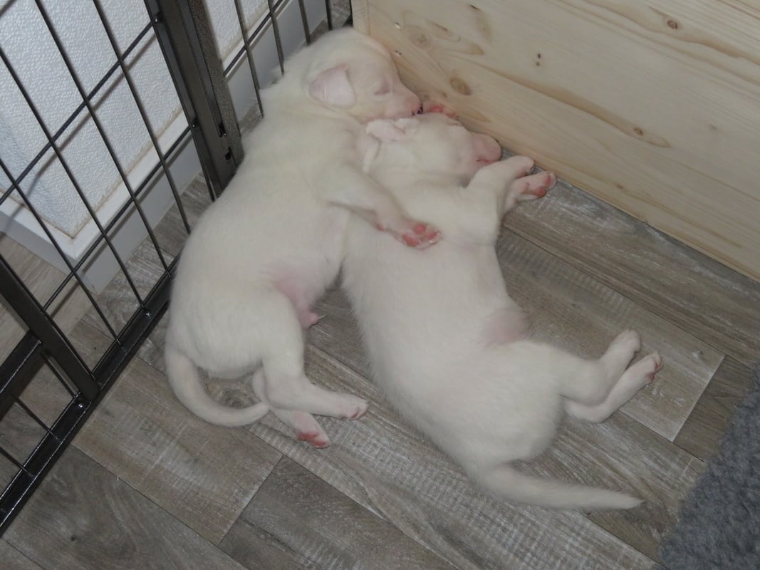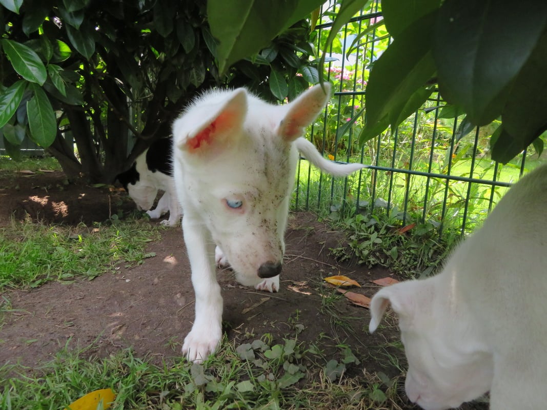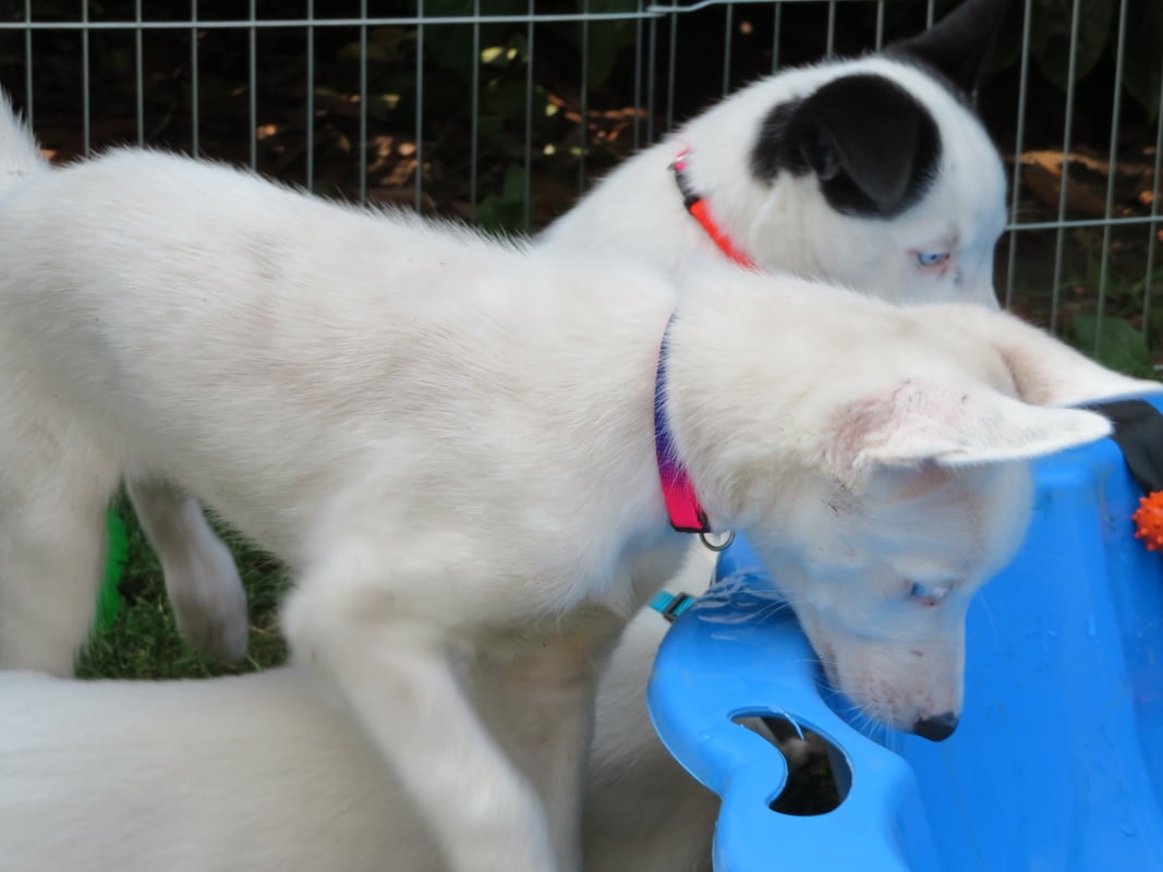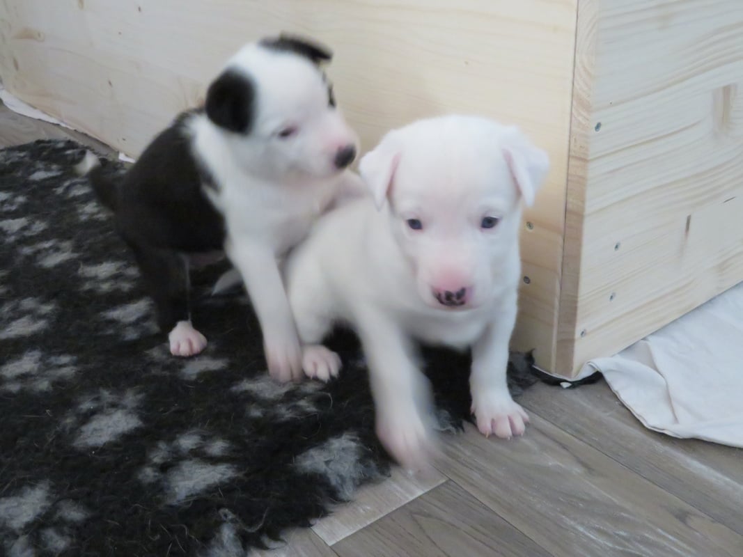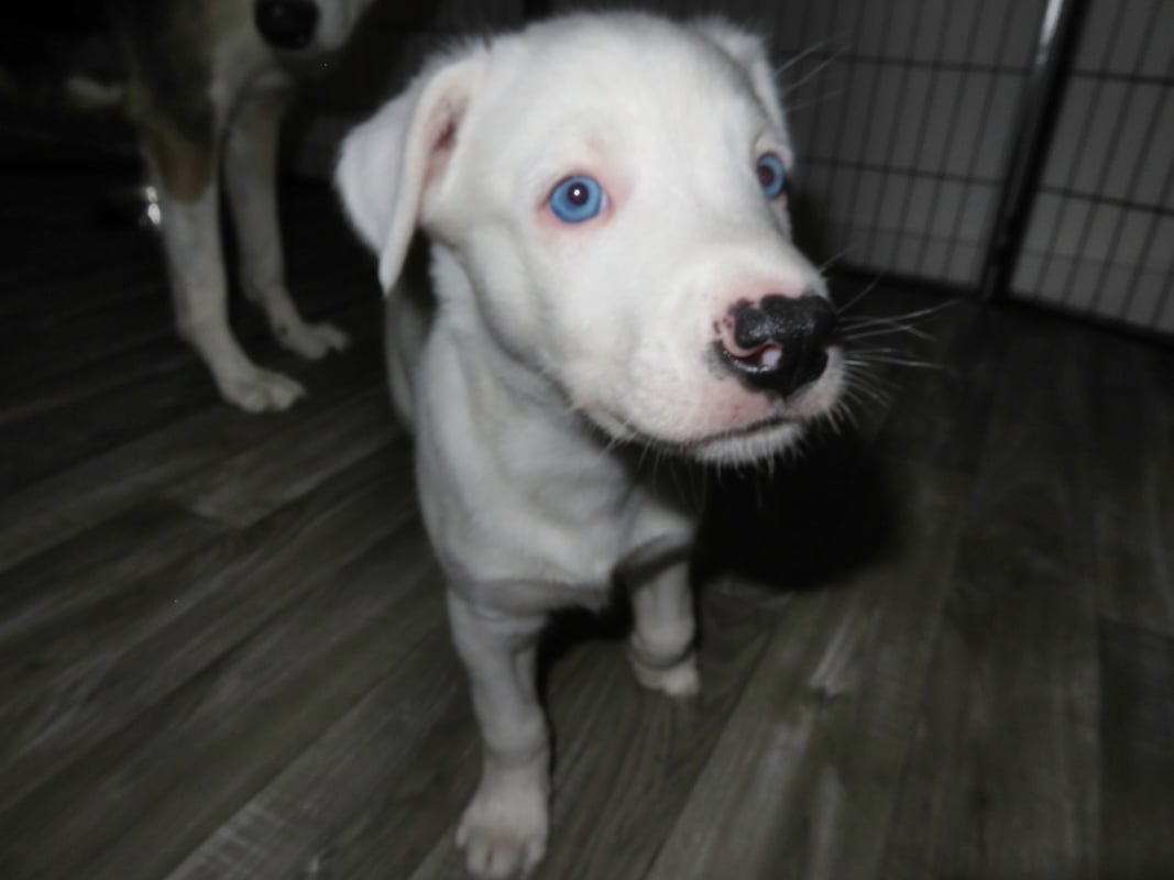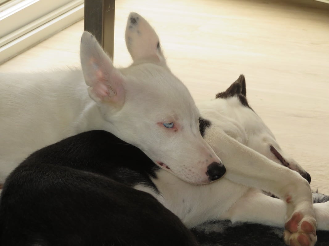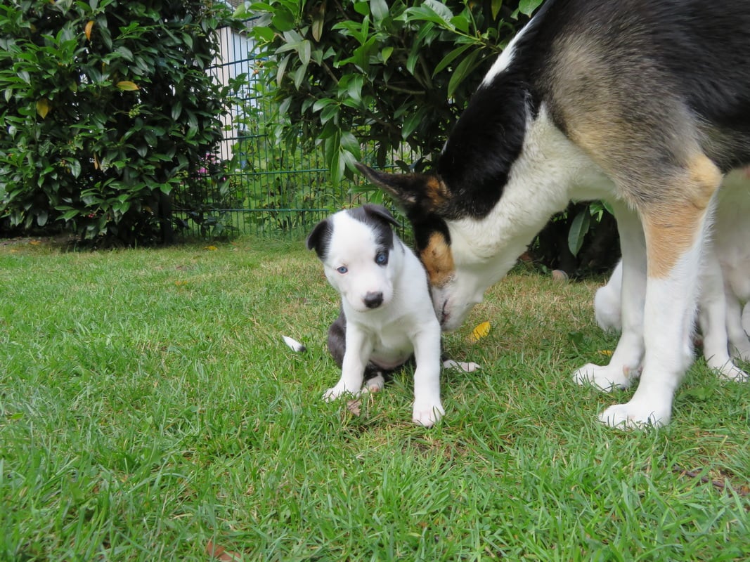So ist Ayla jetzt stolze Mama von insgesamt drei zucksersüßen Welpen. Frosty, die weiße Hündin, Arik, der weiße Rüde, und Smacks, die schwarzweiße Hündin, die wegen des schwarzen Fells um das linke Auge auch die "Piratenbraut" genannt wird.