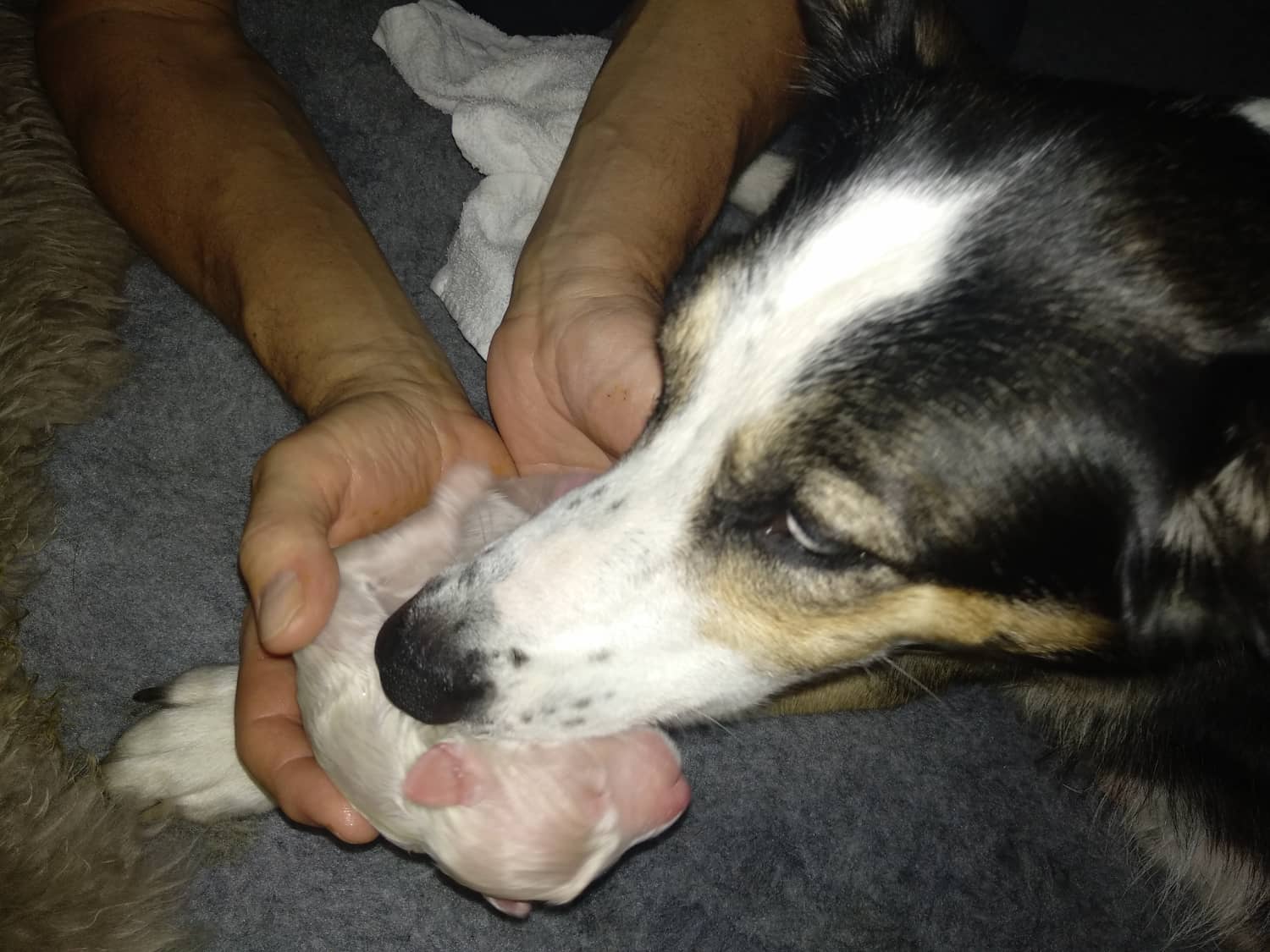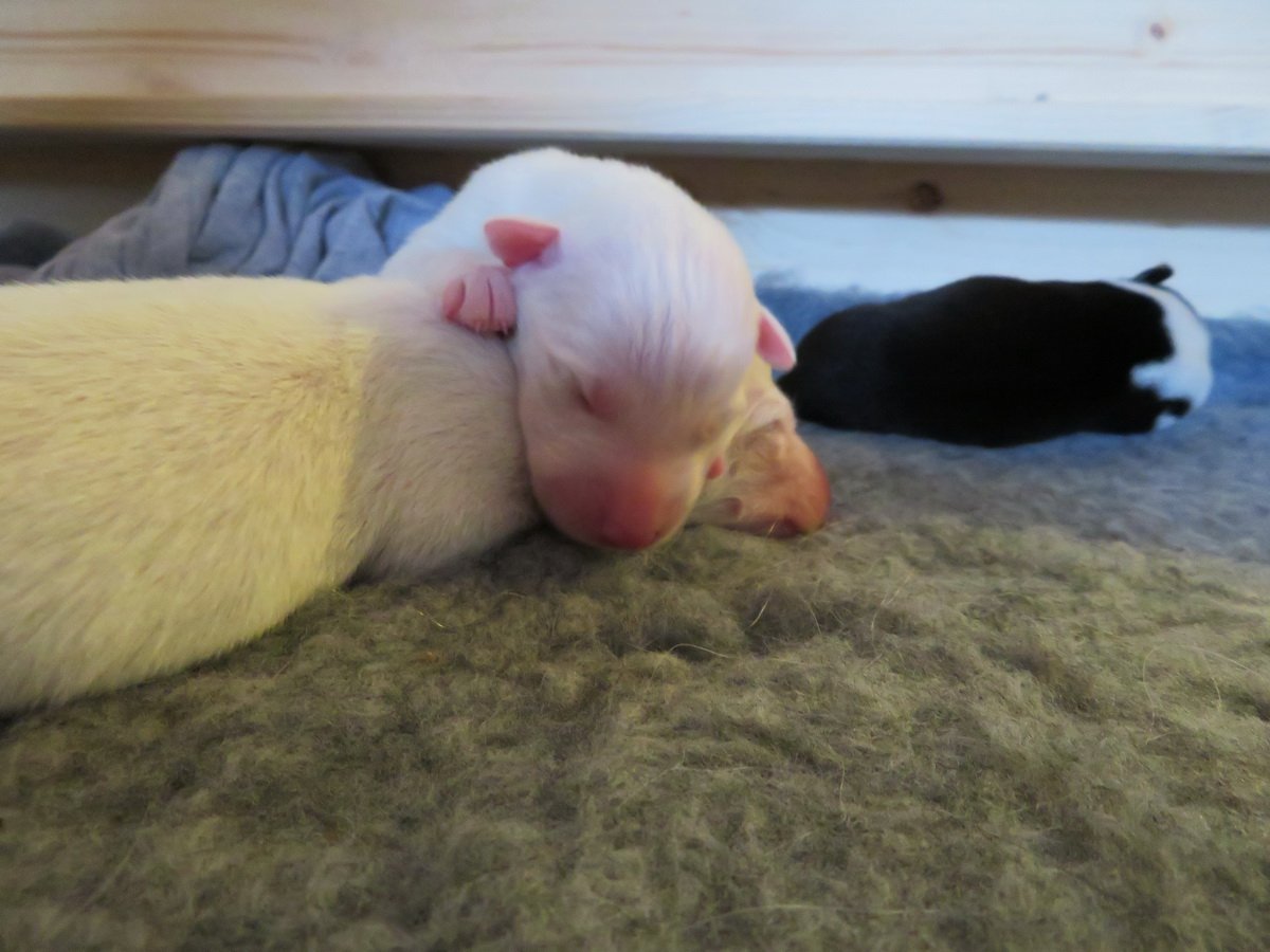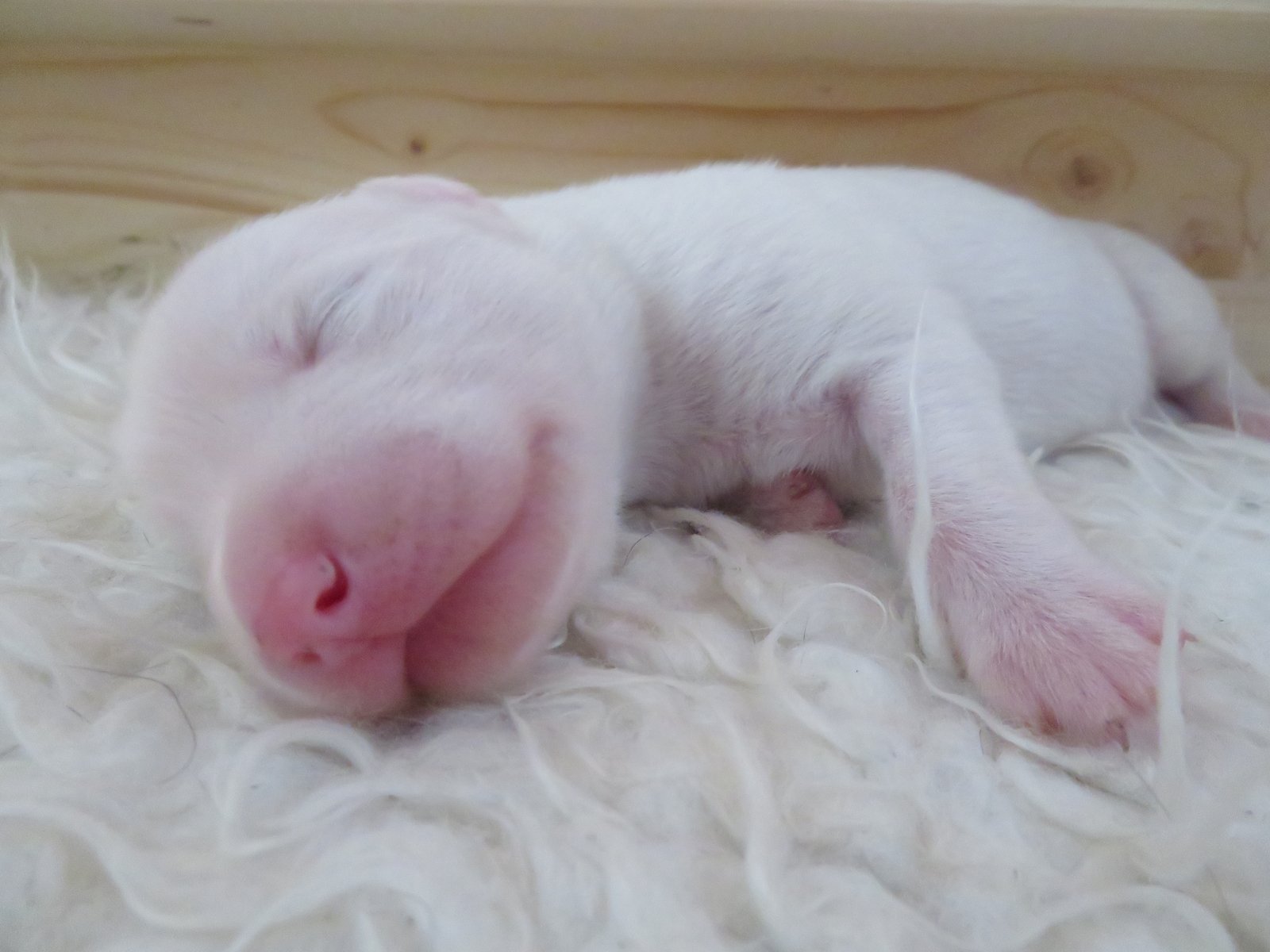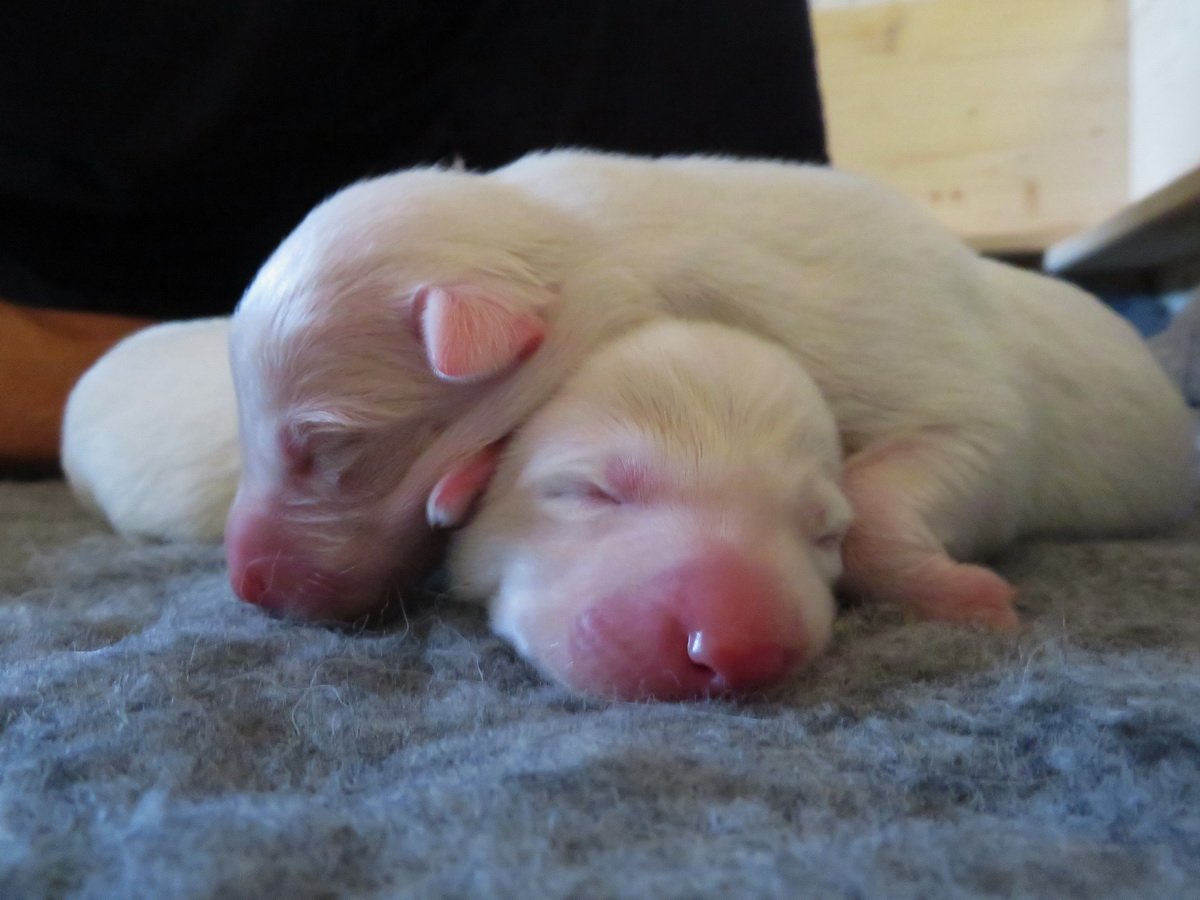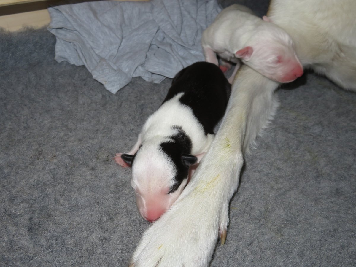 Nach der positiven Röntgendiagnose ging es dann sehr schnell, denn obwohl schon der 60. Tag bevor stand, rechnete ich insgeheim doch mit ein Paar Tagen Verzug aufgrund der Eisprungthematik. Aber weit gefehlt, am 3.7.2019, am 61. Tag nach dem ersten Decktermin, kam um 14:48 Uhr Nr. 1, eine schneeweiße Hündin auf die Welt.
