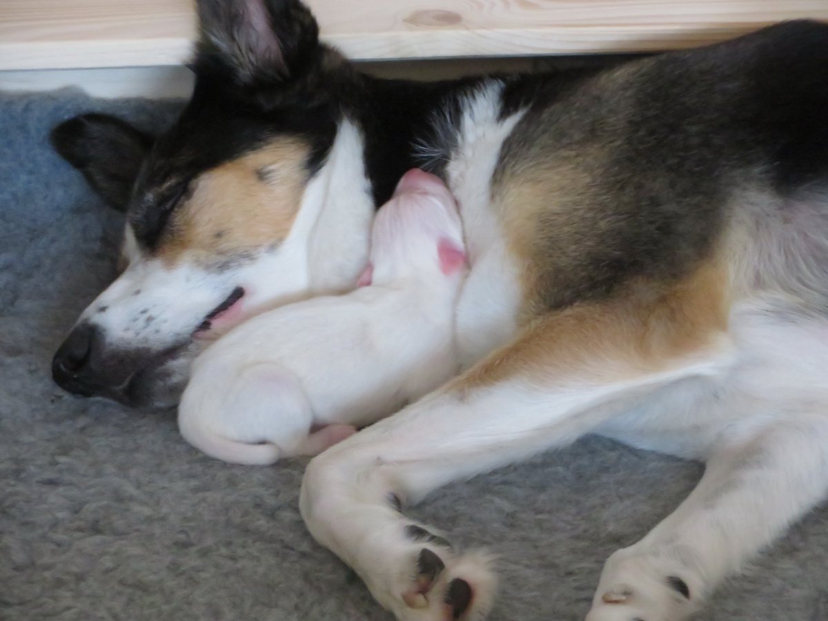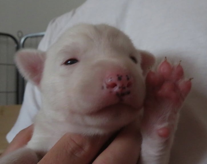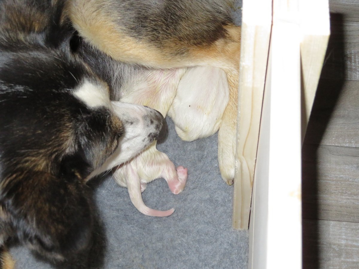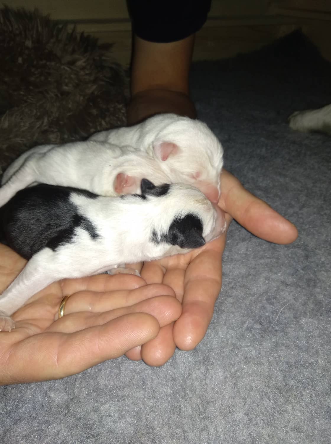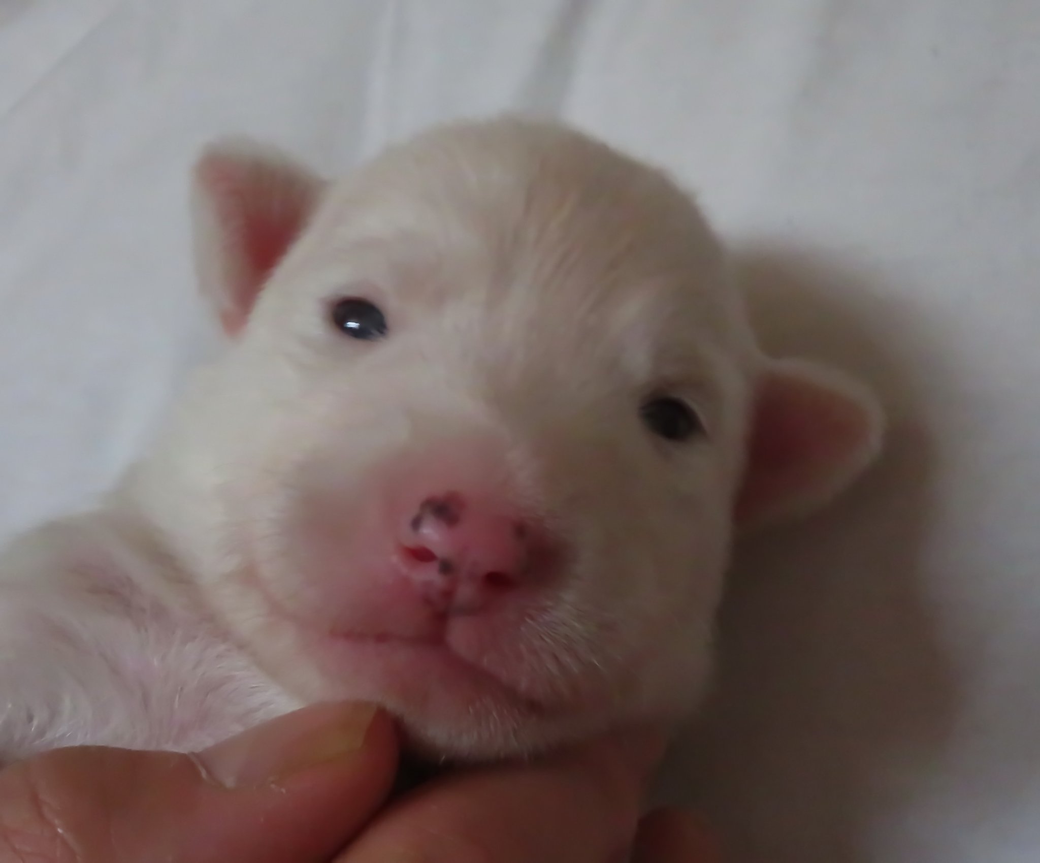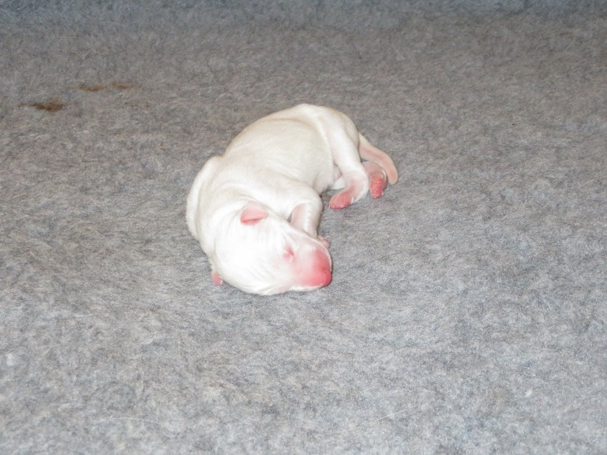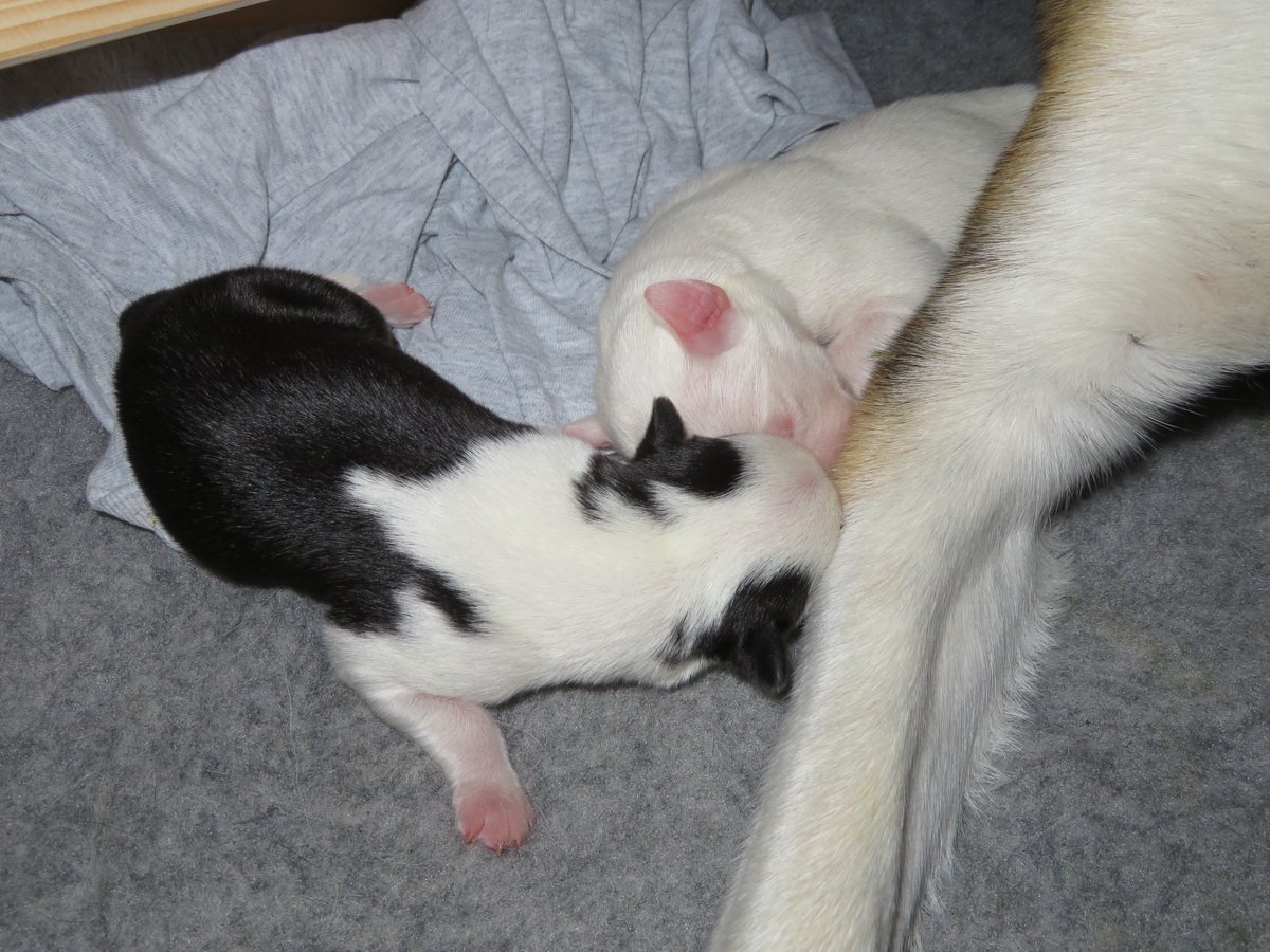 Nach der positiven Röntgendiagnose ging es dann sehr schnell, denn obwohl schon der 60. Tag bevor stand, rechnete ich insgeheim doch mit ein Paar Tagen Verzug aufgrund der Eisprungthematik. Aber weit gefehlt, am 3.7.2019, am 61. Tag nach dem ersten Decktermin, kam um 14:48 Uhr Nr. 1, eine schneeweiße Hündin auf die Welt.