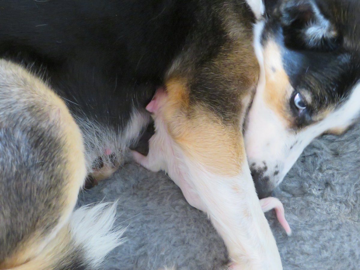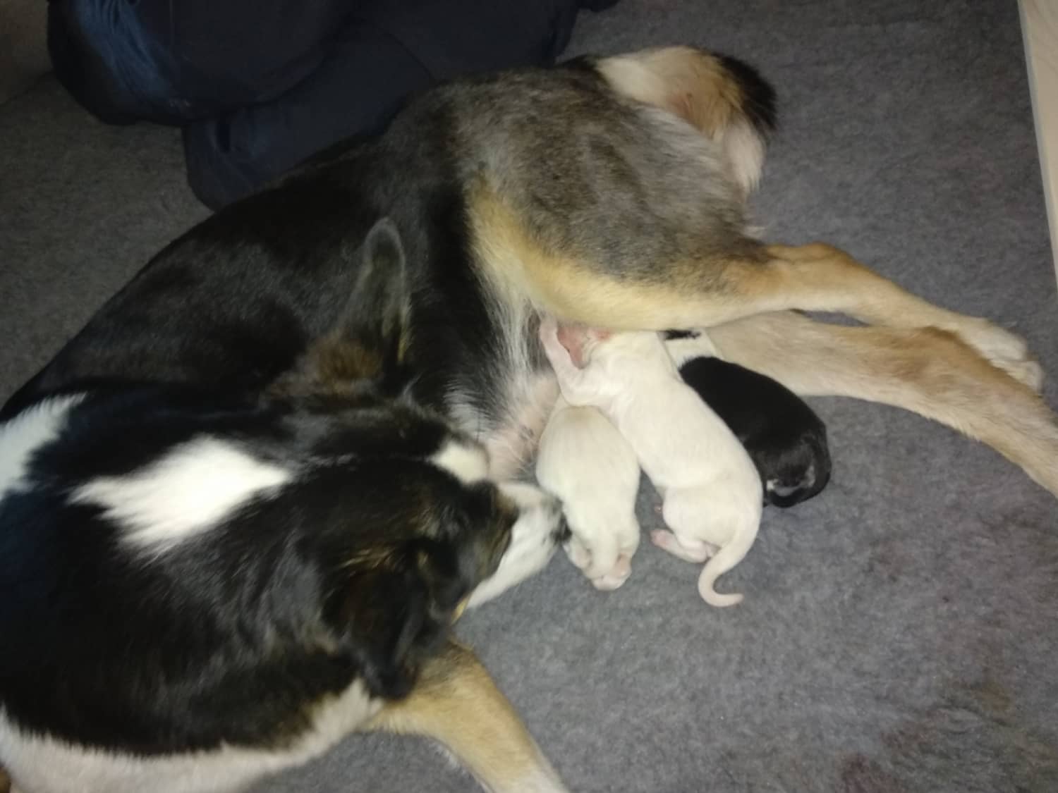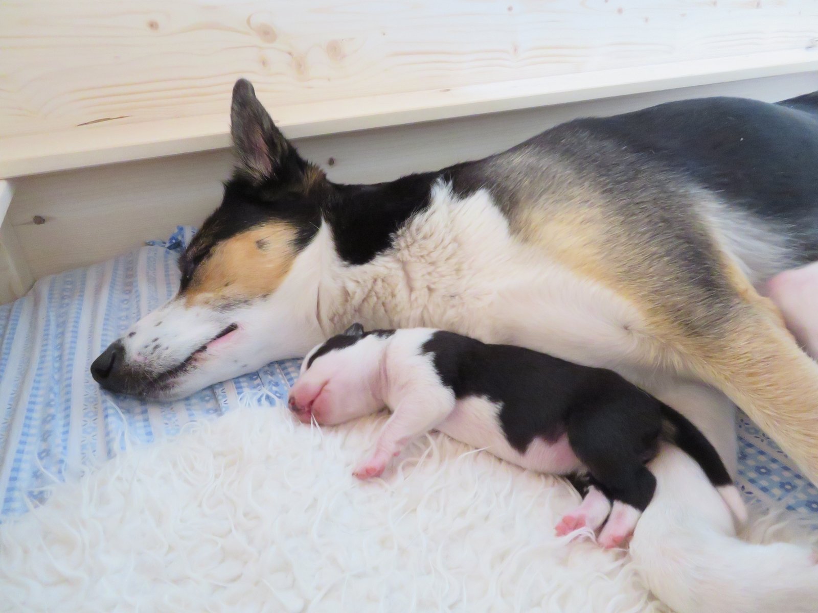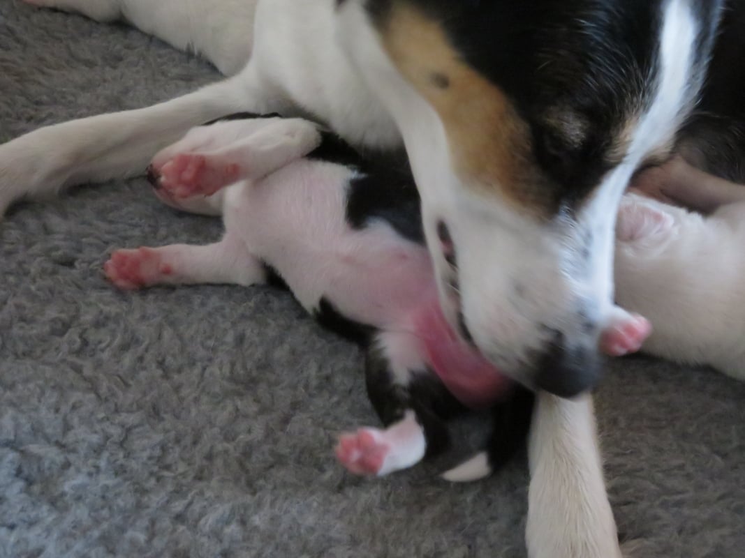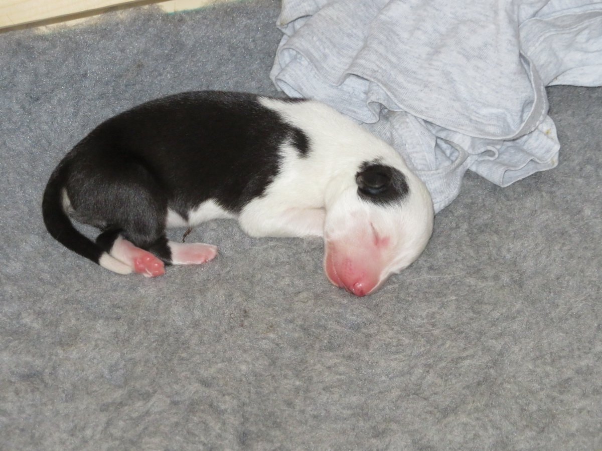 Nach der positiven Röntgendiagnose ging es dann sehr schnell, denn obwohl schon der 60. Tag bevor stand, rechnete ich insgeheim doch mit ein Paar Tagen Verzug aufgrund der Eisprungthematik. Aber weit gefehlt, am 3.7.2019, am 61. Tag nach dem ersten Decktermin, kam um 14:48 Uhr Nr. 1, eine schneeweiße Hündin auf die Welt.