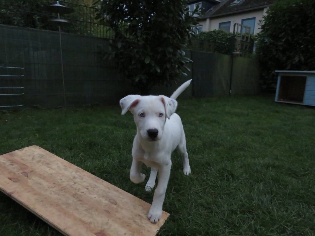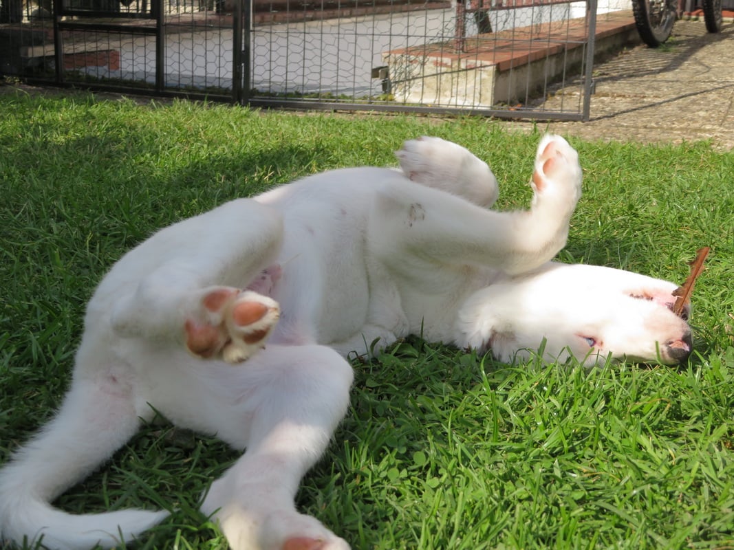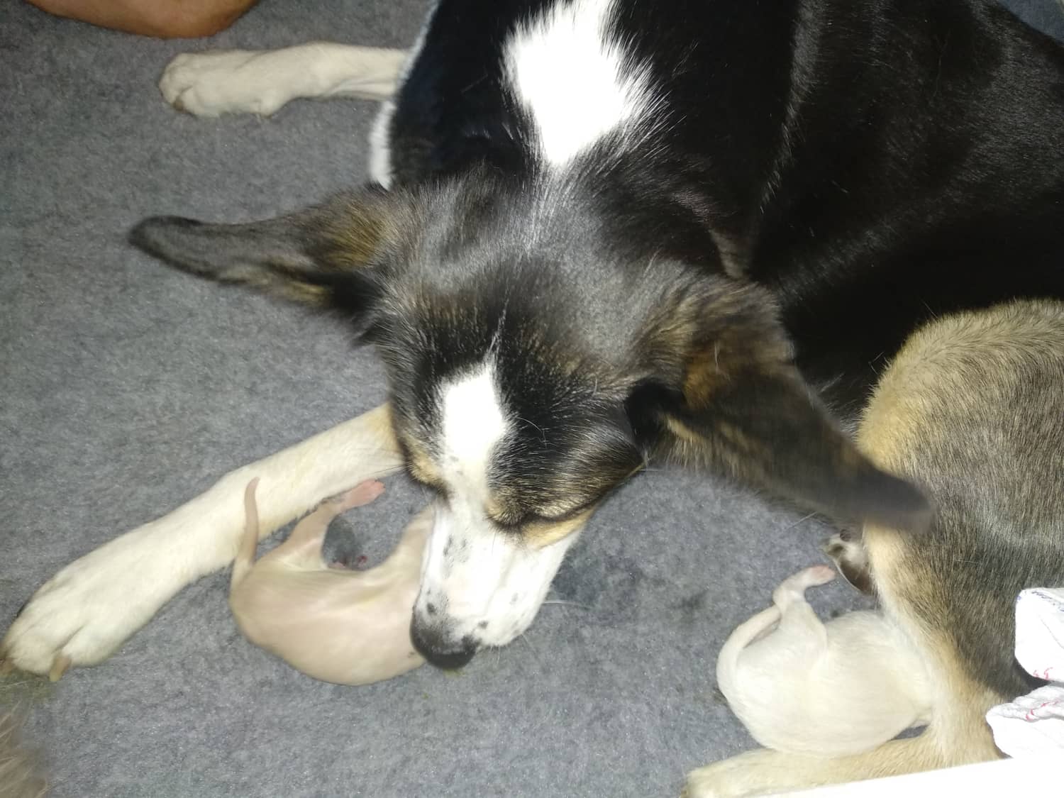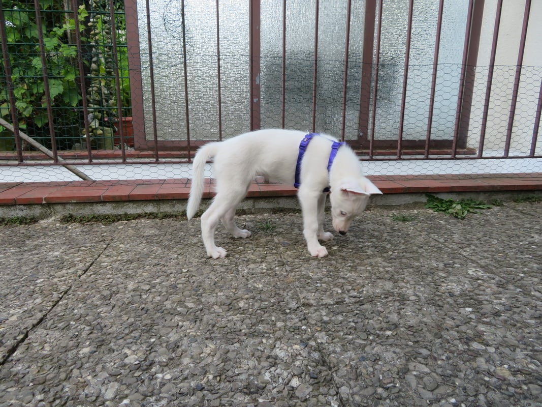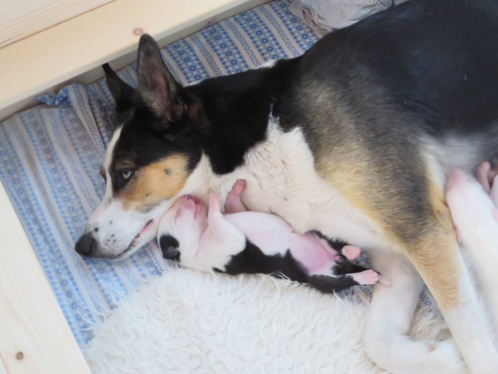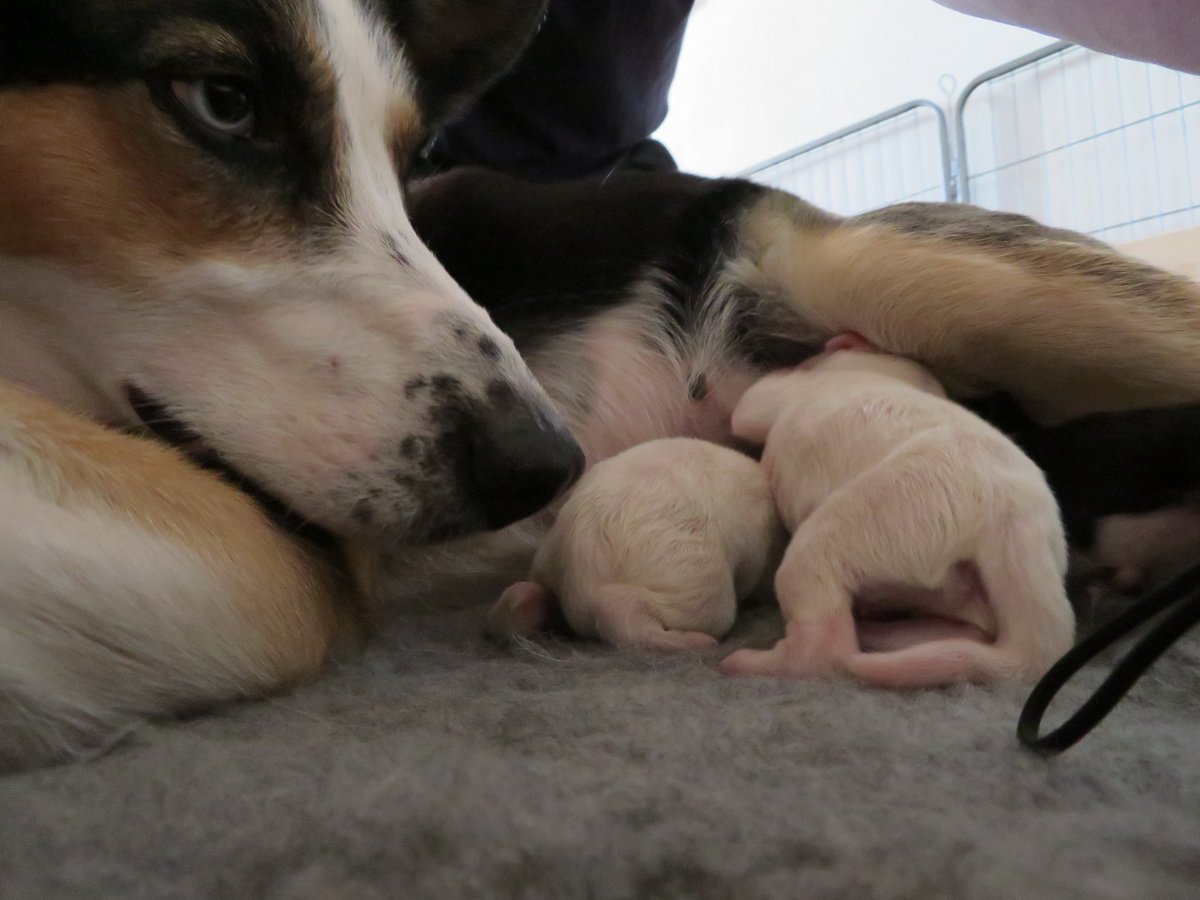 Nach der positiven Röntgendiagnose ging es dann sehr schnell, denn obwohl schon der 60. Tag bevor stand, rechnete ich insgeheim doch mit ein Paar Tagen Verzug aufgrund der Eisprungthematik. Aber weit gefehlt, am 3.7.2019, am 61. Tag nach dem ersten Decktermin, kam um 14:48 Uhr Nr. 1, eine schneeweiße Hündin auf die Welt.