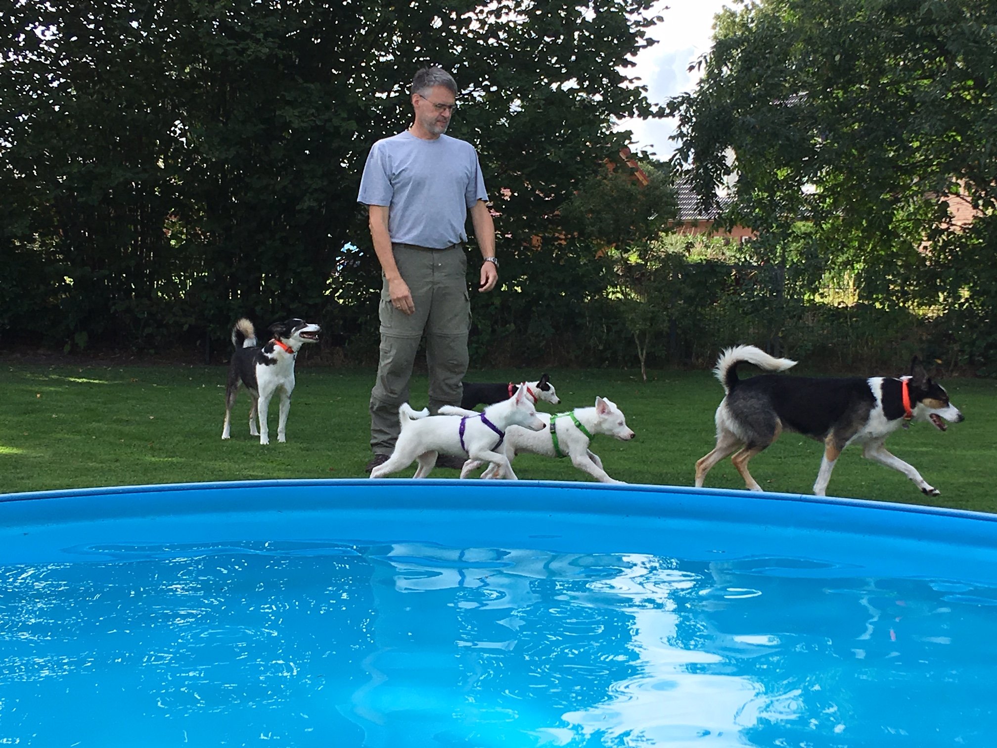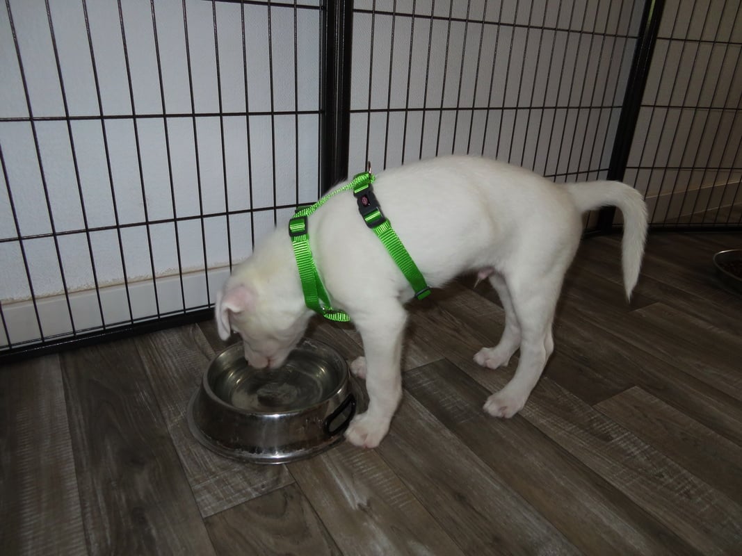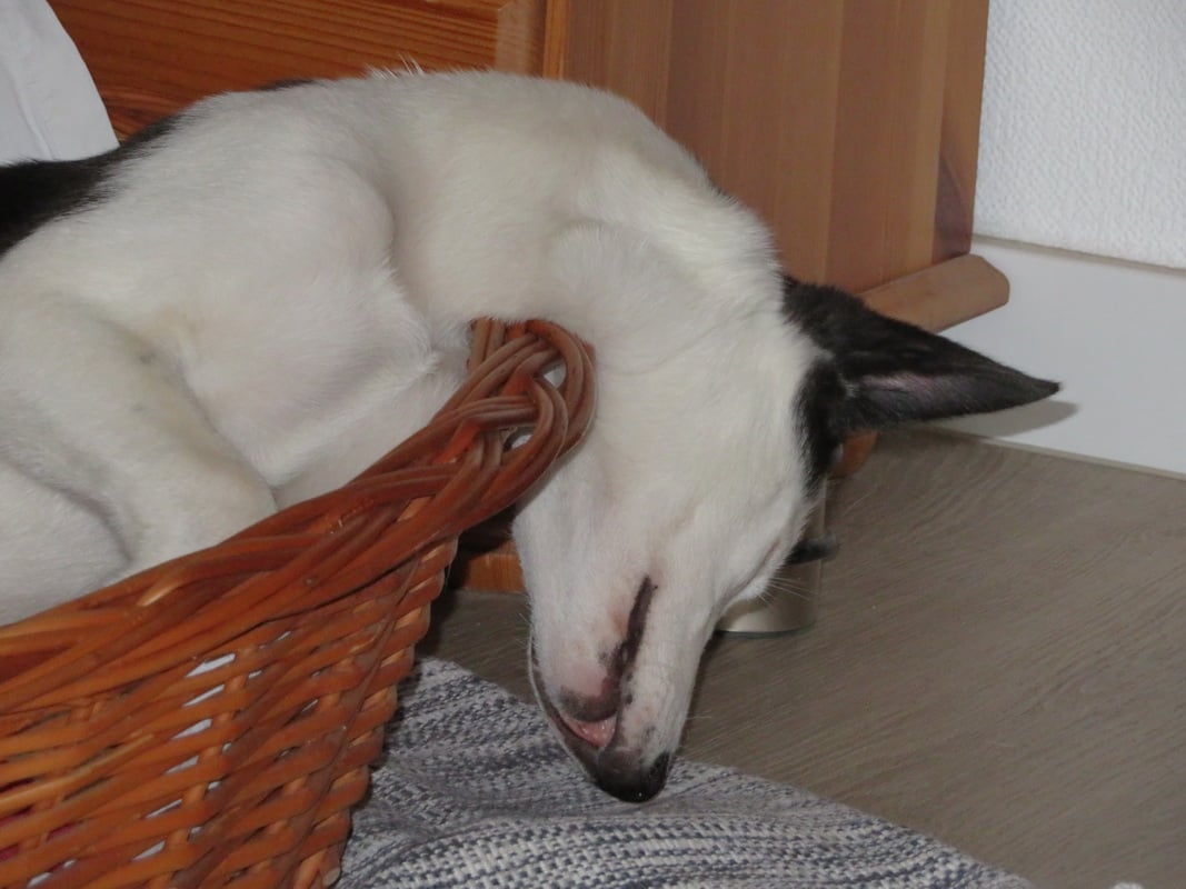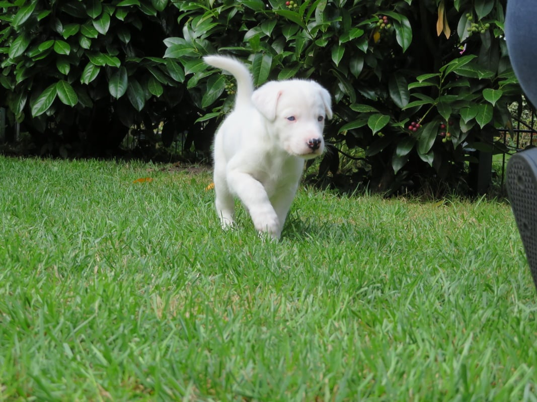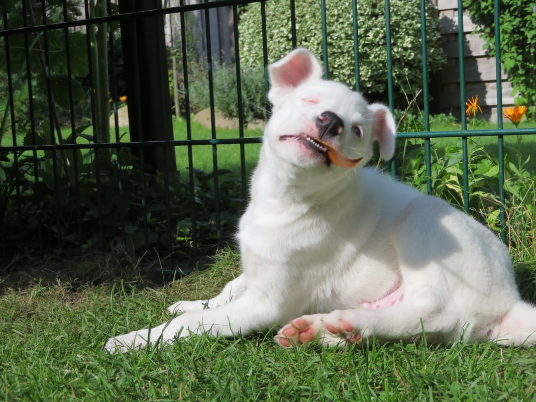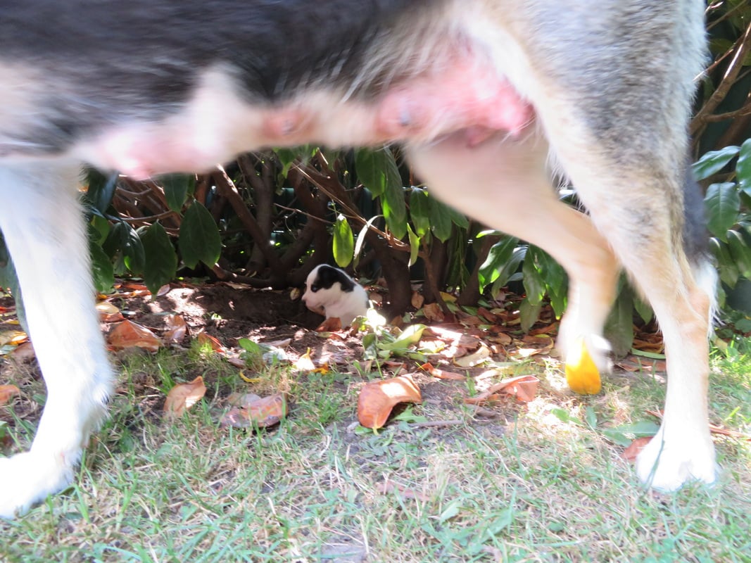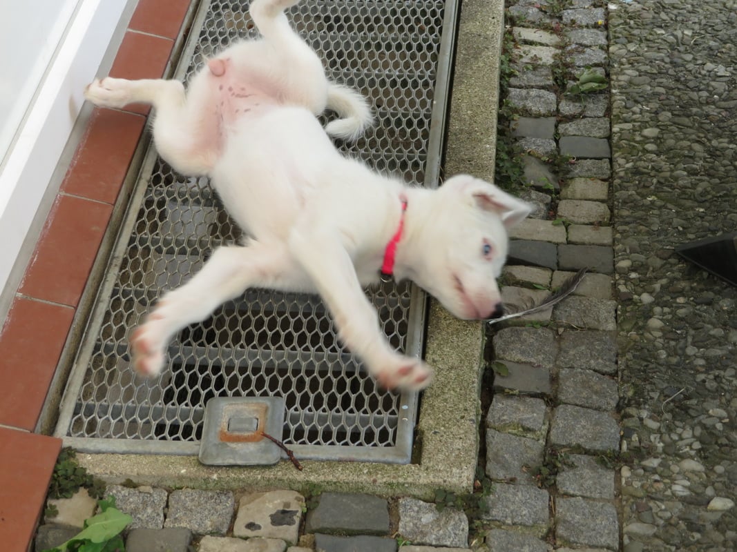 Nach der positiven Röntgendiagnose ging es dann sehr schnell, denn obwohl schon der 60. Tag bevor stand, rechnete ich insgeheim doch mit ein Paar Tagen Verzug aufgrund der Eisprungthematik. Aber weit gefehlt, am 3.7.2019, am 61. Tag nach dem ersten Decktermin, kam um 14:48 Uhr Nr. 1, eine schneeweiße Hündin auf die Welt.