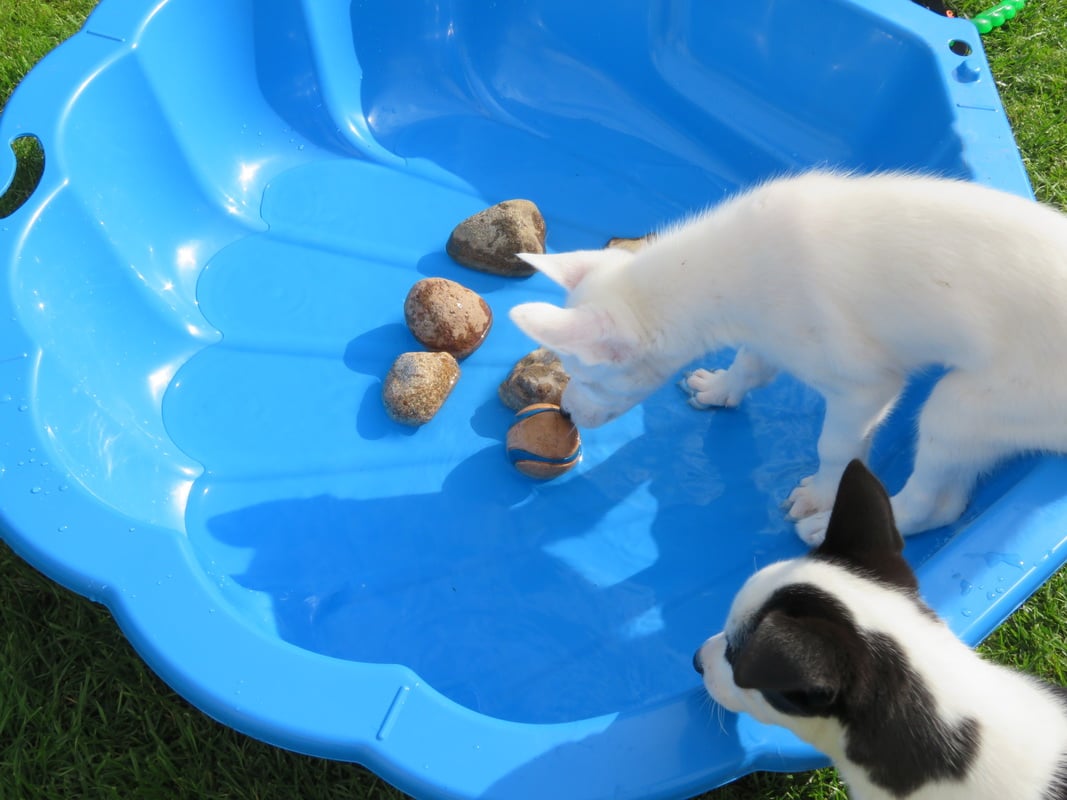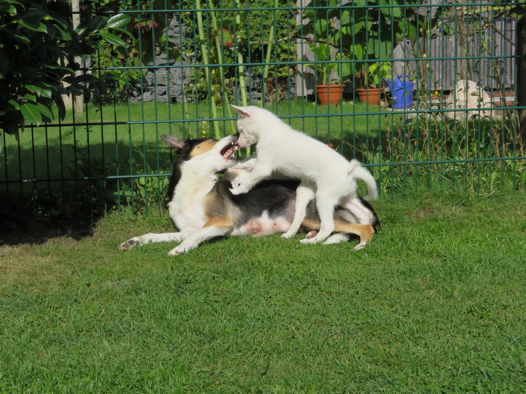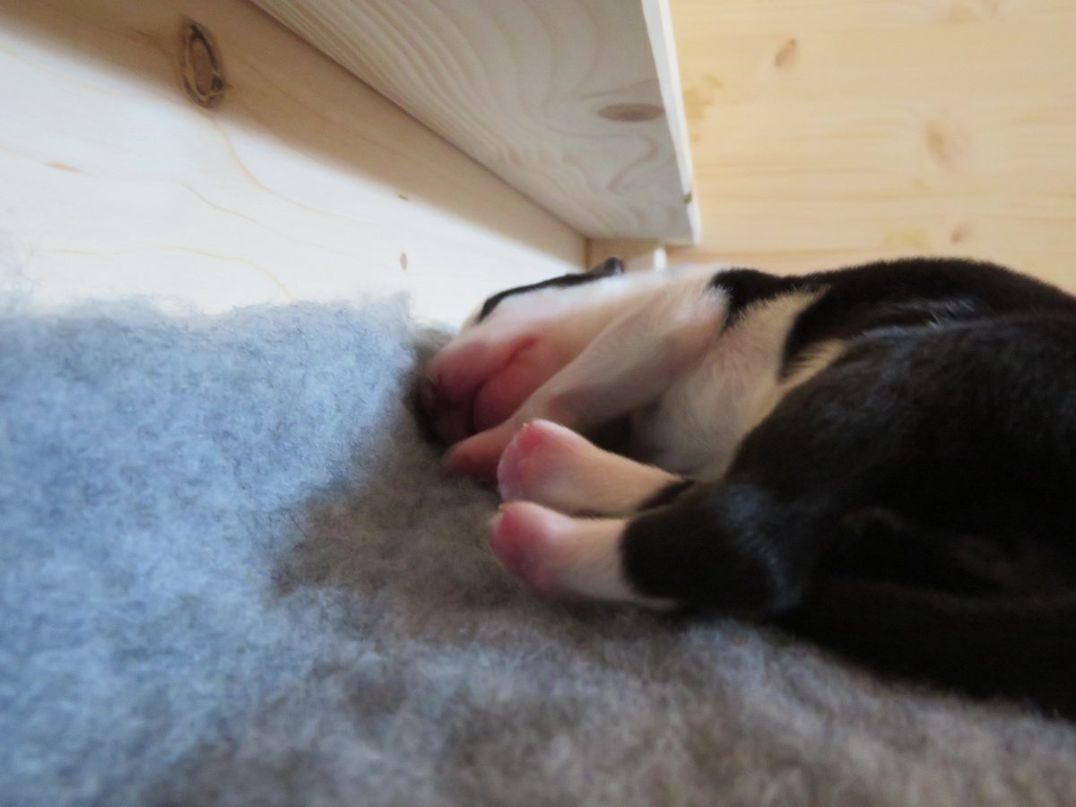 Sie sind groß geworden. Seit heute, 21.Juli 2019, haben sie die 2 kg-Marke überschritten und erste Milchzahn-Ansätze sind fühl- und sichtbar. Zudem haben sie heute erstmals die Box herverlassen und das nahe Umfeld erkundet. Arik quengelte wie immer drum, Frosty war noch etwas unentschlossen und Smacks hat diesen Part bereits wieder verschlafen und war in die Box zurückgekehrt.