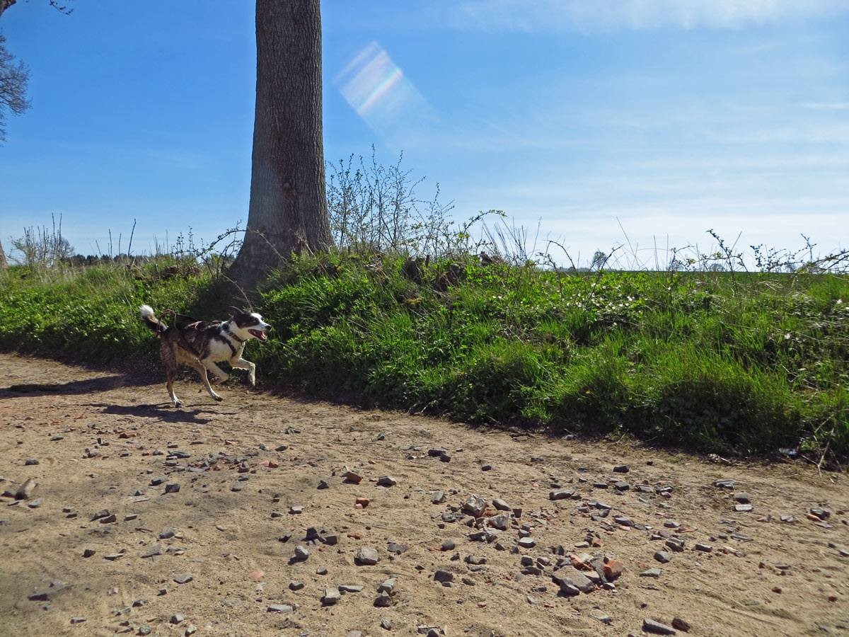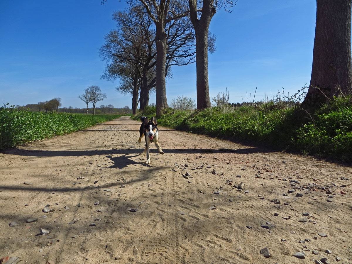 Nach wie vor sind Rehe für Sitka keinen Aufreger wert. Im folgenden Video sieht man rechts hinten auf dem Weg, dort wo dieser nach rechts abbiegt, wie ein Reh (zugegeben etwas klein) rechts im Knick verschwindet. Wenige Sekunden später ist Sitka an der Stelle und ignoriert den Wildkontakt völlig. Nicht einmal der Kopf bewegt dorthin, wo gerade noch das Reh war.