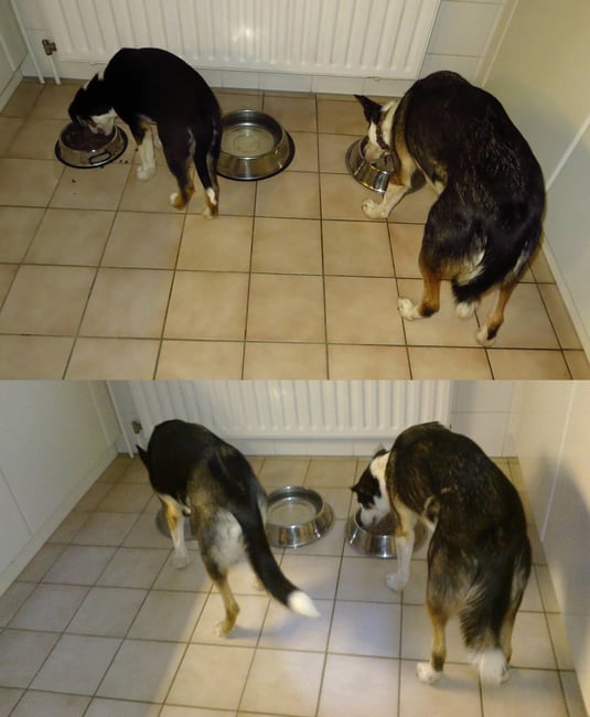 Auf den Tag genau zwei Jahre liegen zwischen den beiden Bildern. Ayla (links) und Sitka in 2015 (oben) und 2017. Damals wie heute fressen sie einträchtig nebeneinander und schlecken sich gegenseitig nach der Mahlzeit noch die Näpfe sauber. Bleibt so wie ihr seid, meine beiden Doggies!